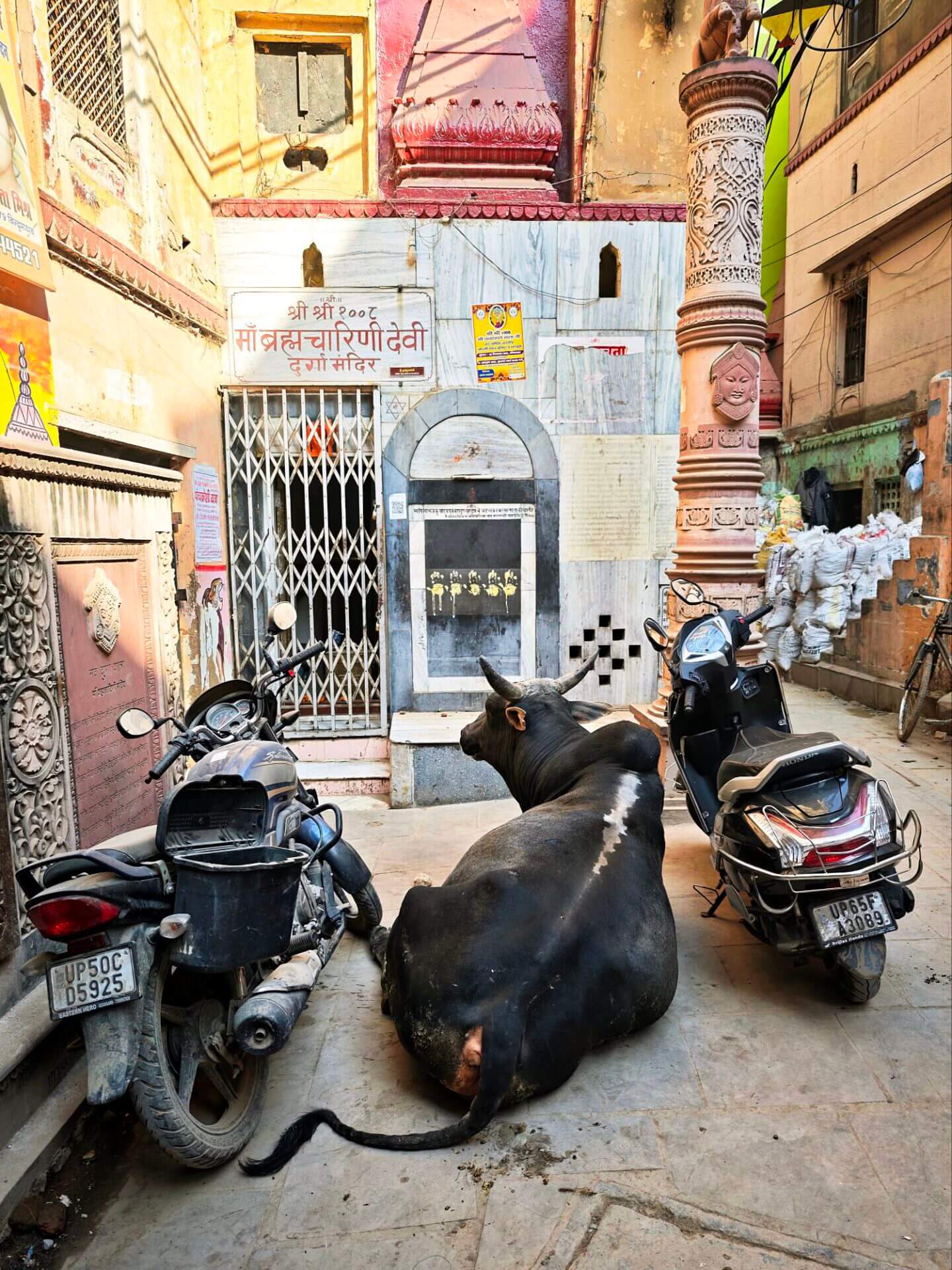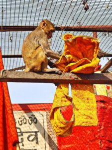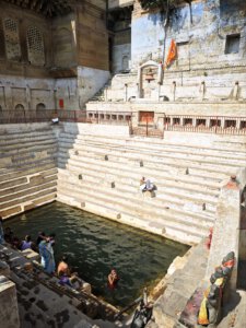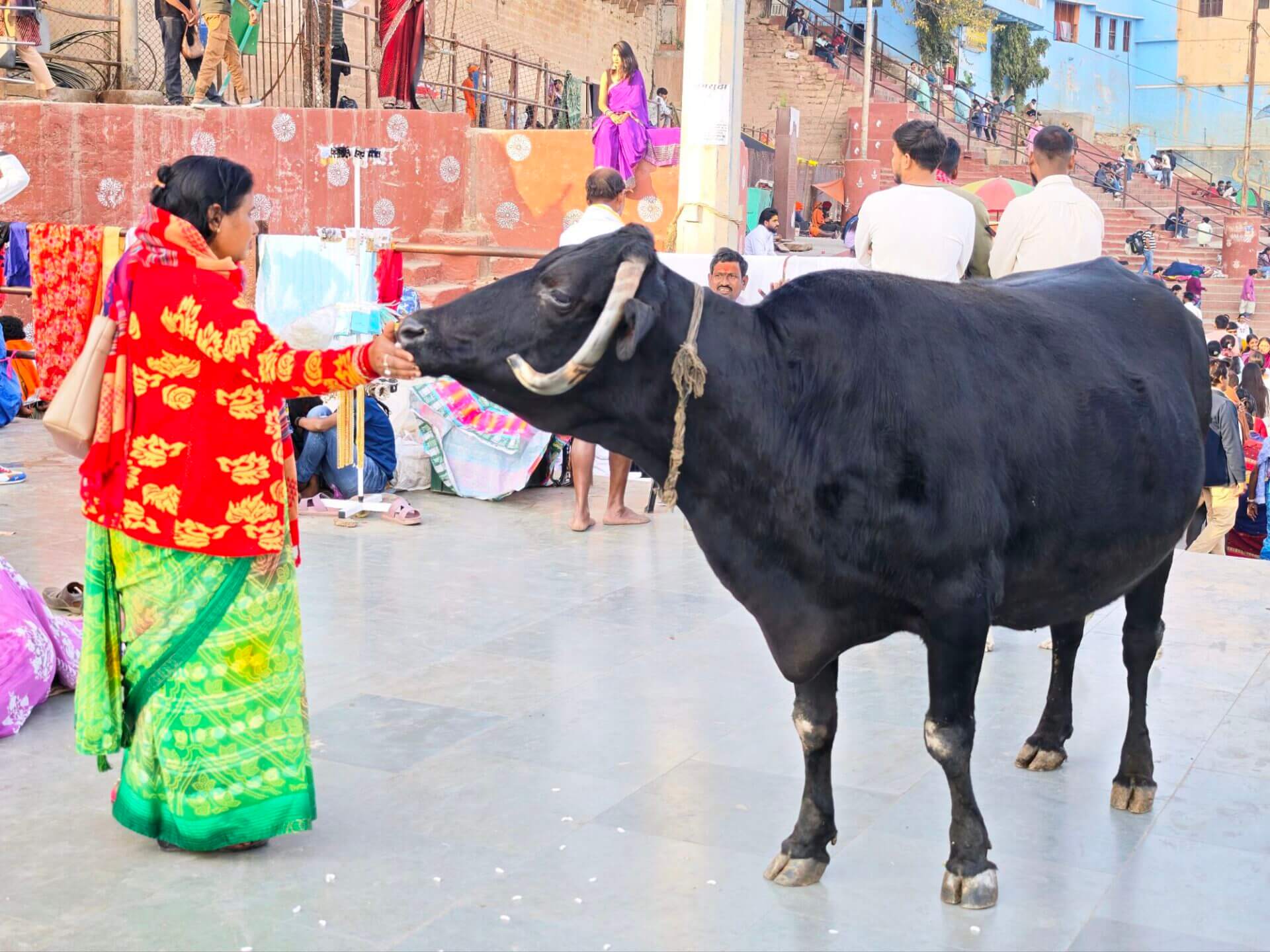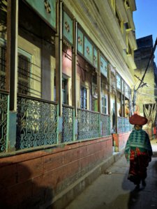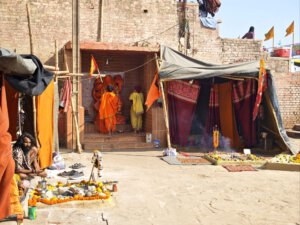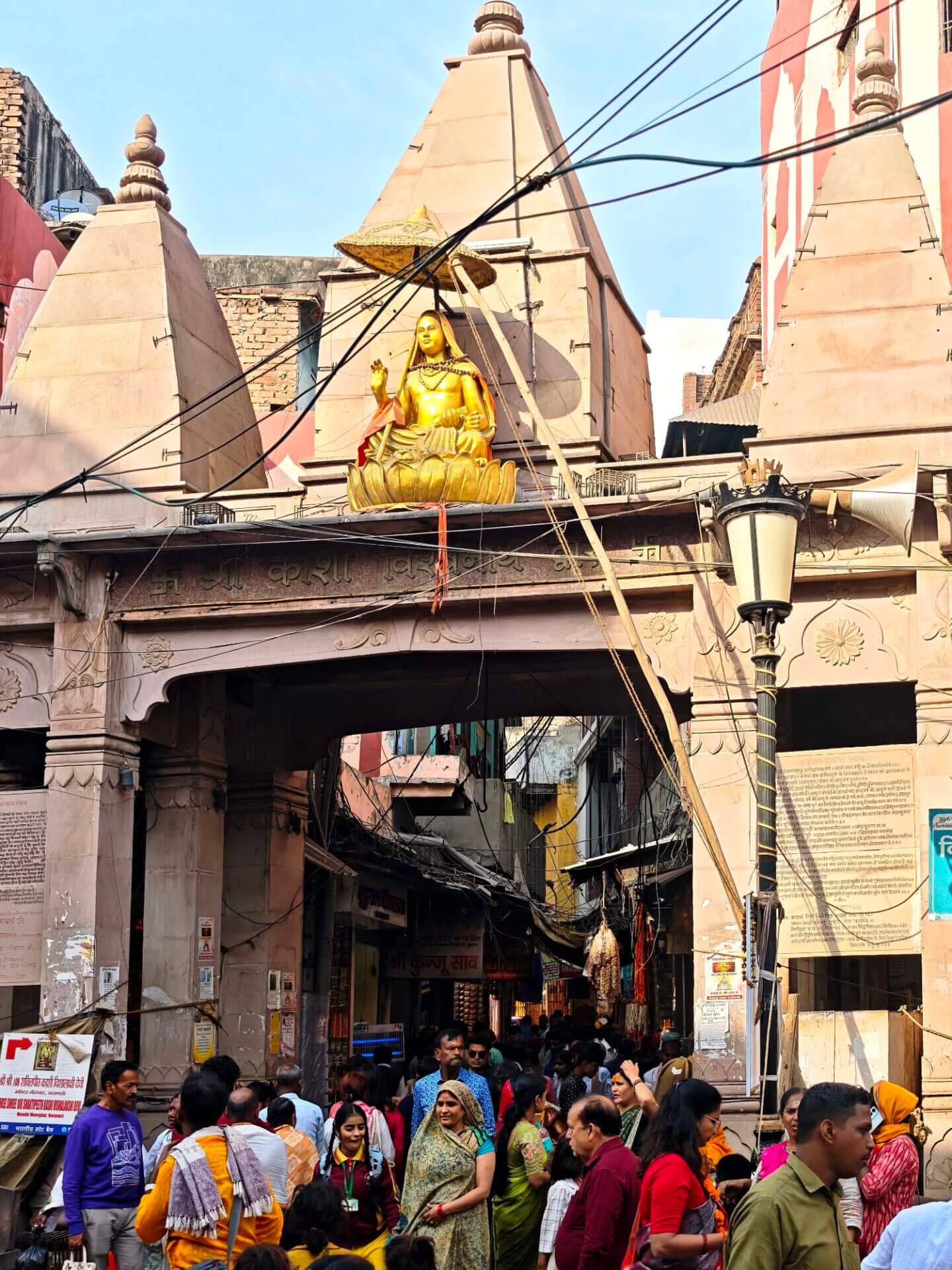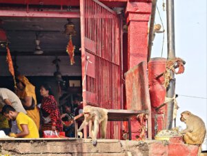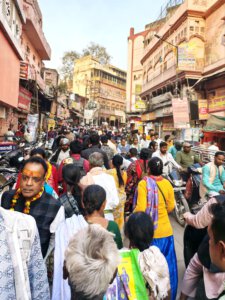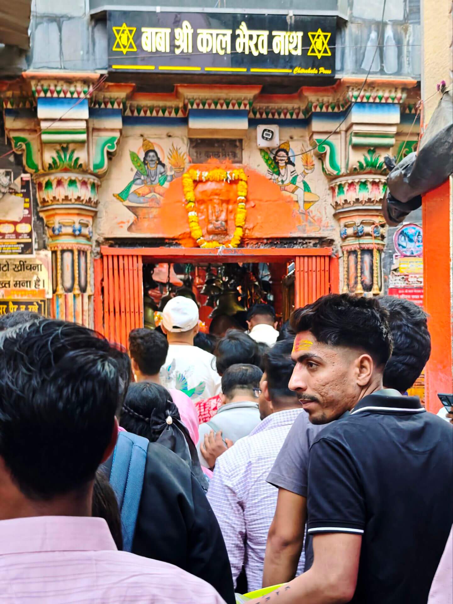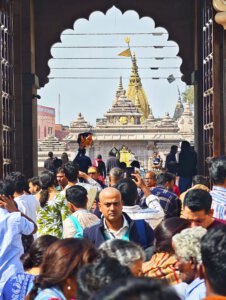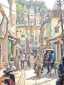 iIn der Hierarchie danach kommen der Annapurna Devi und der Kal Bhairav Tempel. Während der, der Frau und Versorgerin Shivas gewidmete Tempel im Inneren überraschend weitläufig und farbenfroh ist, ist der, dem zerstörerischen Aspekt Shivas gewidmete, dunkel und tatsächlich furchteinflösend eng. Das Drängen der Massen durch die engen Gassen, die Zugang gewähren, ist vor beiden Tempeln gleich. Rom im heiligen Jahr 2025 ( >> Franziskusweg) war, verglichen mit diesem ganz normalen Tag im Februar in Varanasi, Kindergeburtstag.