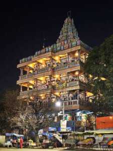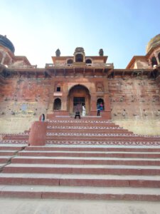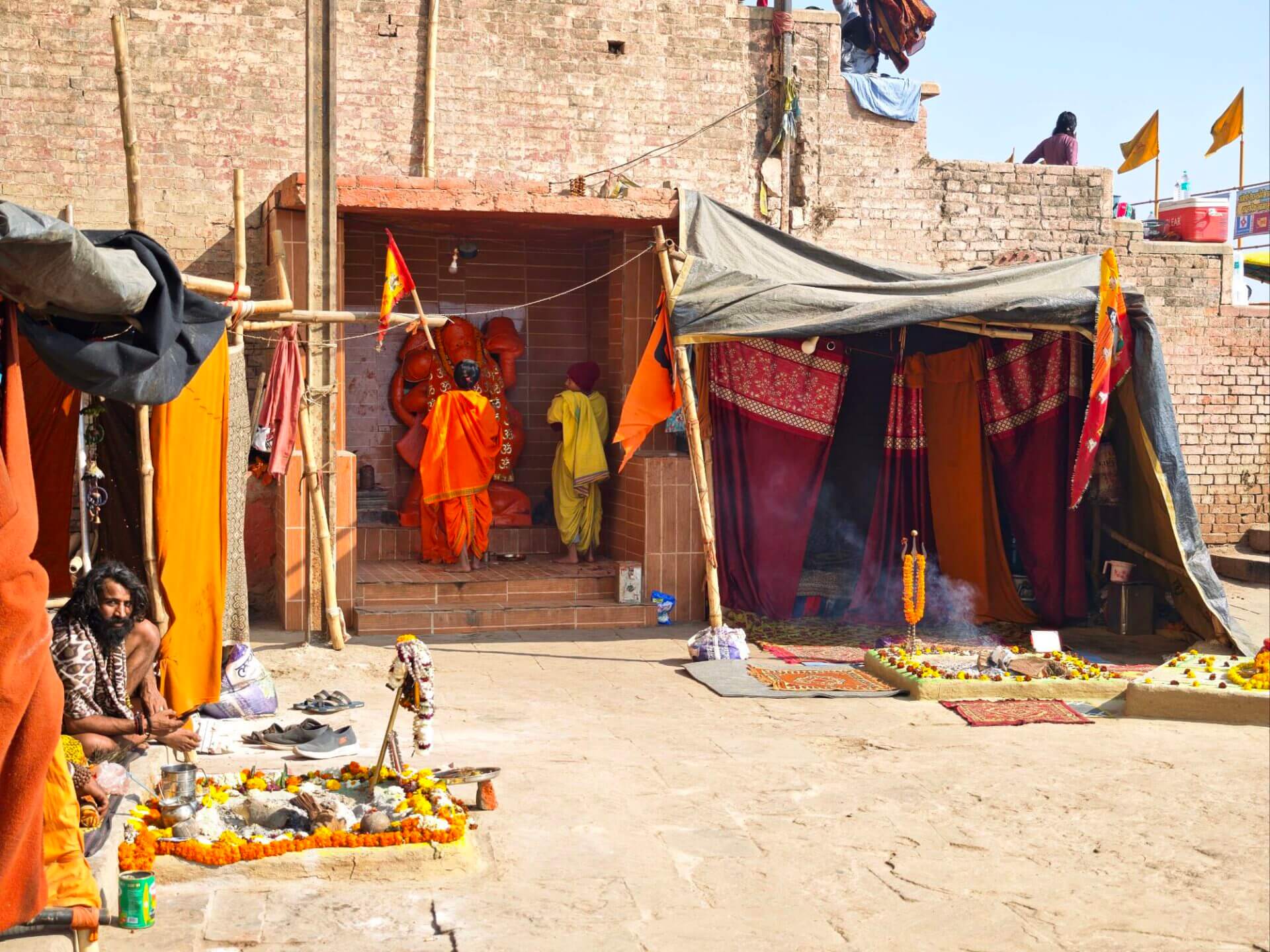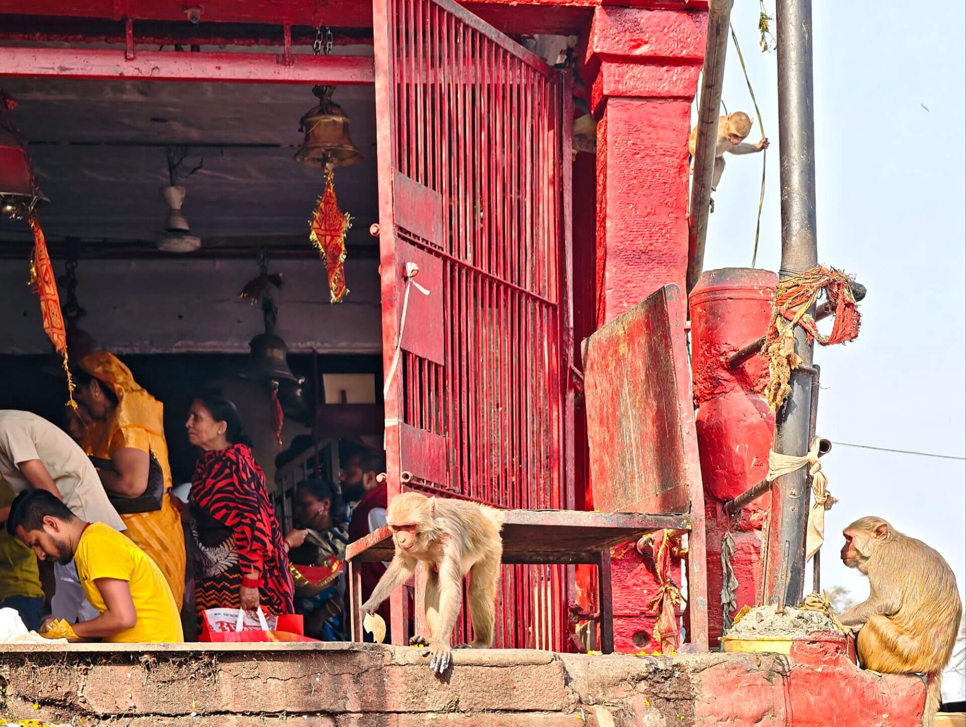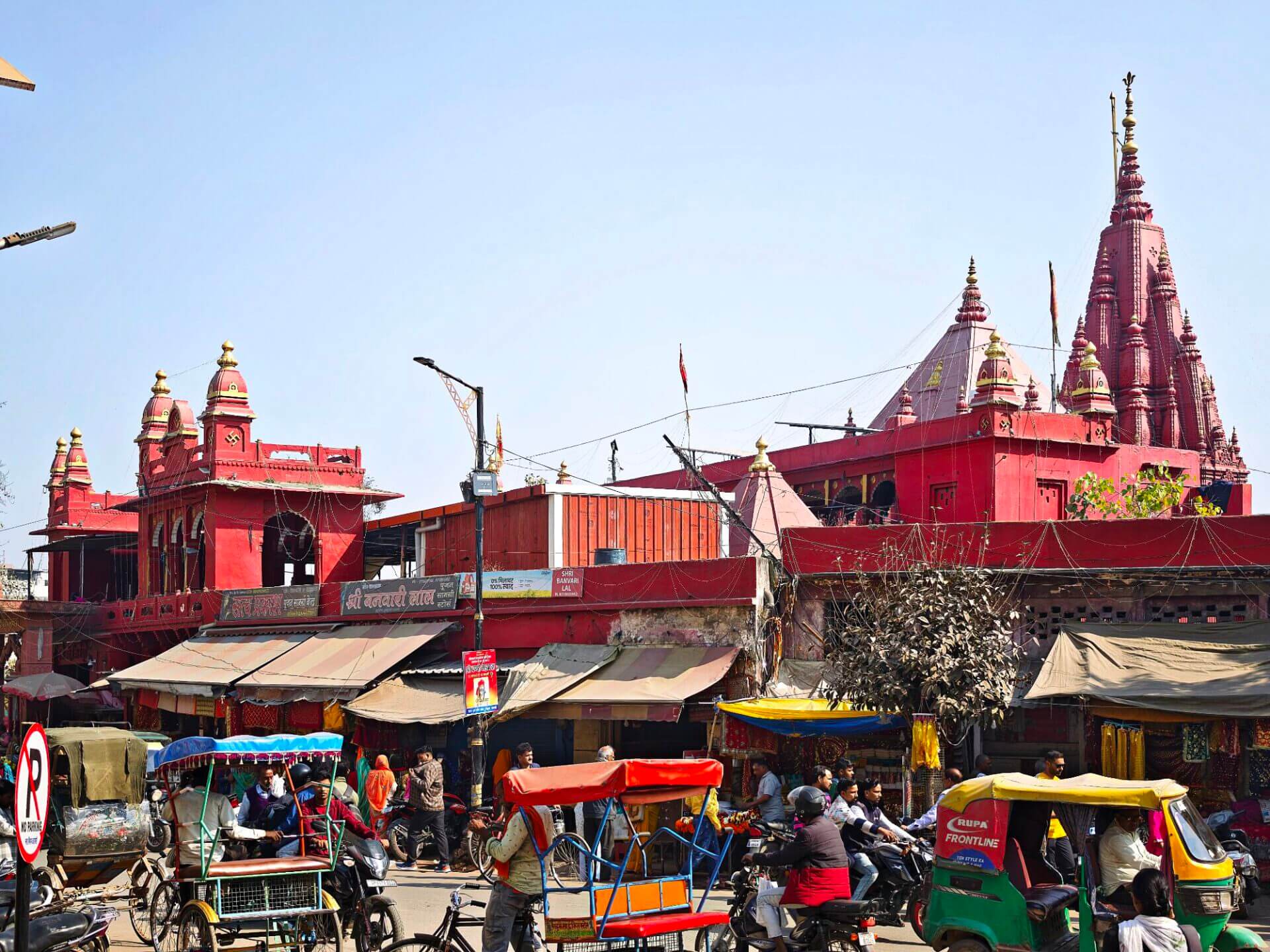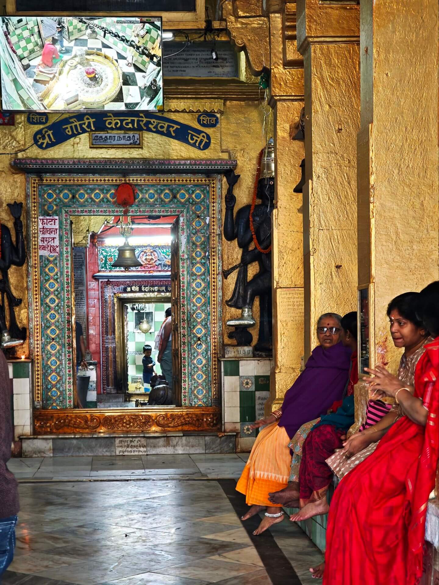 iIn der Hierarchie danach kommen der Annapurna Devi und der Kal Bhairav Tempel. Während der, der Frau und Versorgerin Shivas gewidmete Tempel im Inneren überraschend weitläufig und farbenfroh ist, ist der, dem zerstörerischen Aspekt Shivas gewidmete, dunkel und tatsächlich furchteinflösend eng. Das Drängen der Massen durch die engen Gassen, die Zugang gewähren, ist vor beiden Tempeln gleich. Rom im heiligen Jahr 2025 ( >> Franziskusweg) war, verglichen mit diesem ganz normalen Tag im Februar in Varanasi, Kindergeburtstag.