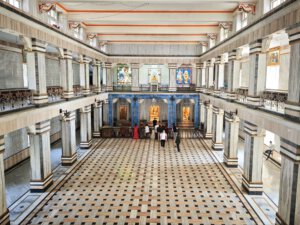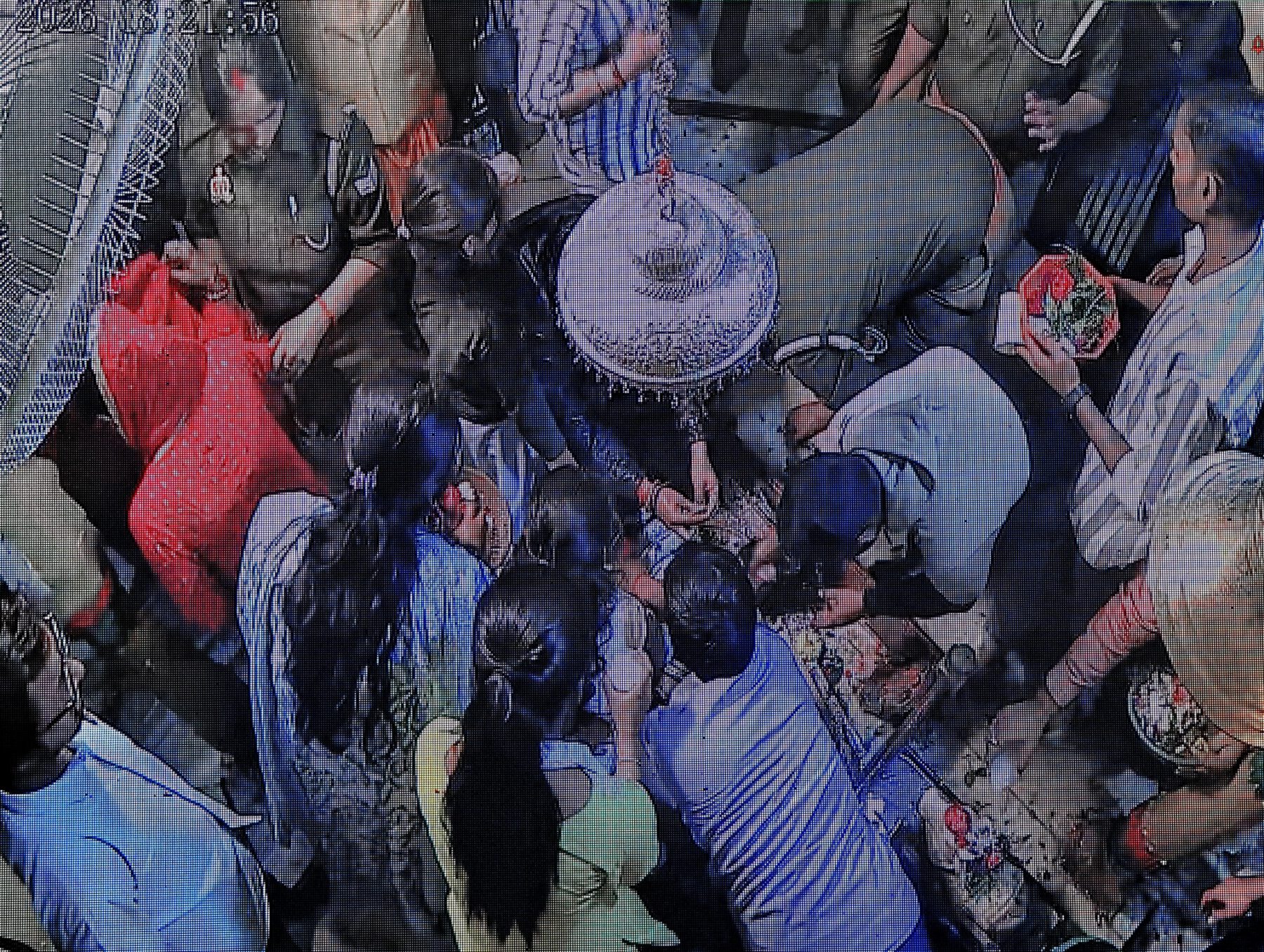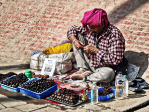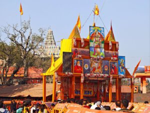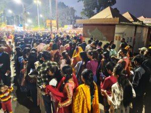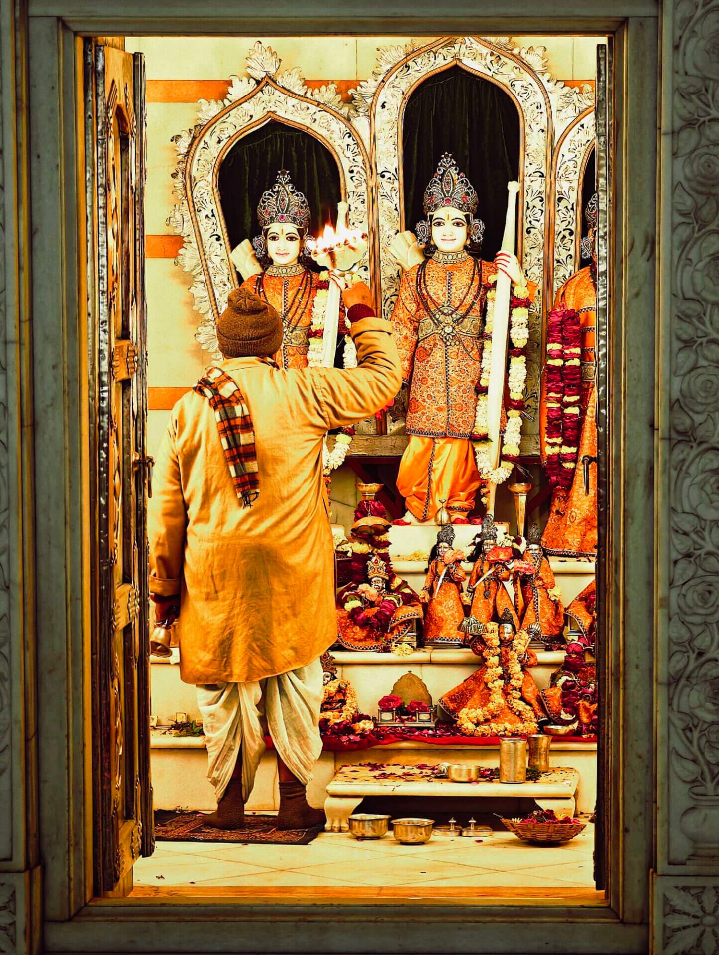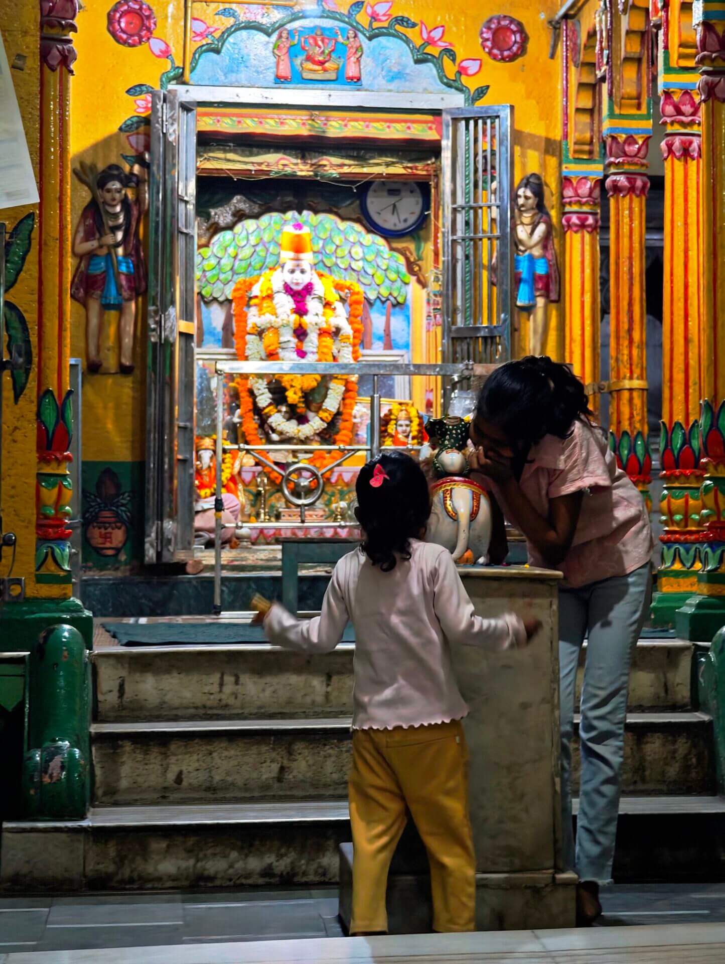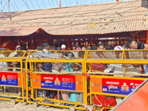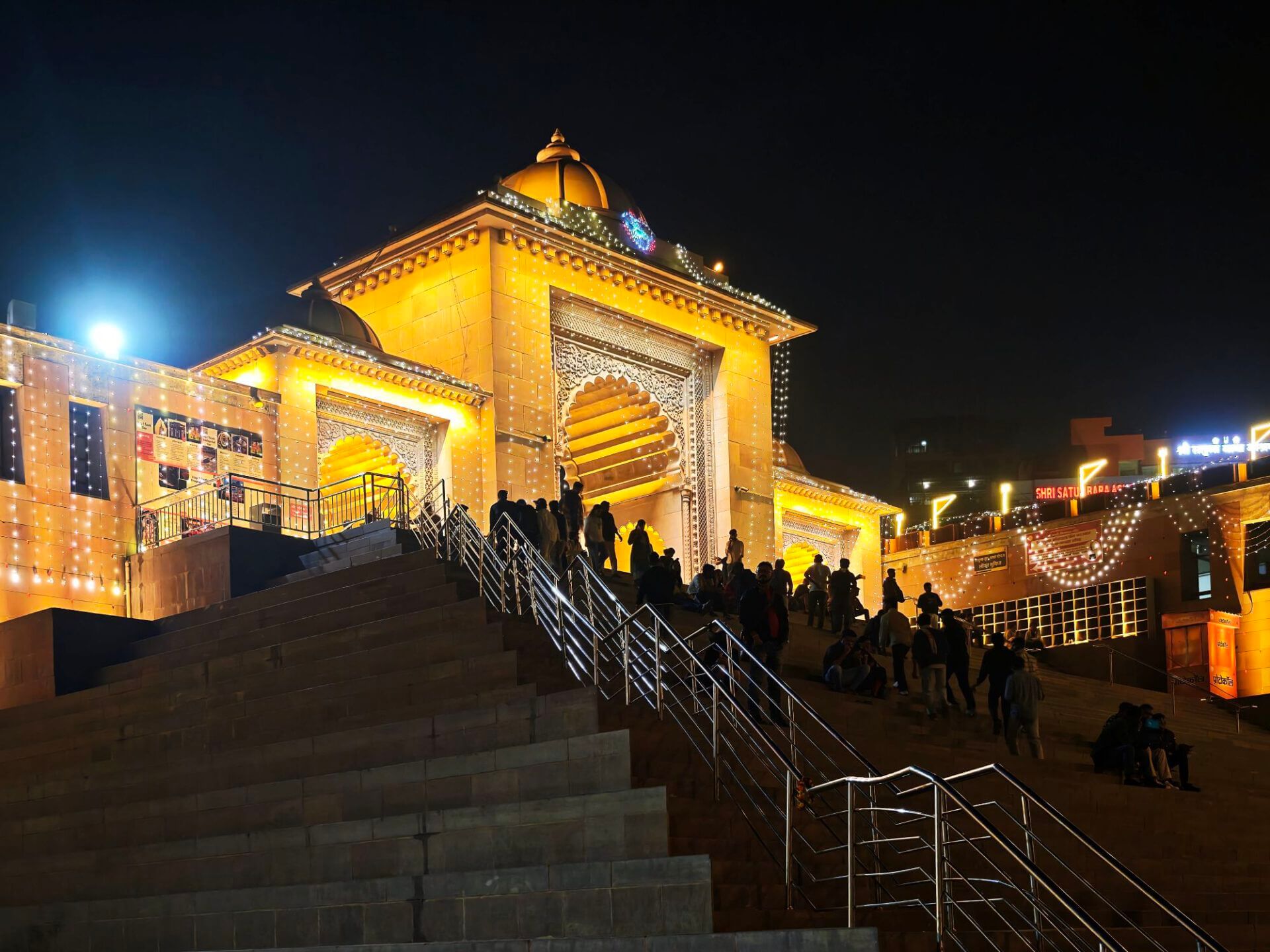 iIn der Hierarchie danach kommen der Annapurna Devi und der Kal Bhairav Tempel. Während der, der Frau und Versorgerin Shivas gewidmete Tempel im Inneren überraschend weitläufig und farbenfroh ist, ist der, dem zerstörerischen Aspekt Shivas gewidmete, dunkel und tatsächlich furchteinflösend eng. Das Drängen der Massen durch die engen Gassen, die Zugang gewähren, ist vor beiden Tempeln gleich. Rom im heiligen Jahr 2025 ( >> Franziskusweg) war, verglichen mit diesem ganz normalen Tag im Februar in Varanasi, Kindergeburtstag.
