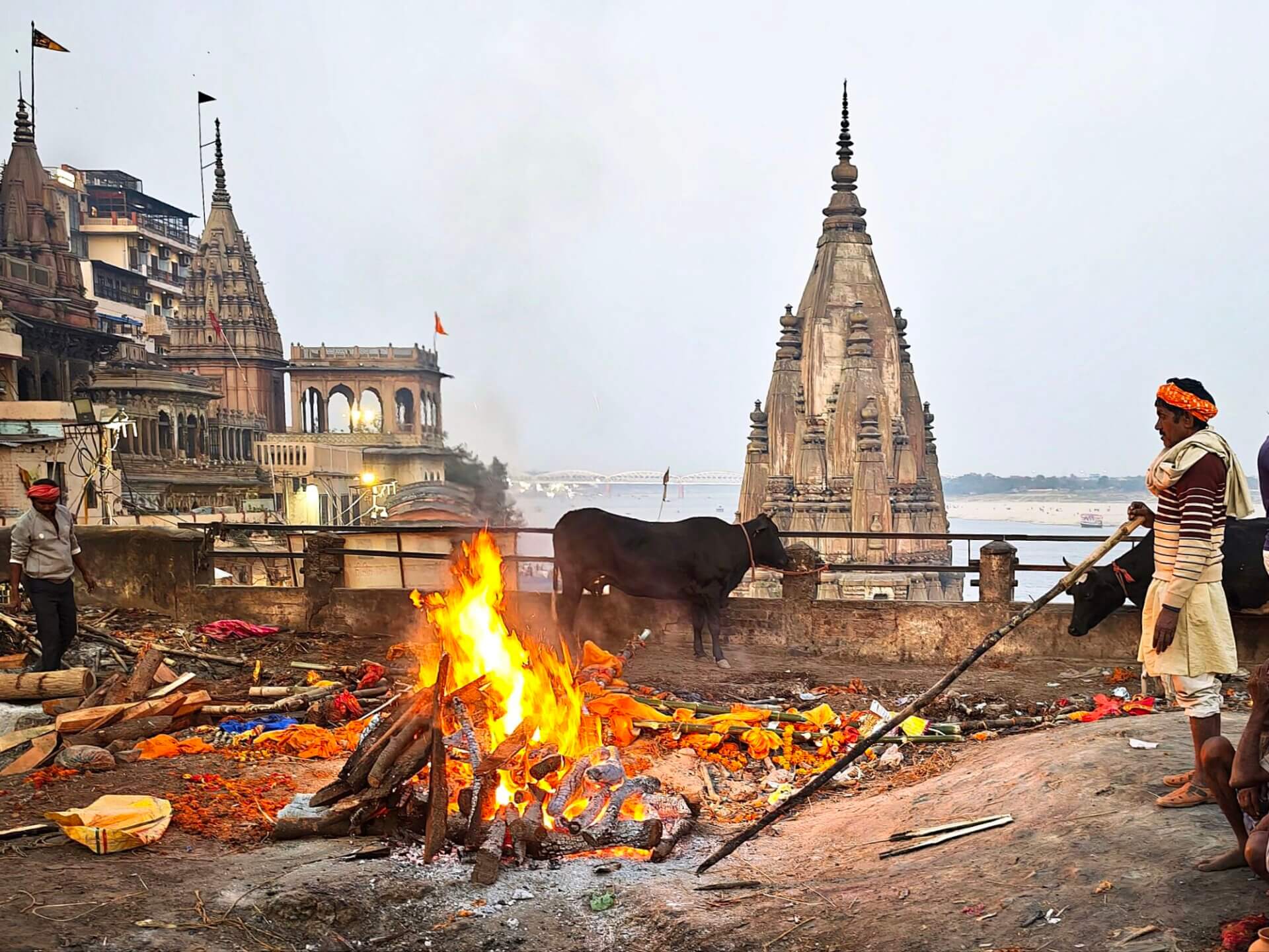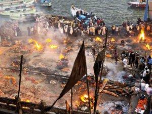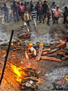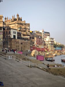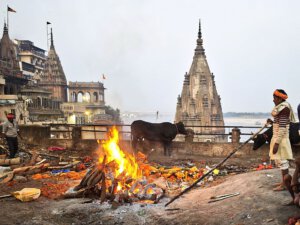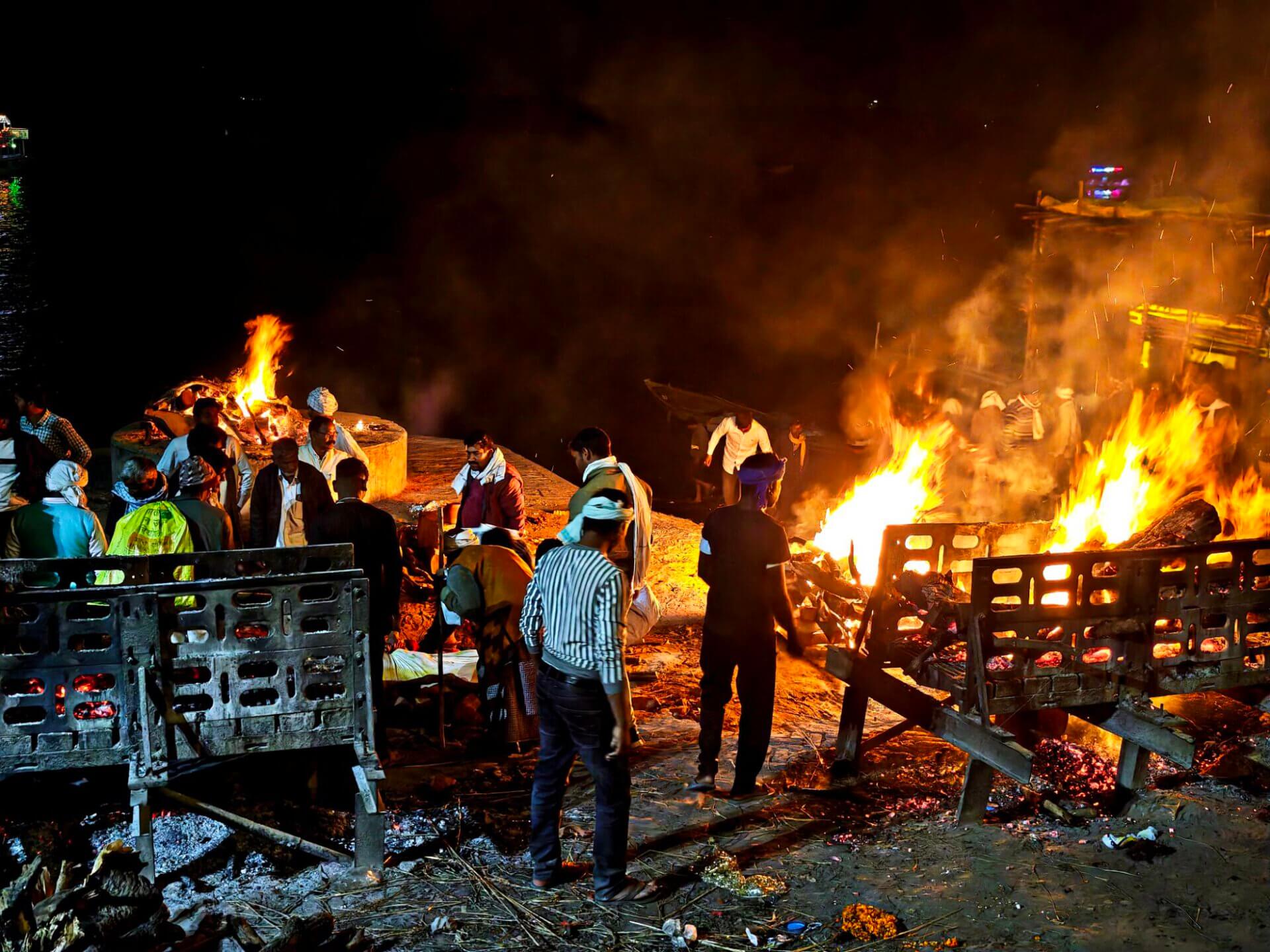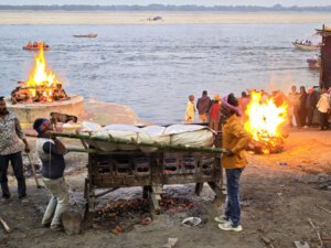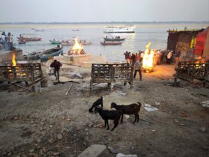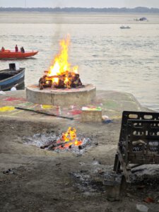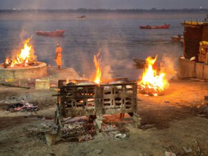 In Varanasi zu sterben, dort am Ganges verbrannt und als Asche dem Fluß übergeben zu werden, gilt im Hinduismus als Möglichkeit den Kreislauf der Wiedergeburten zu verlassen. Die Feuer brennen an zwei Ghats Tag und Nacht. Den Ritualen ausführlich zu folgen macht sprachlos. Fotografieren ist grenzwertig. Gleichzeitig wirkt alles offen und alltäglich: Am Harishchandra Ghat lassen lachende Kinder neben den Feuern einen Drachen steigen. Die Blechwände am Manikarnika Ghat sollen offenbar nicht die Verbrennungen sondern die daneben liegenden Baustellen abschirmen. Der Tod wird als normaler Teil des Lebens betrachtet und nicht als Ende sondern als Übergang verstanden.