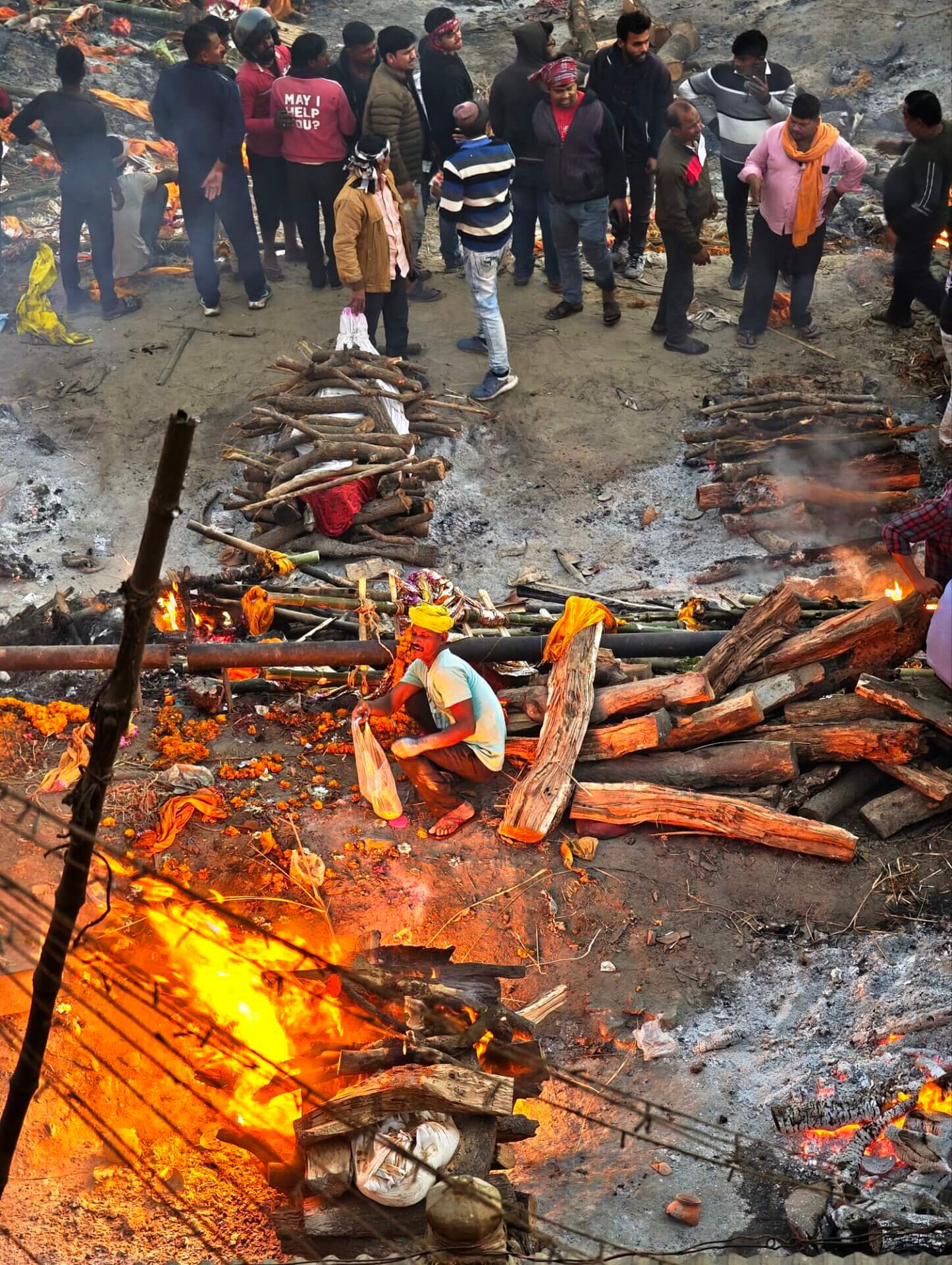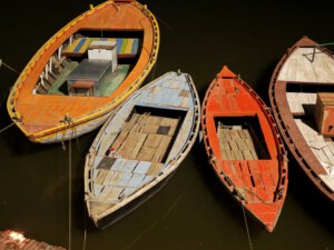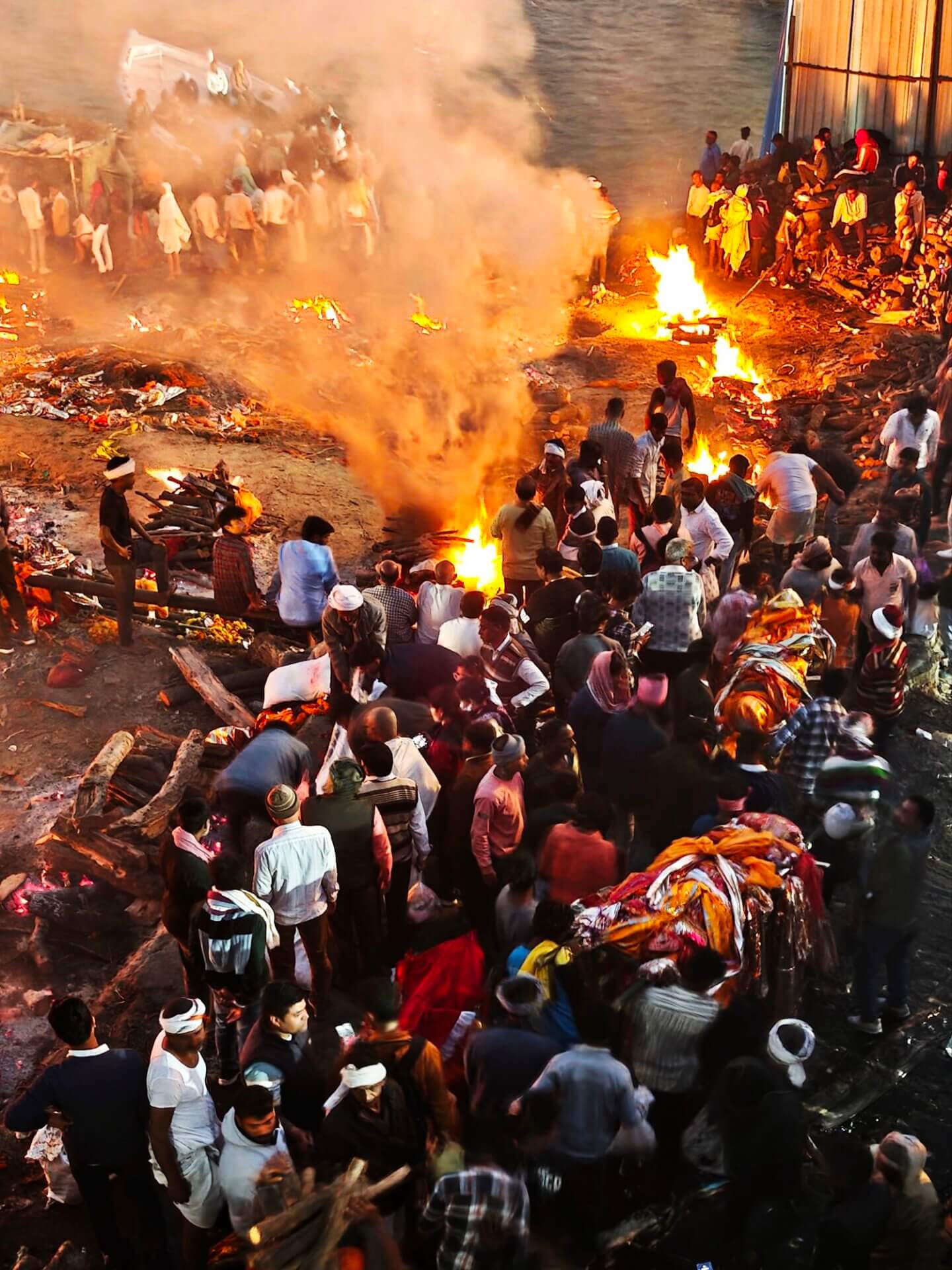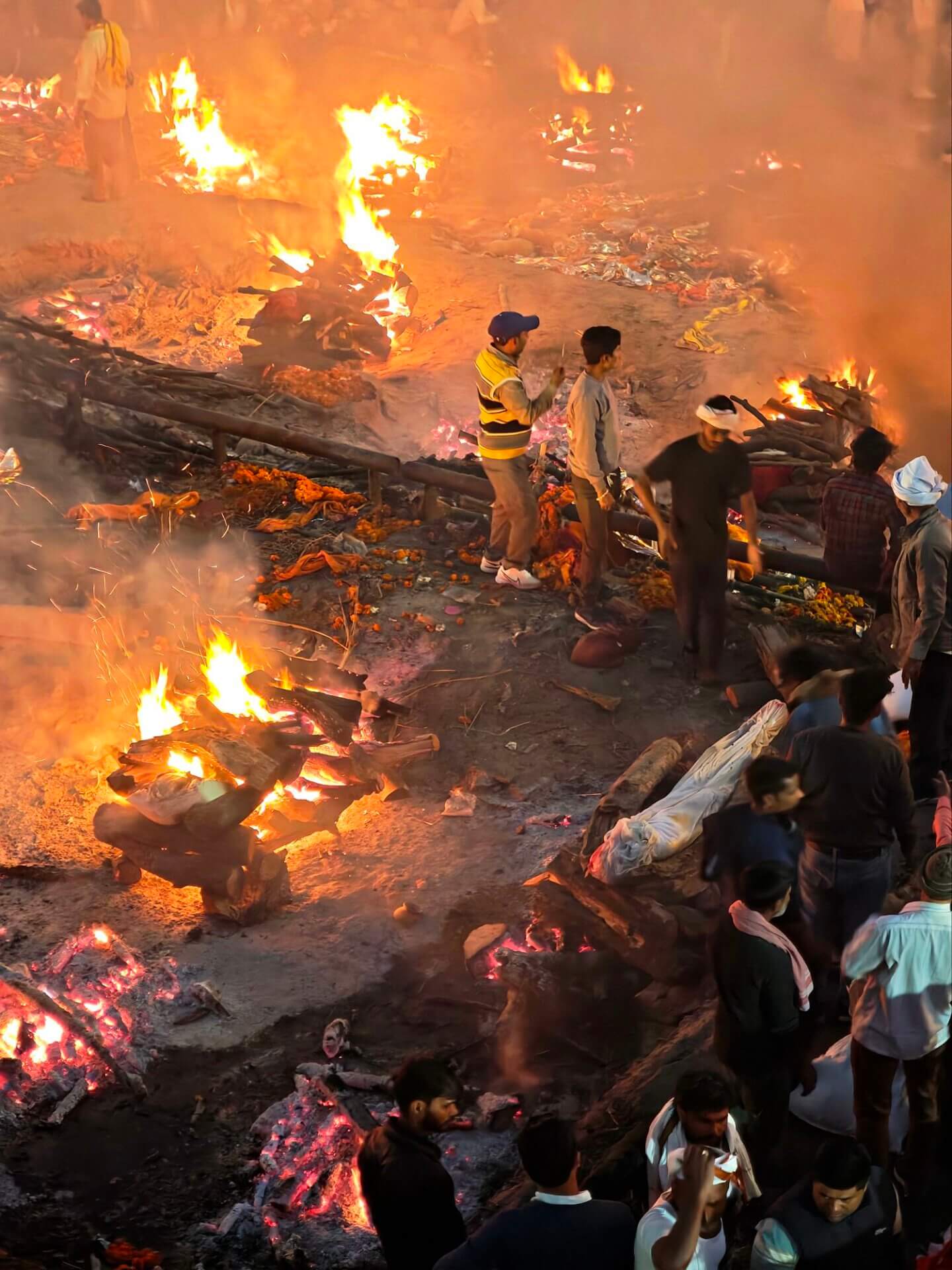 In Varanasi zu sterben, dort am Ganges verbrannt und als Asche dem Fluß übergeben zu werden, gilt im Hinduismus als Möglichkeit den Kreislauf der Wiedergeburten zu verlassen. Die Feuer brennen an zwei Ghats Tag und Nacht. Den Ritualen ausführlich zu folgen macht sprachlos. Fotografieren ist grenzwertig. Gleichzeitig wirkt alles offen und alltäglich: Am Harishchandra Ghat lassen lachende Kinder neben den Feuern einen Drachen steigen. Die Blechwände am Manikarnika Ghat sollen offenbar nicht die Verbrennungen sondern die daneben liegenden Baustellen abschirmen. Der Tod wird als normaler Teil des Lebens betrachtet und nicht als Ende sondern als Übergang verstanden.