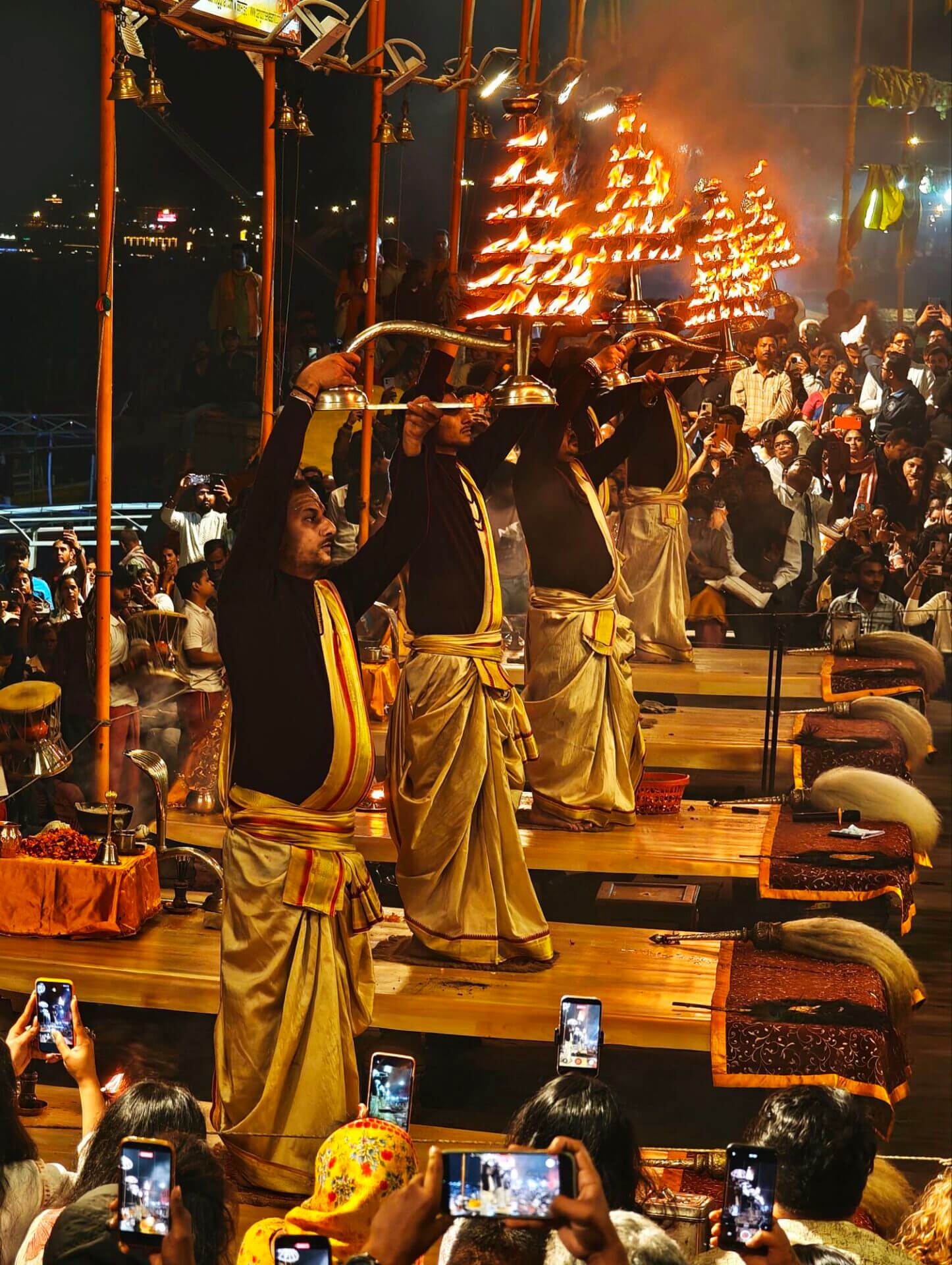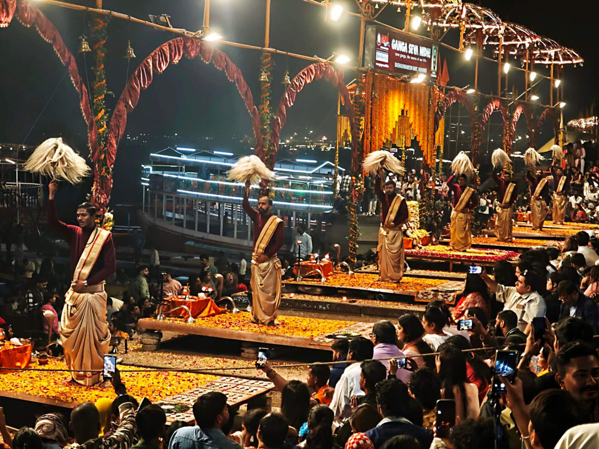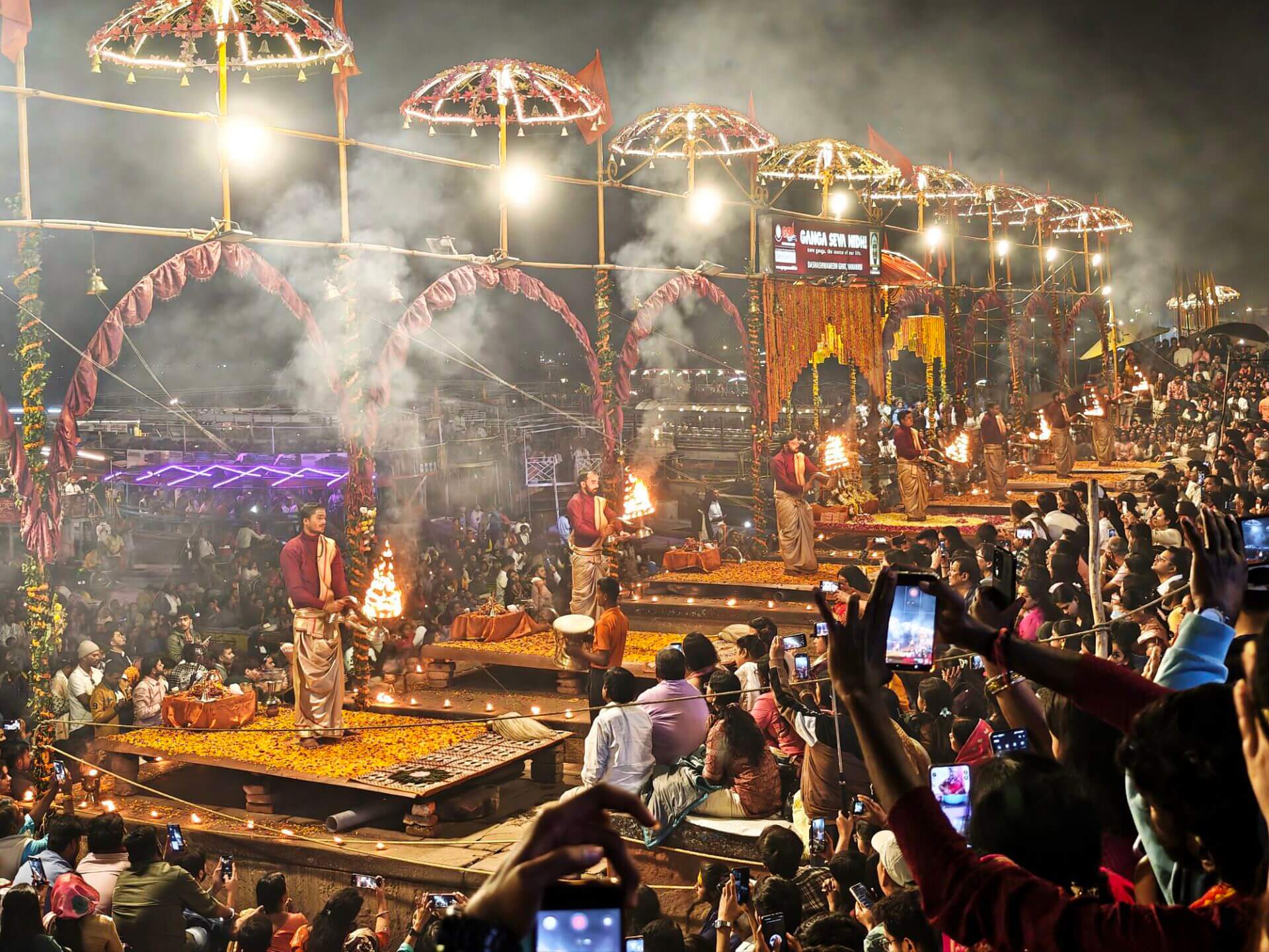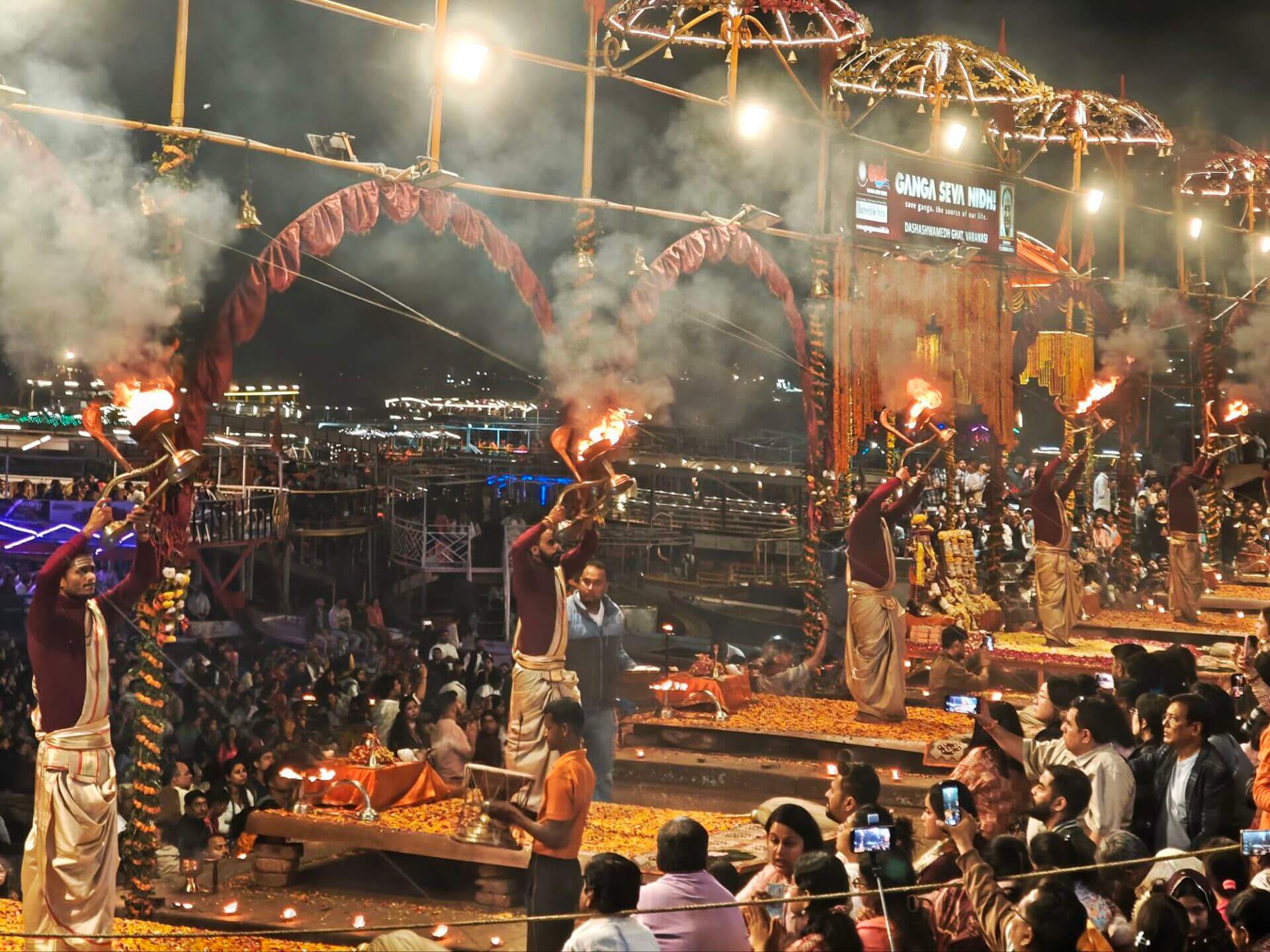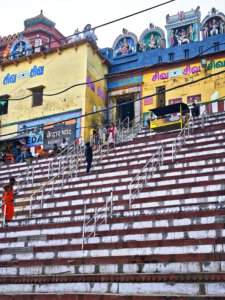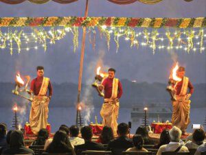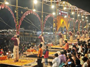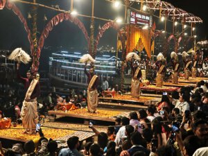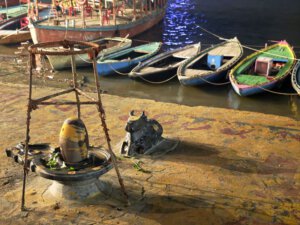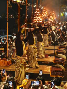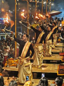 Arati, die Lichtzeremonie, normalerweise zu Ehren und am Altar einer bestimmten Gottheit, gibt es in Varanasi zu Ehren Mutter Ganga im ganz großen Stil an mehreren Ghats bei Sonnenaufgang und am Abend. An ein Durchkommen ist dann dort nicht mehr zu denken.
