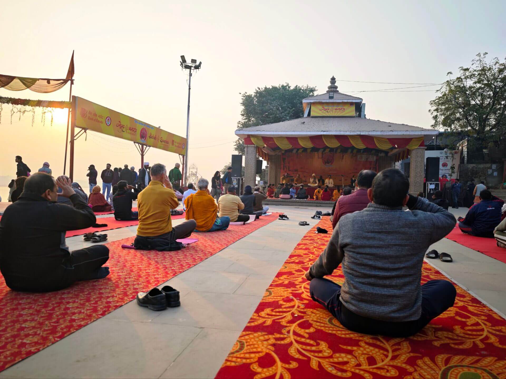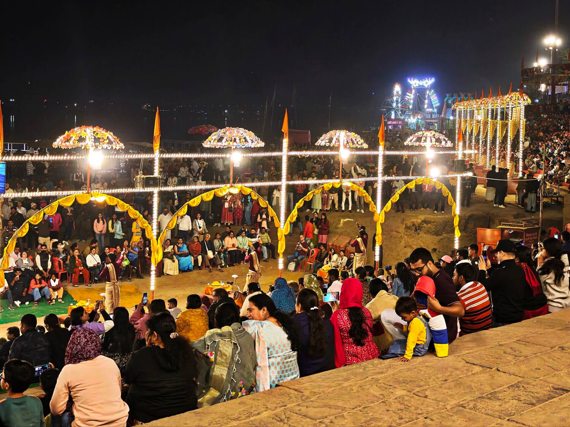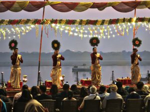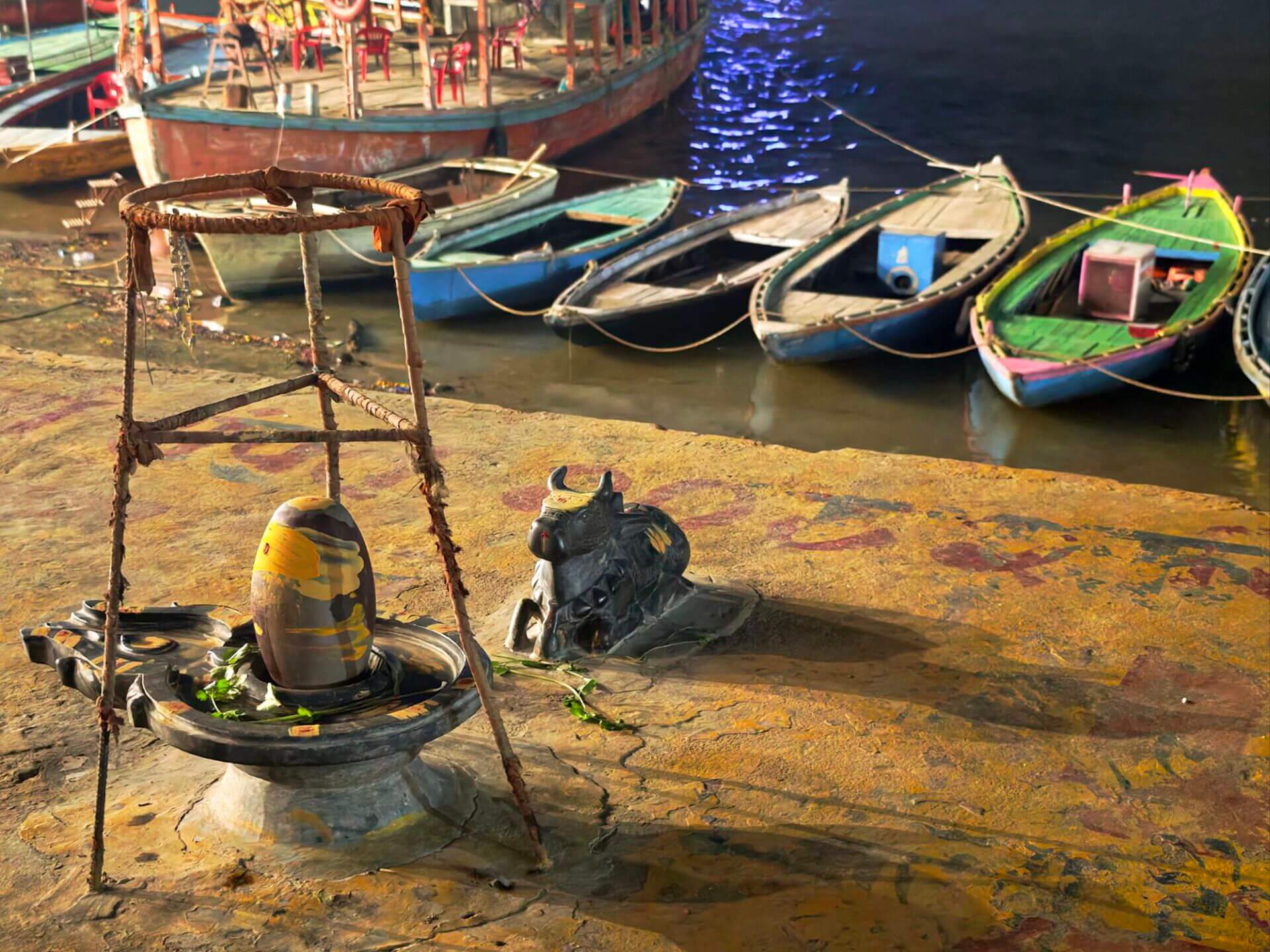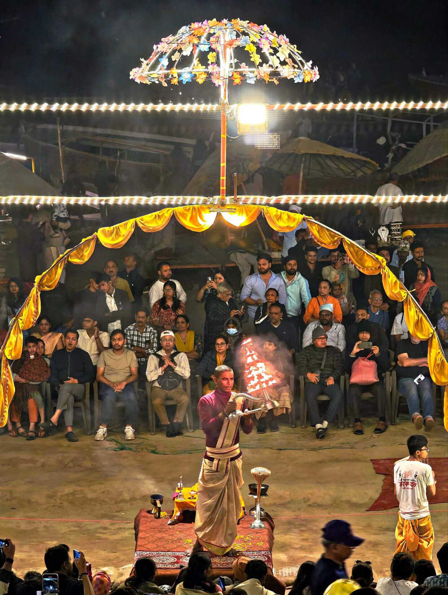 Arati, die Lichtzeremonie, normalerweise zu Ehren und am Altar einer bestimmten Gottheit, gibt es in Varanasi zu Ehren Mutter Ganga im ganz großen Stil an mehreren Ghats bei Sonnenaufgang und am Abend. An ein Durchkommen ist dann dort nicht mehr zu denken.