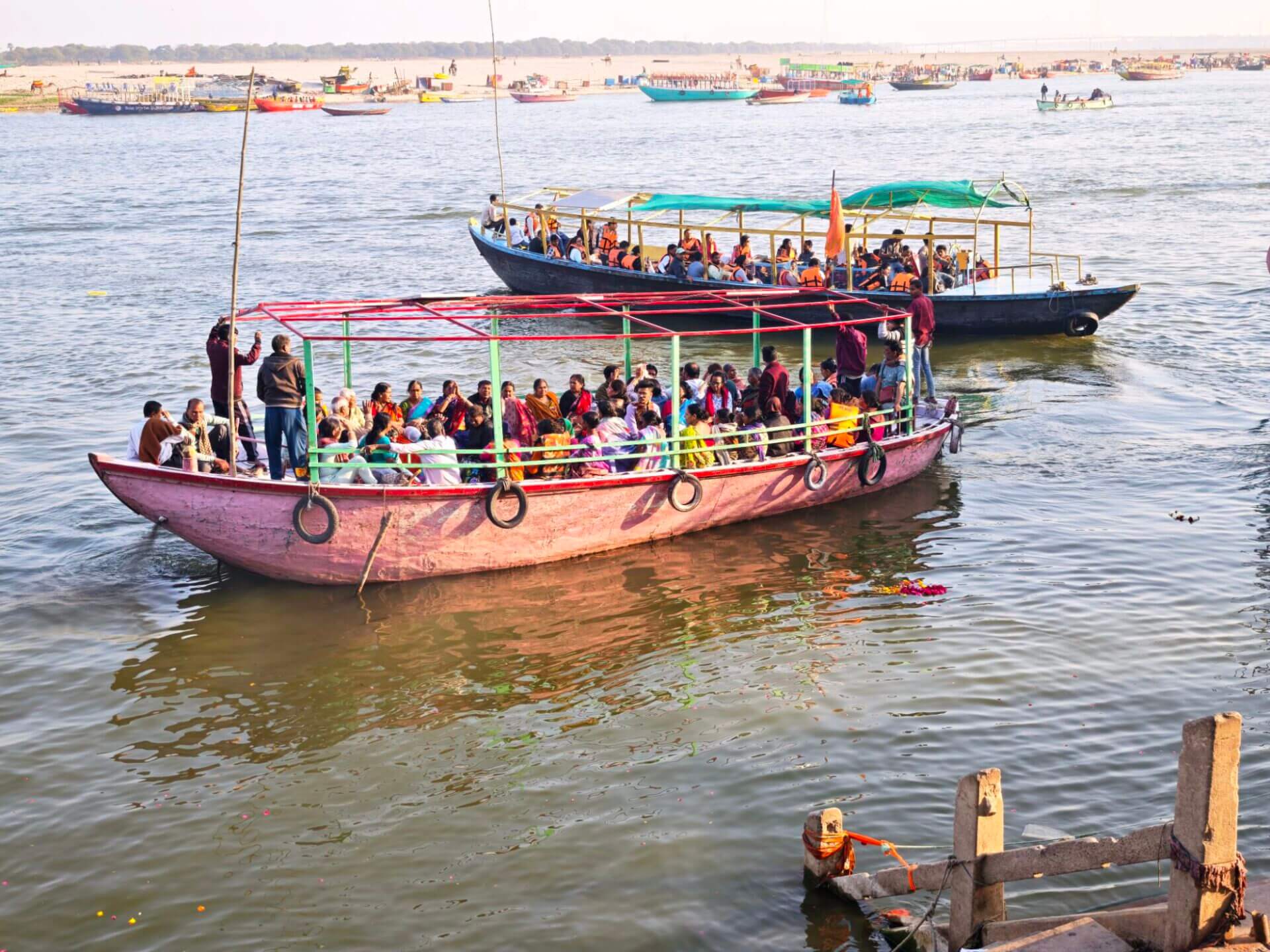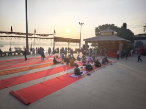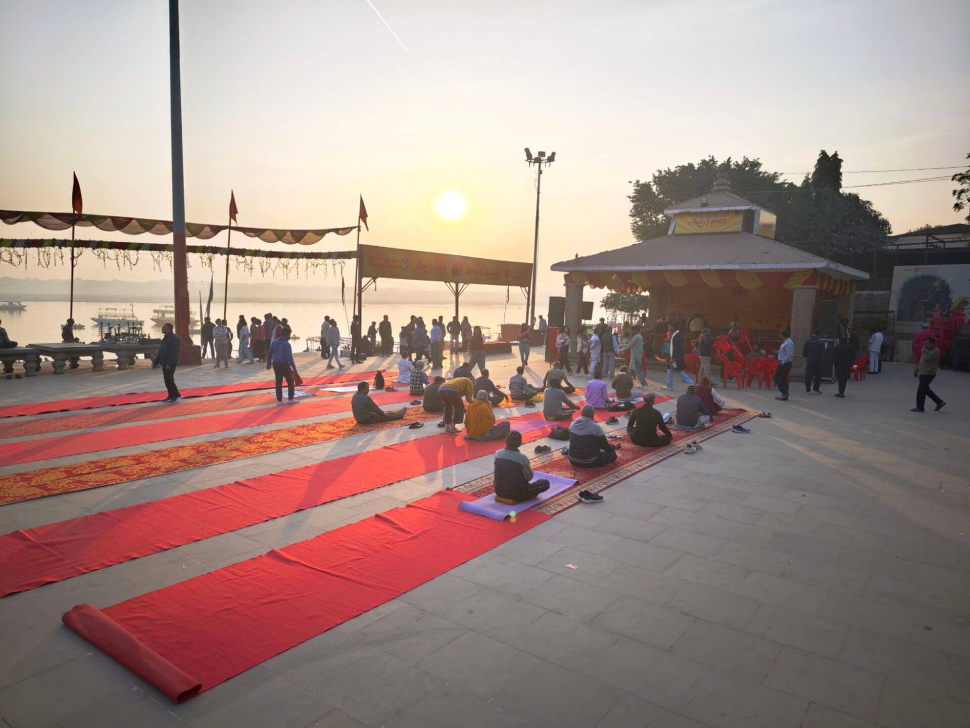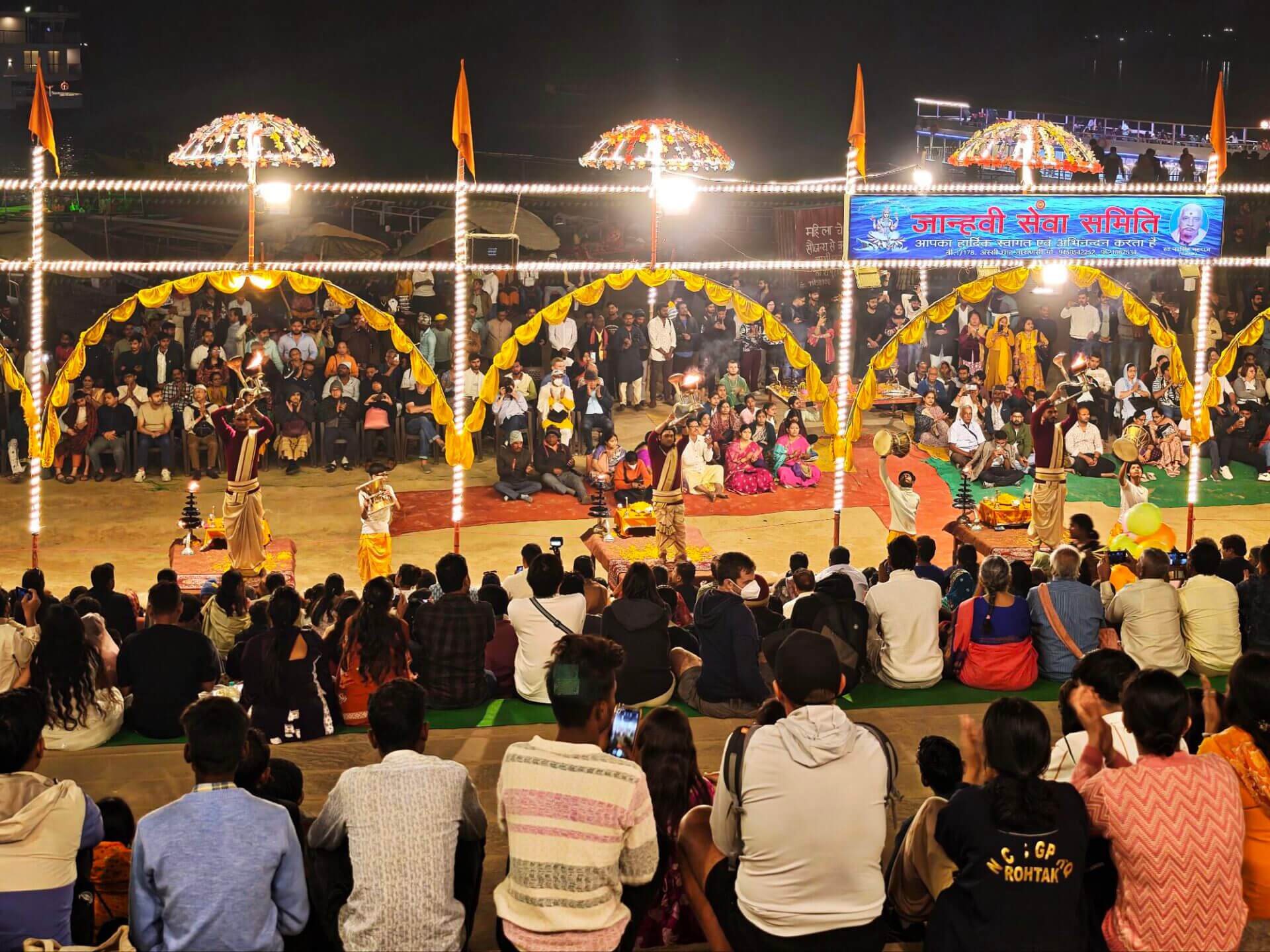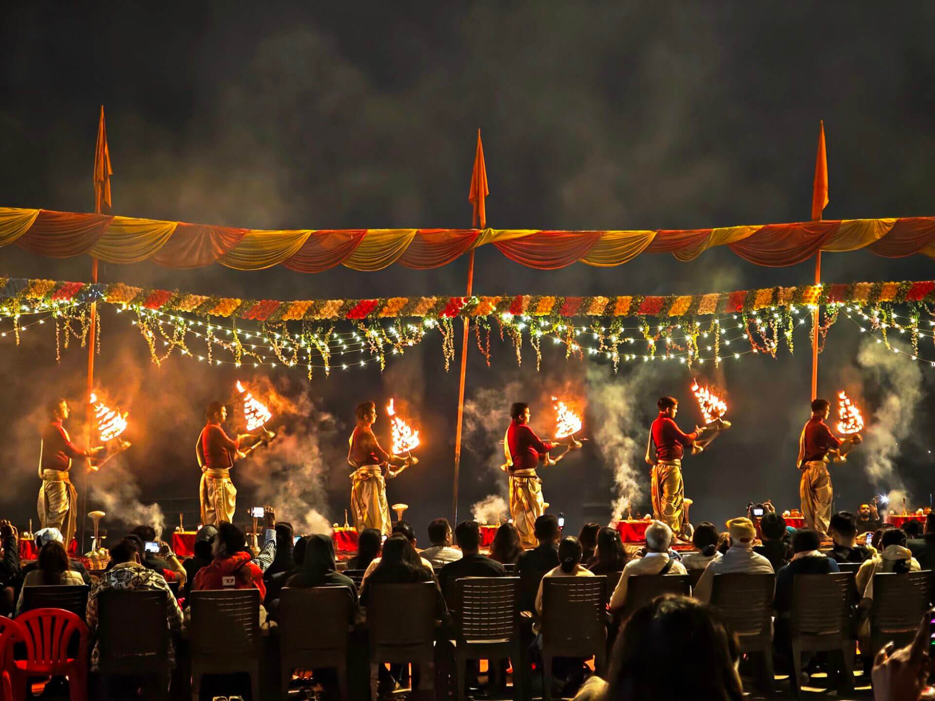 Arati, die Lichtzeremonie, normalerweise zu Ehren und am Altar einer bestimmten Gottheit, gibt es in Varanasi zu Ehren Mutter Ganga im ganz großen Stil an mehreren Ghats bei Sonnenaufgang und am Abend. An ein Durchkommen ist dann dort nicht mehr zu denken.