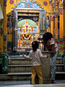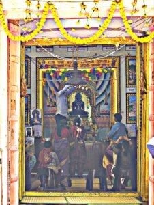 Am Tempel bin ich wieder Exot. Außer mir sind viele regionale Pilger hier, die ihre Rituale praktizieren. Dass ihr Tempel in einem deutschen Buch beschrieben wird und ich deshalb herkomme, begeistert die Menschen, die mich befragen. Wieder erhalte ich eine kleine Führung, werde unterwiesen und darf exklusiv an die uralte Darstellung der Göttin Mundeshwari, Form der Durga, weibliche göttliche Urkraft, herantreten und sie berühren.