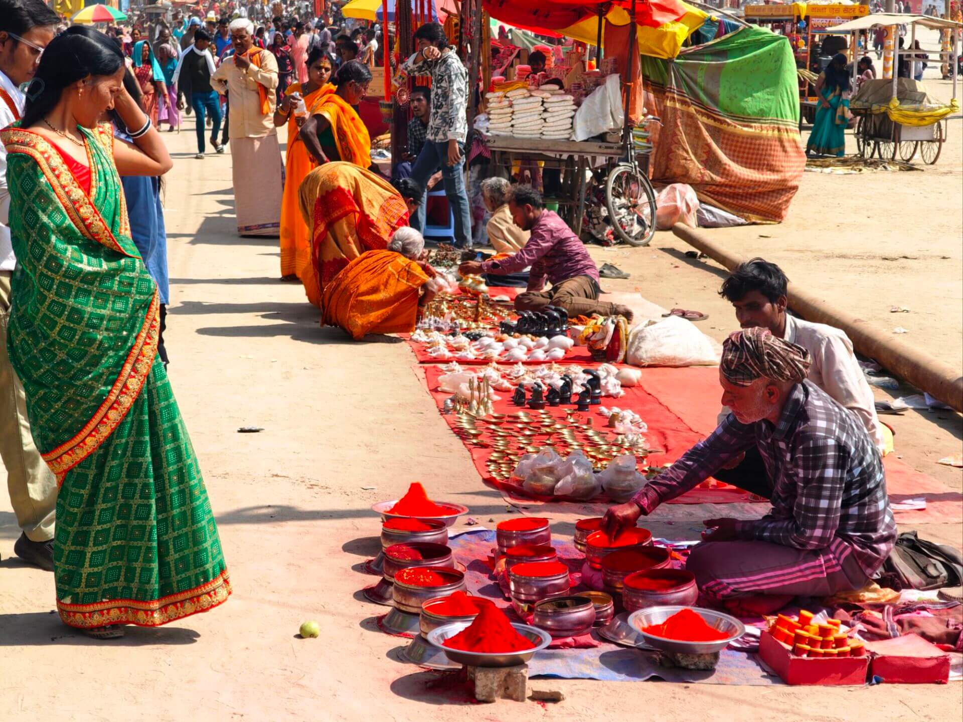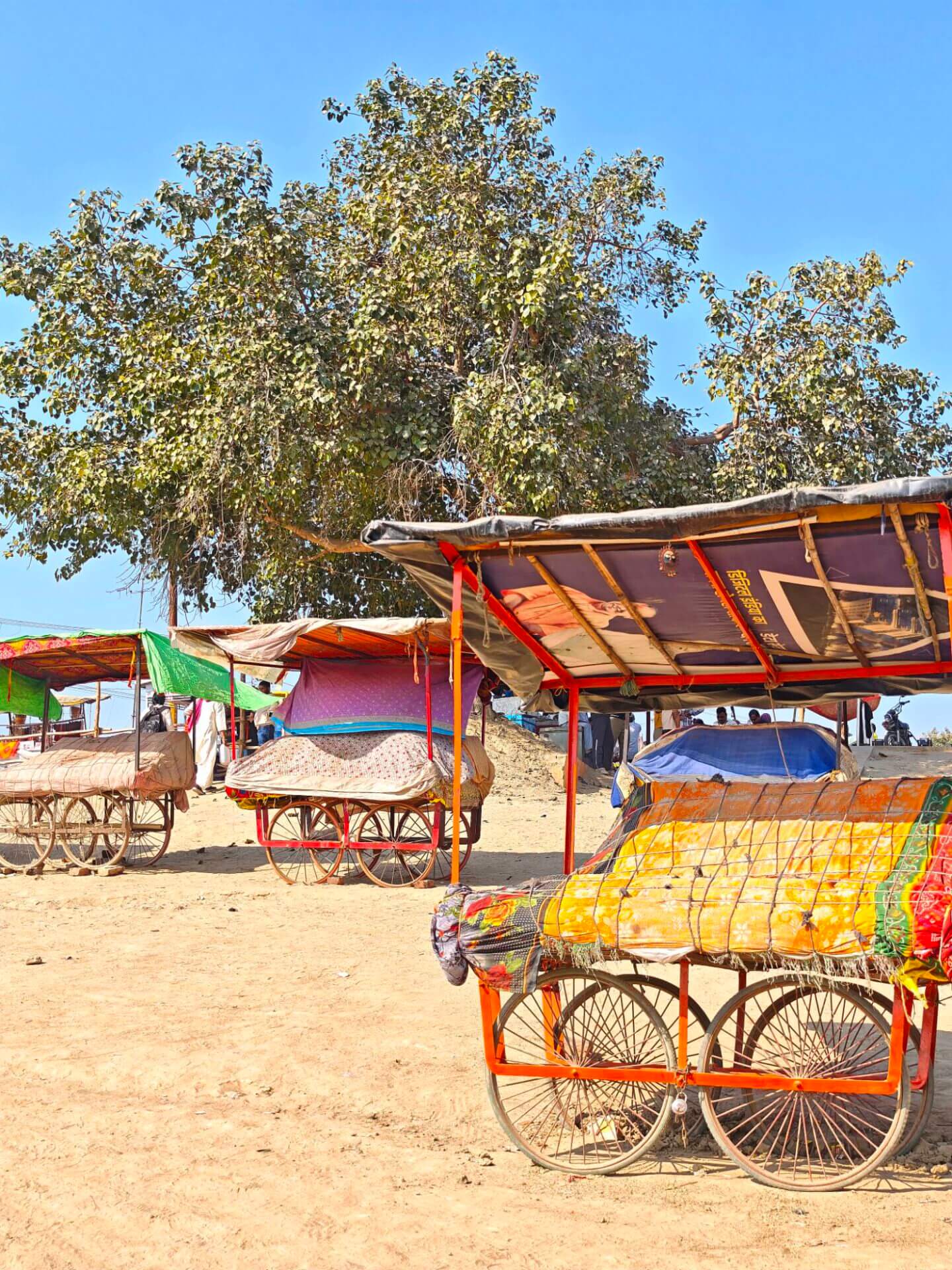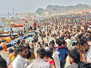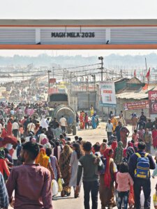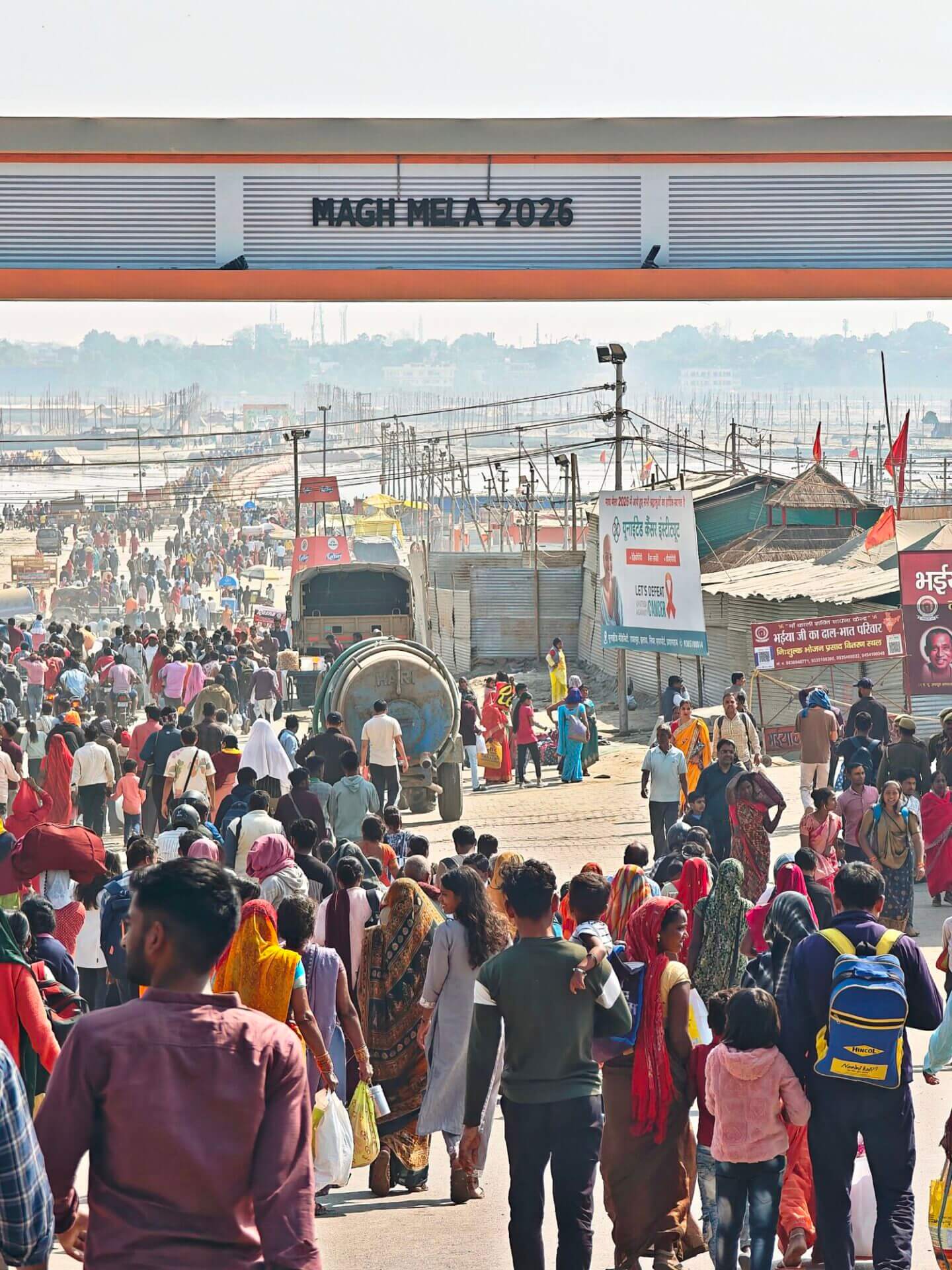 Alle zwölf Jahre findet hier die 55-tägige Kumbh Mela statt, größtes religiöses Fest der Welt. Zuletzt 2019 kamen an den Spitzentagen etwa 50 Millionen Menschen. Und jährlich, im Januar/Februar, deren kleine Schwester, die 44-tägige Magh Mela. Wie ich hinterher lese, kamen auch zur Magh Mela 2026 kumuliert etwa 220 Millionen Menschen an die Flüsse. Die Pilger campieren in der Ebene des Ganges, der jetzt am Ende des Winters Niedrigwasser führt. Umgeben und durchzogen von einer bunten Zeltstadt aus Marktständen.