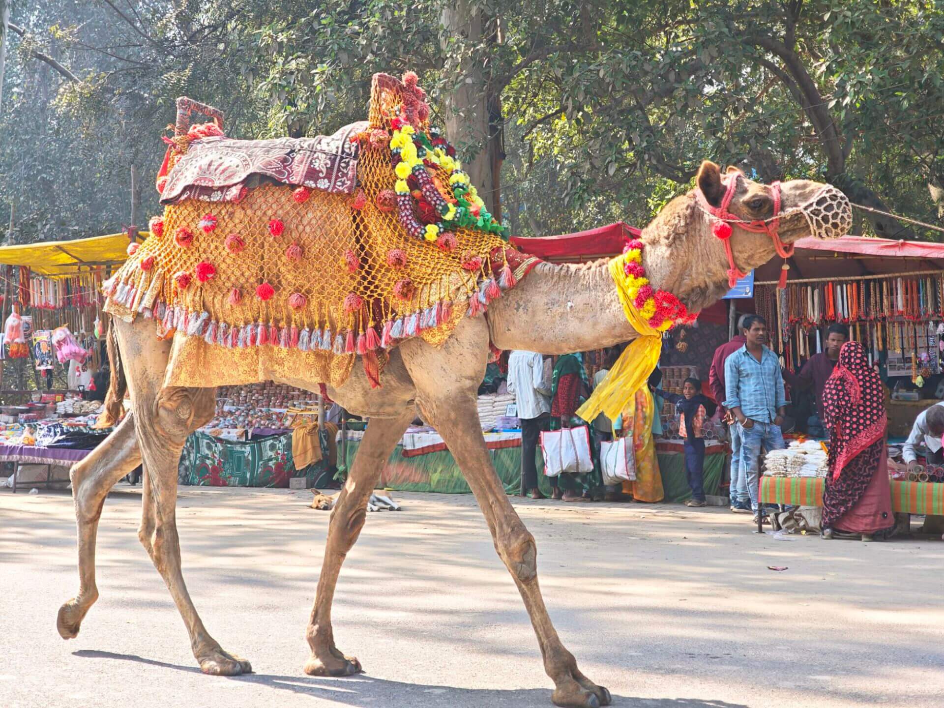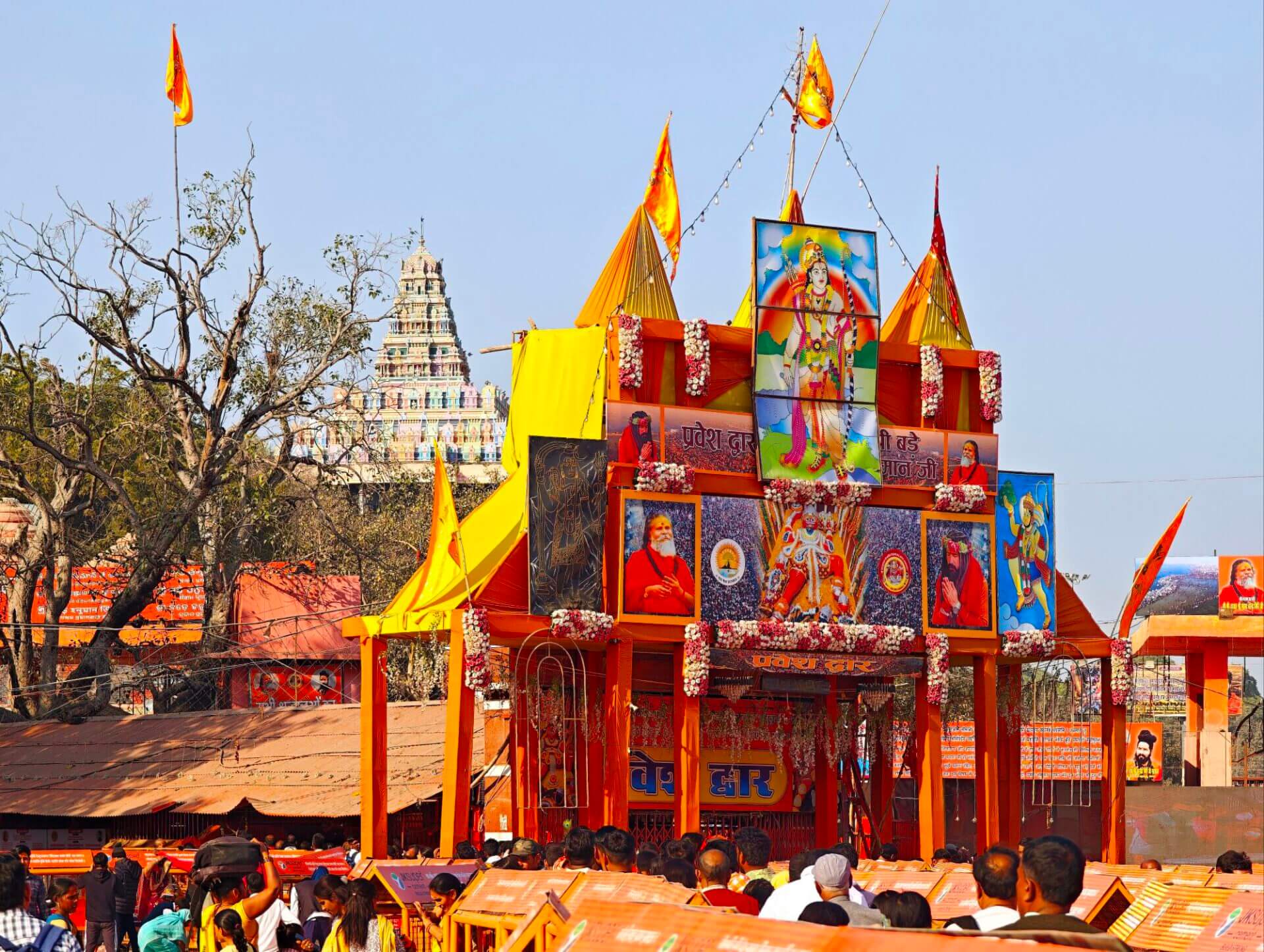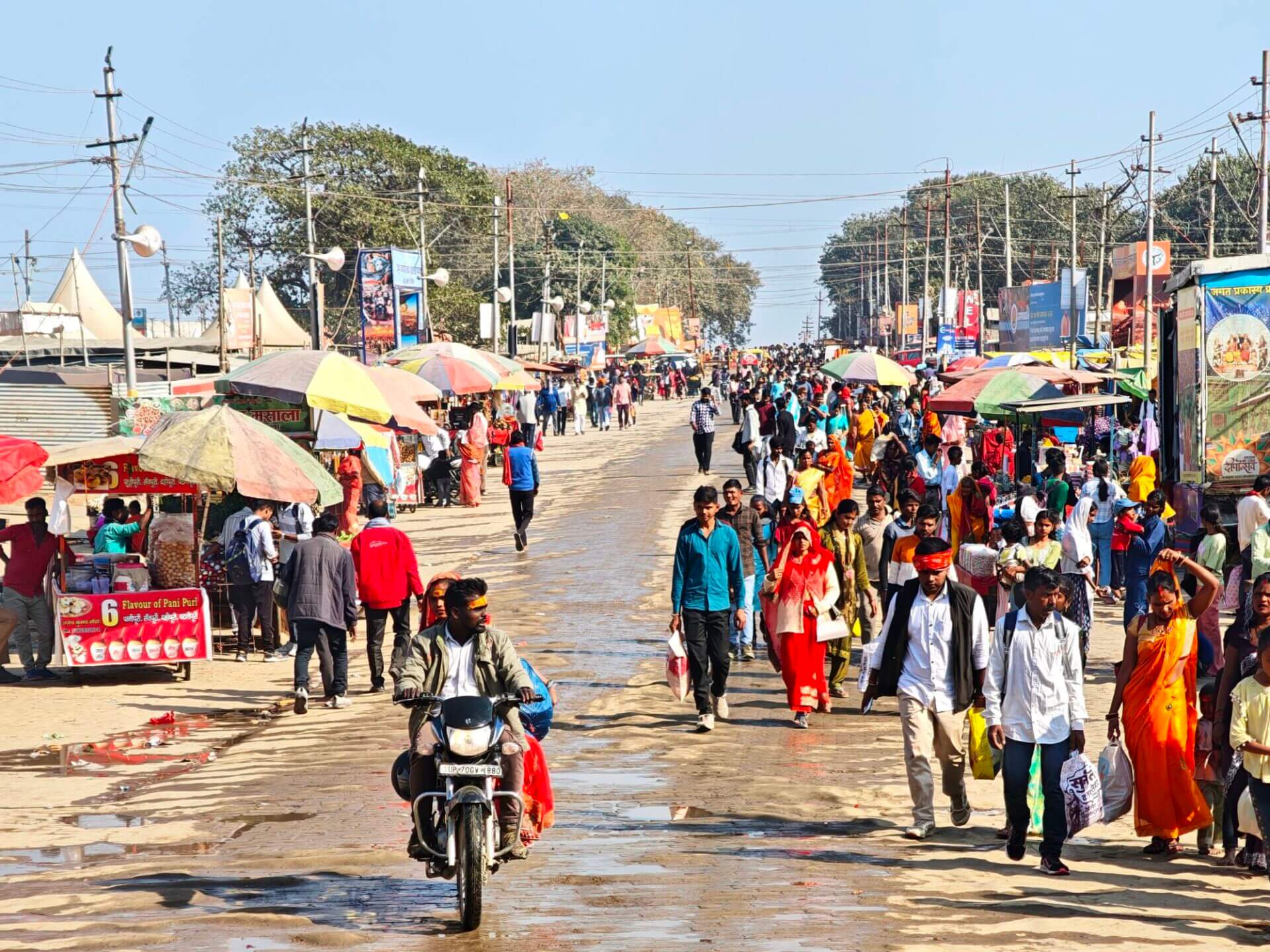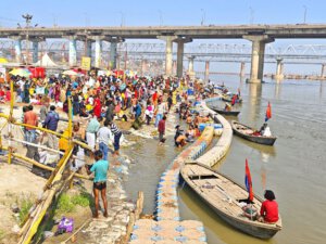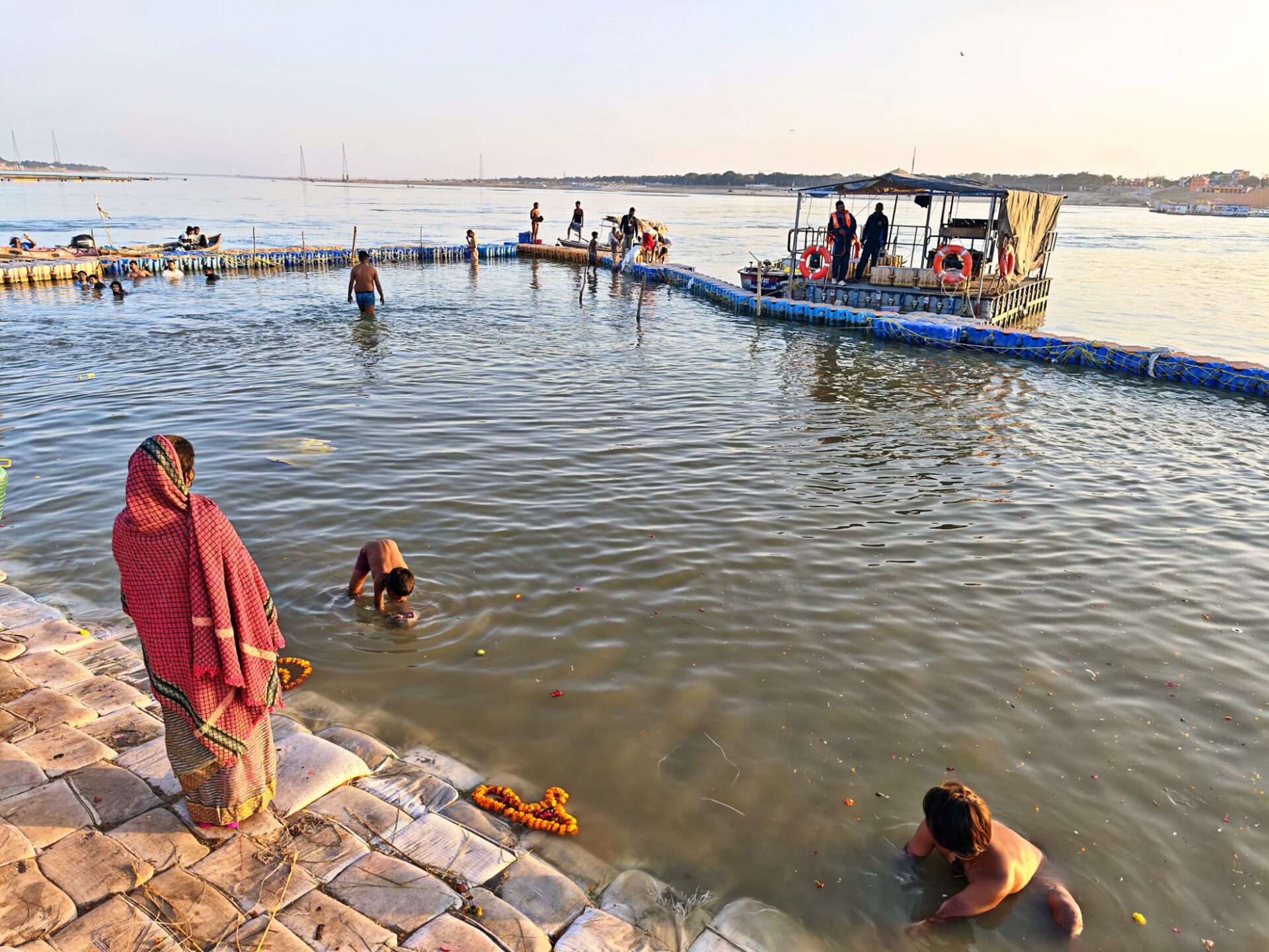 Alle zwölf Jahre findet hier die 55-tägige Kumbh Mela statt, größtes religiöses Fest der Welt. Zuletzt 2019 kamen an den Spitzentagen etwa 50 Millionen Menschen. Und jährlich, im Januar/Februar, deren kleine Schwester, die 44-tägige Magh Mela. Wie ich hinterher lese, kamen auch zur Magh Mela 2026 kumuliert etwa 220 Millionen Menschen an die Flüsse. Die Pilger campieren in der Ebene des Ganges, der jetzt am Ende des Winters Niedrigwasser führt. Umgeben und durchzogen von einer bunten Zeltstadt aus Marktständen.