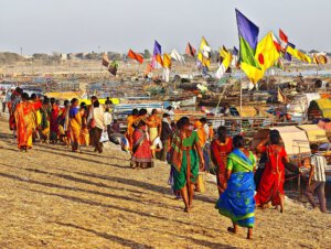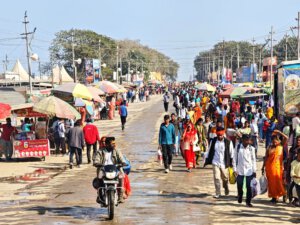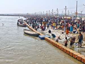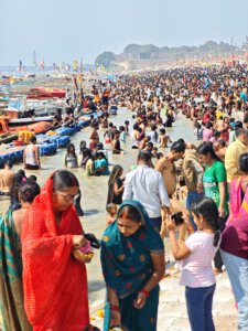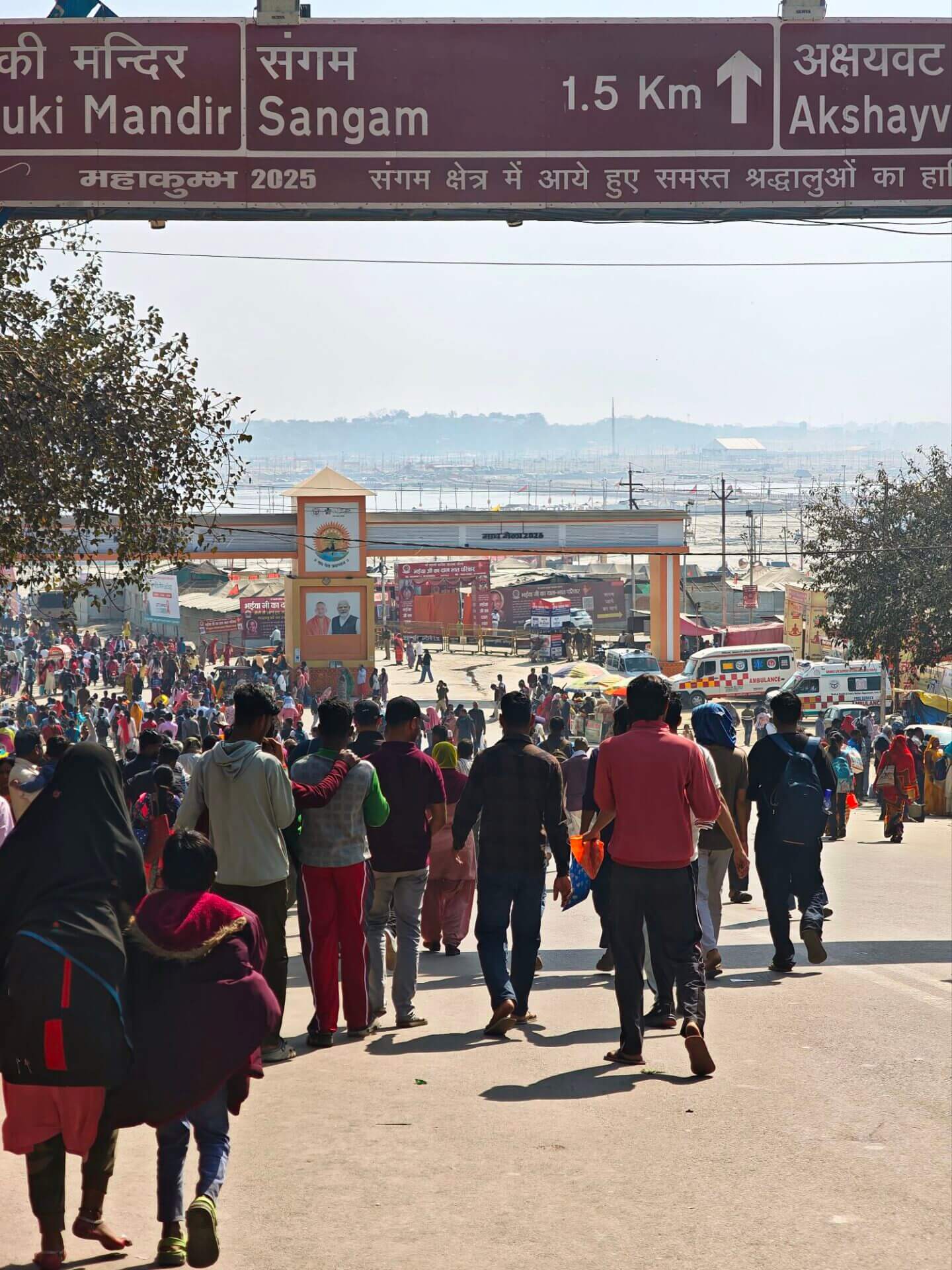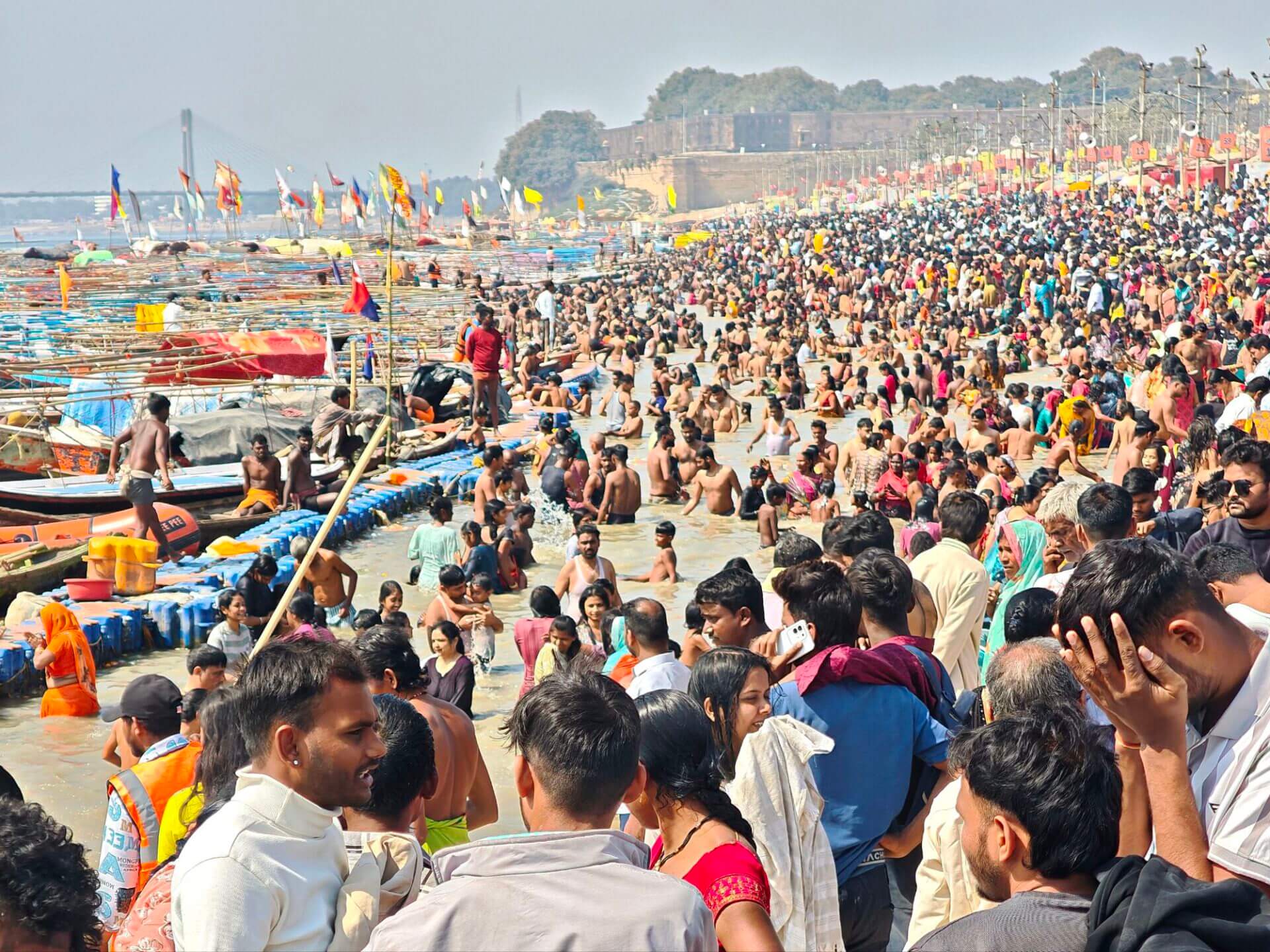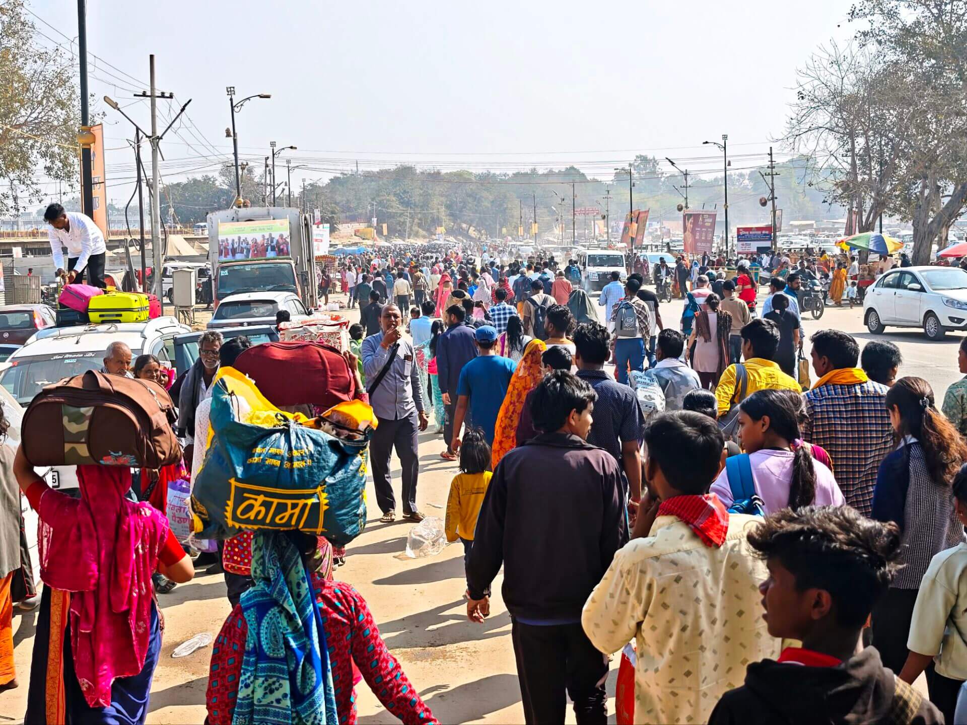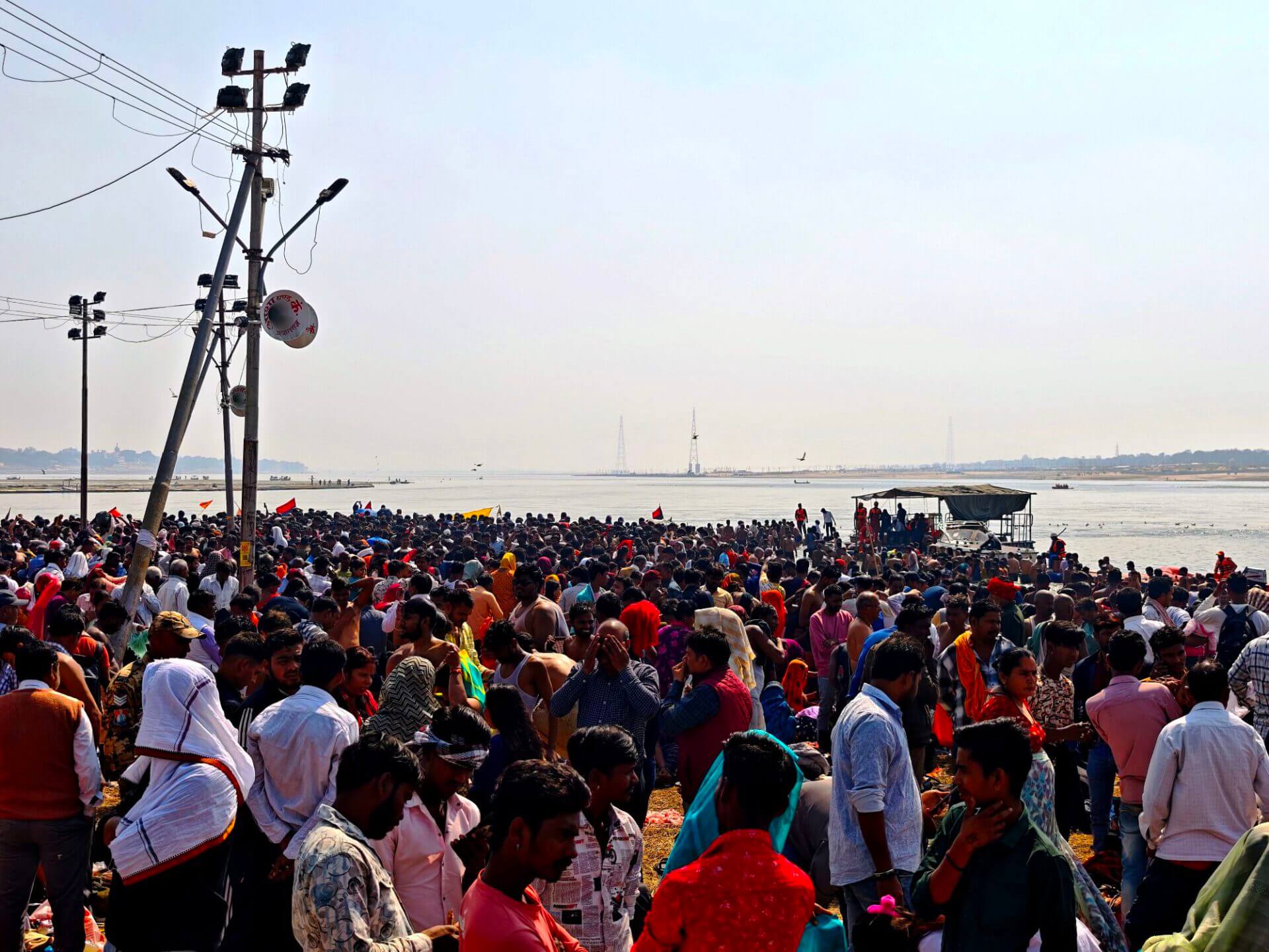 Mein erster voller Tag in Prayagraj fällt auf den letzten Tag der Magh Mela. Ich hoffe die Atmosphäre des Festes ohne die ganz großen Massen zu erleben. Die knapp fünf Kilometer aus der Altstadt zum Sangam will ich zu Fuß gehen. Obwohl diese Fortbewegungsart in Indien ungewöhnlich ist, erfasst mich auf den letzten beiden Kilometern ein anschwellender Strom von Menschen: Alle nochmal zum Sangam und zum rituellen Bad.