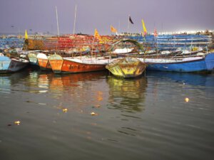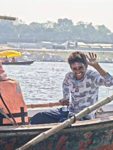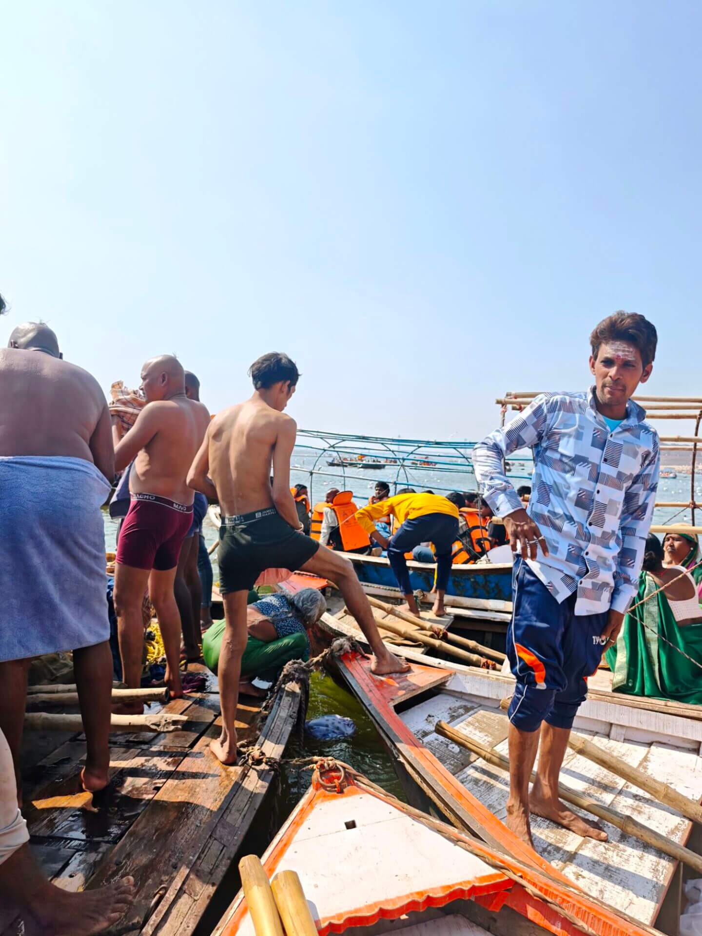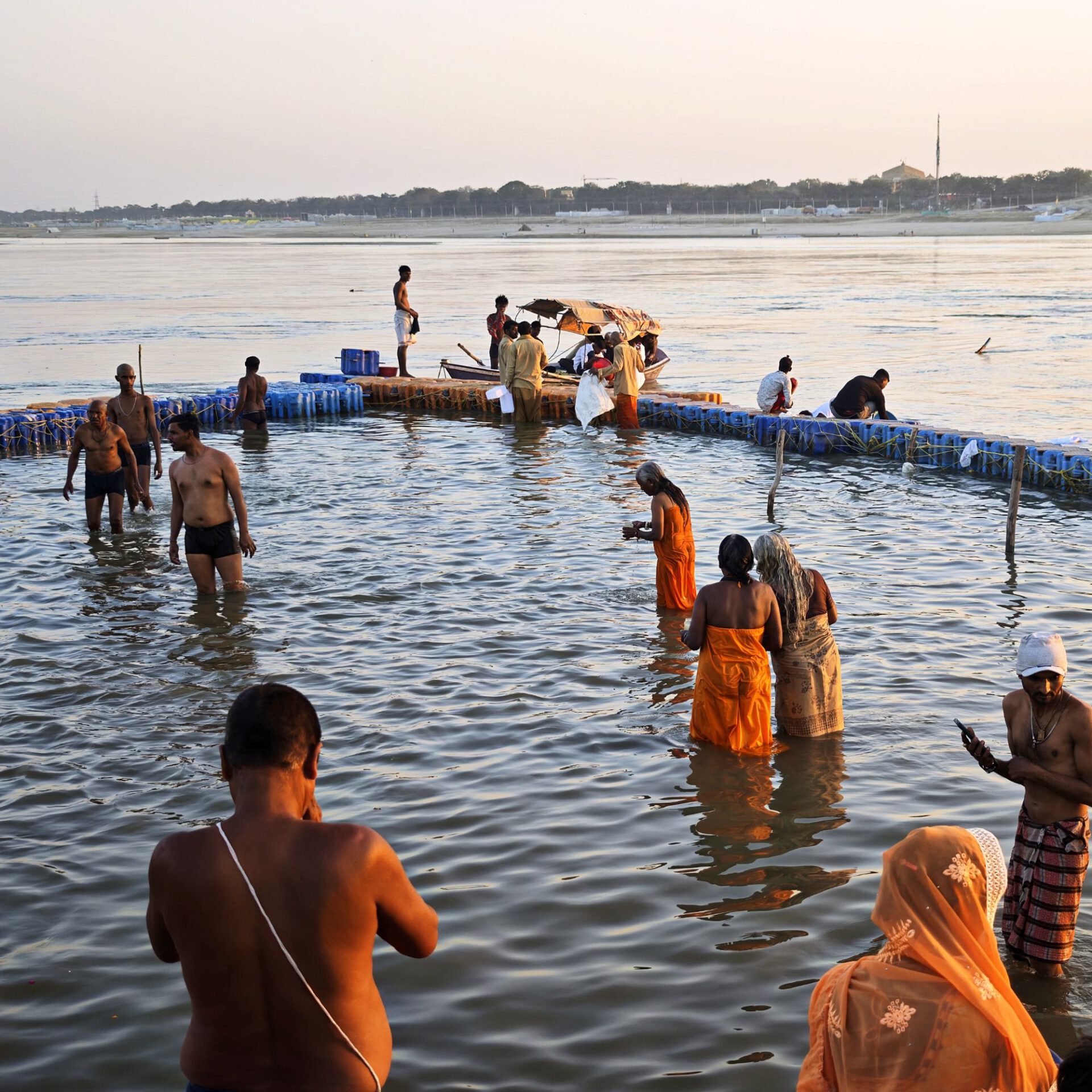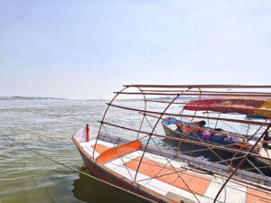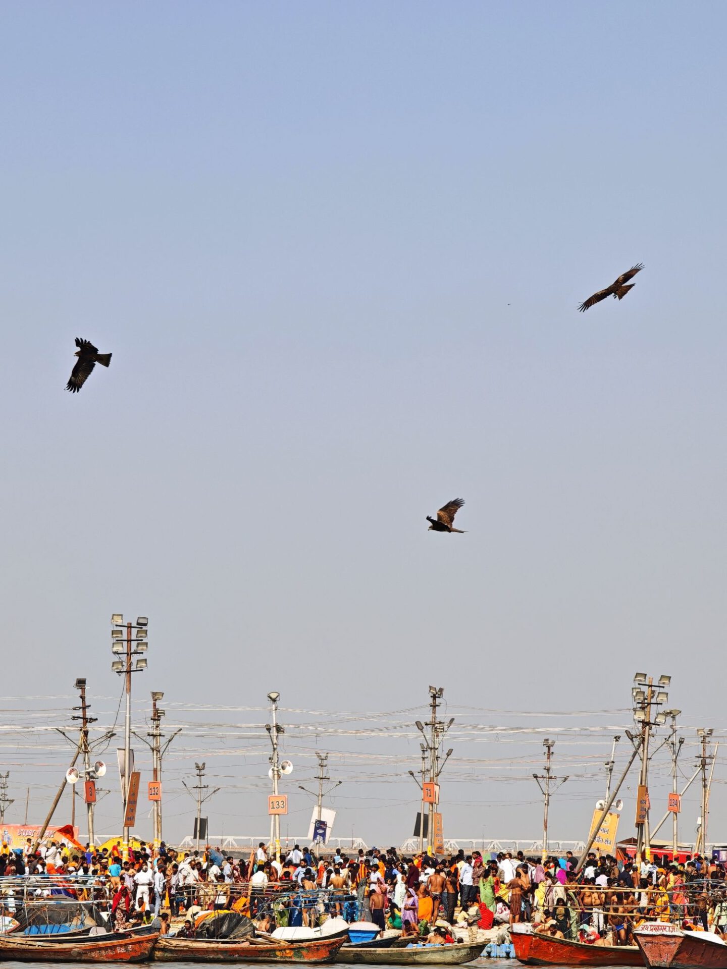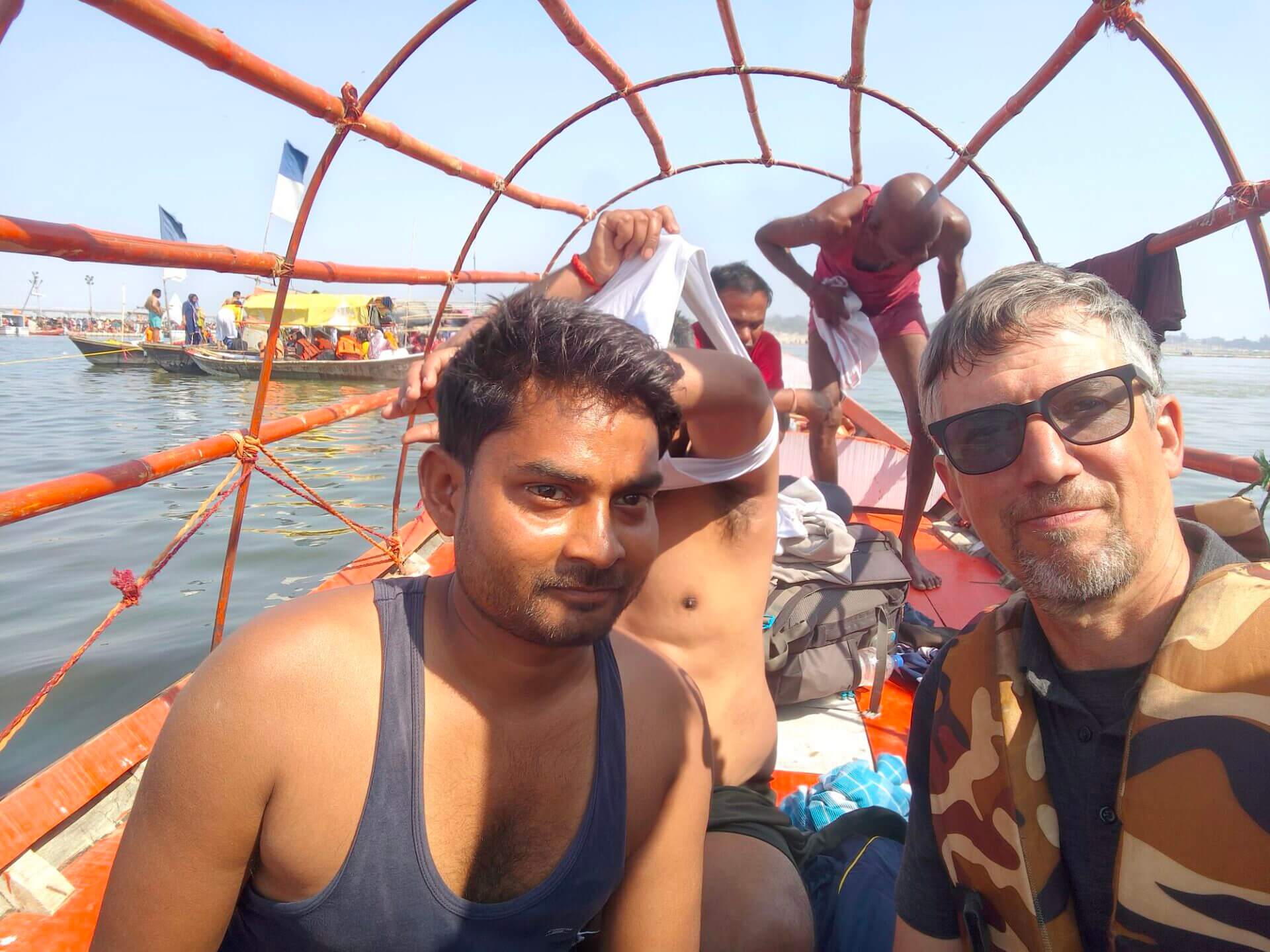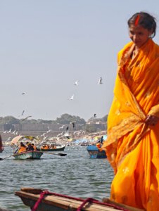Nach einiger Zeit am Sangam, folge ich spontan der Aufforderung, in einen der vielen geruderten Kähne zu steigen, die die Pilger in die Mitte der Flüsse bringen. Da mich der Kahn auf dem heiligen Fluss trägt, muss ich darin, wie in jedem Tempel, meine Schuhe ausziehen. Am Zusammenfluss werden die Kähne miteinander vertaut und ich werde davon überrascht, dass es Zweck der Fahrt ist, hier das Boot kurz zu verlassen. So wie es die anderen Pilger im Kahn überrascht, dass ich von dieser Möglichkeit keinen Gebrauch mache.