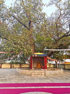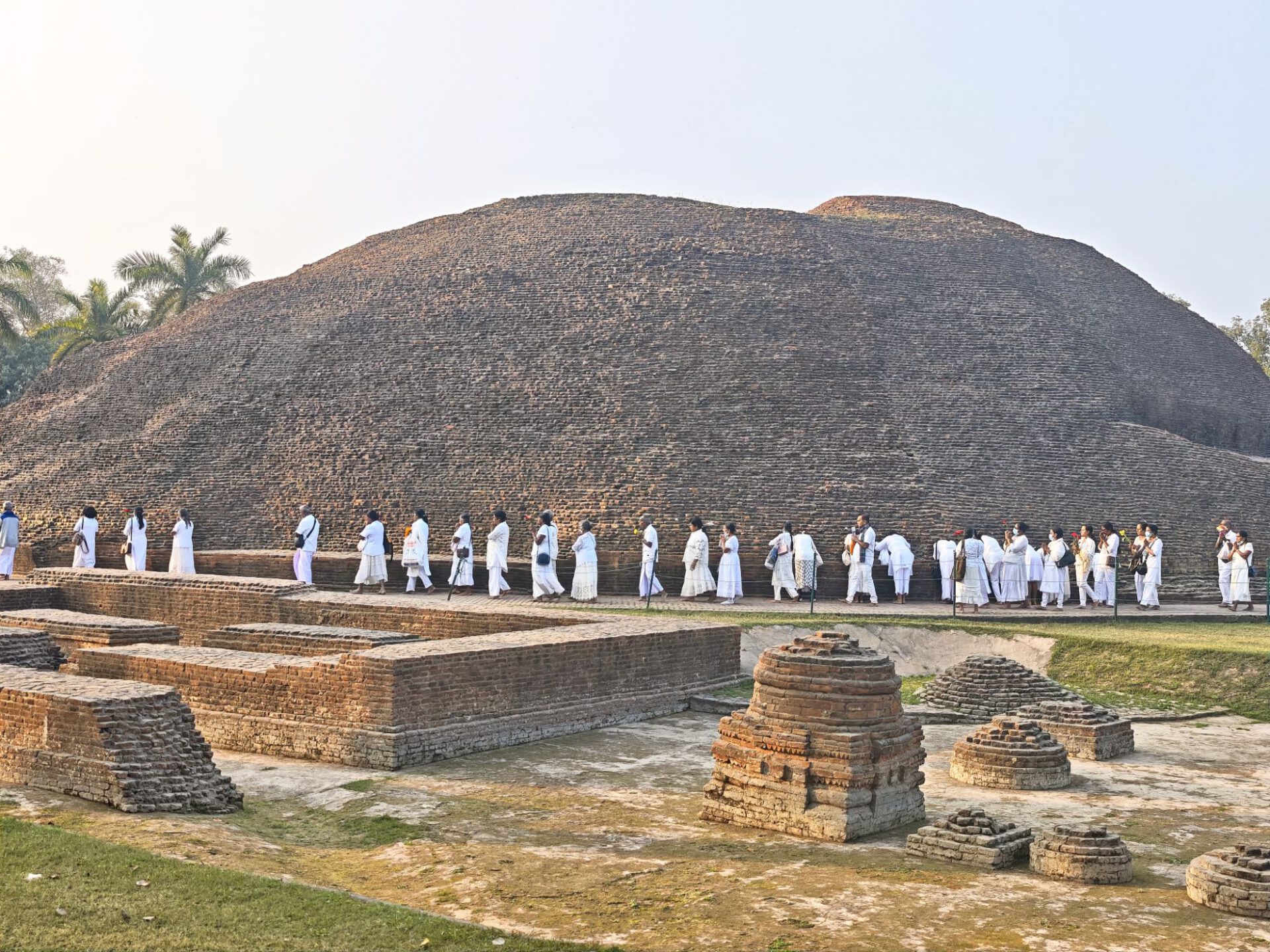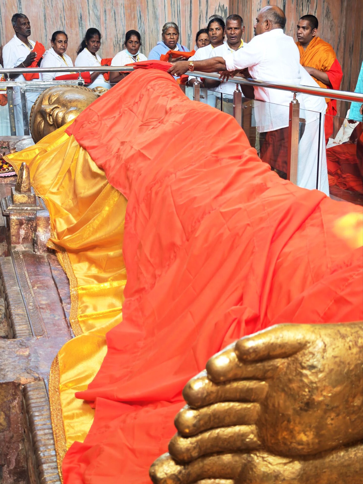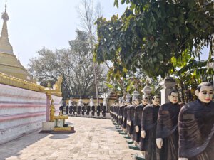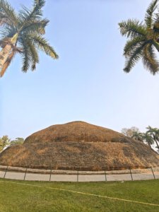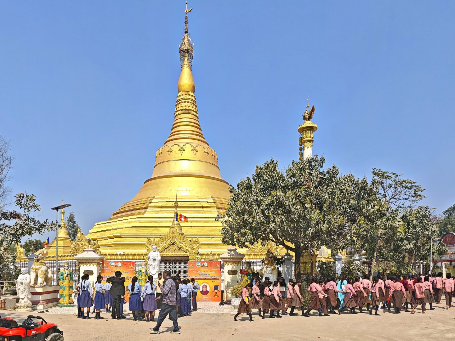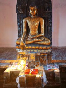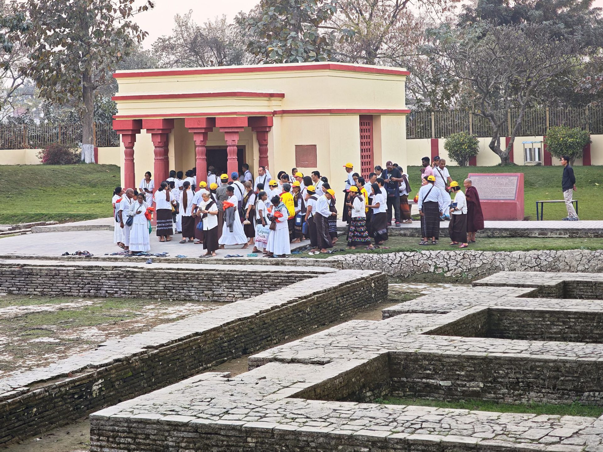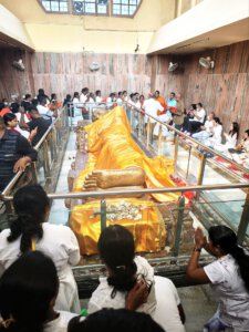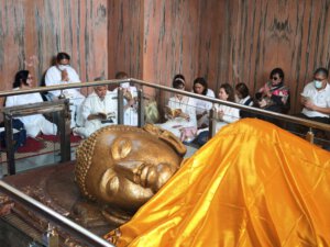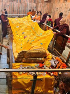 Zentral ist der, auf uralten Fundamenten erbaute, moderne Mahaparinirvana-Tempel mit einer hoch verehrten, über sechs Meter langen, liegenden bzw ins Nirvana übergehenden, Buddha-Statue aus dem 5. Jahrhundert. Umgeben ist der Tempel von Grundmauern von Klöstern und Tempeln aus dem frühen ersten Jahrtausend und soll den genauen Sterbeplatz kennzeichnen. Ich verbringe den Nachmittag im und am Tempel mit Pilgergruppen aus Thailand und Kambodscha.