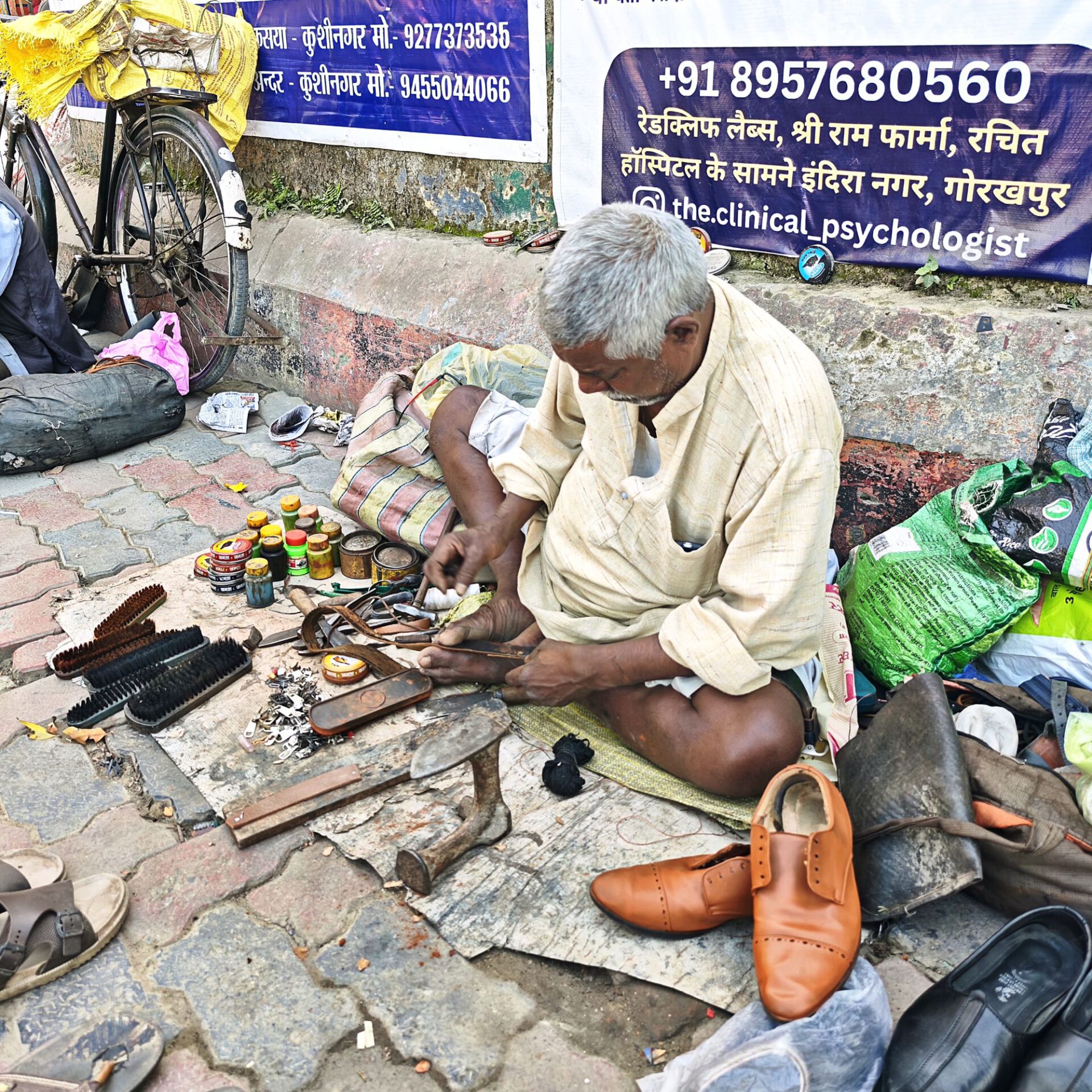 Schlecht unterwegs: Mein sog. Leibriemen, den ich beim Dienstantritt empfangen habe, ist nach 35 Jahren steten Gebrauchs in zwei Teile gerissen. Gut in Indien: Ein Schuster, der wie die meisten Handwerker mit einfachsten Mitteln direkt an der Straße arbeitet, repariert ihn mir routiniert und schwärzt noch schnell das spröde Leder.