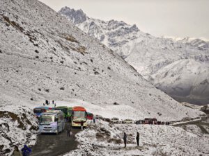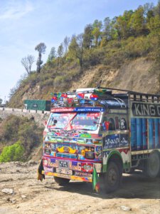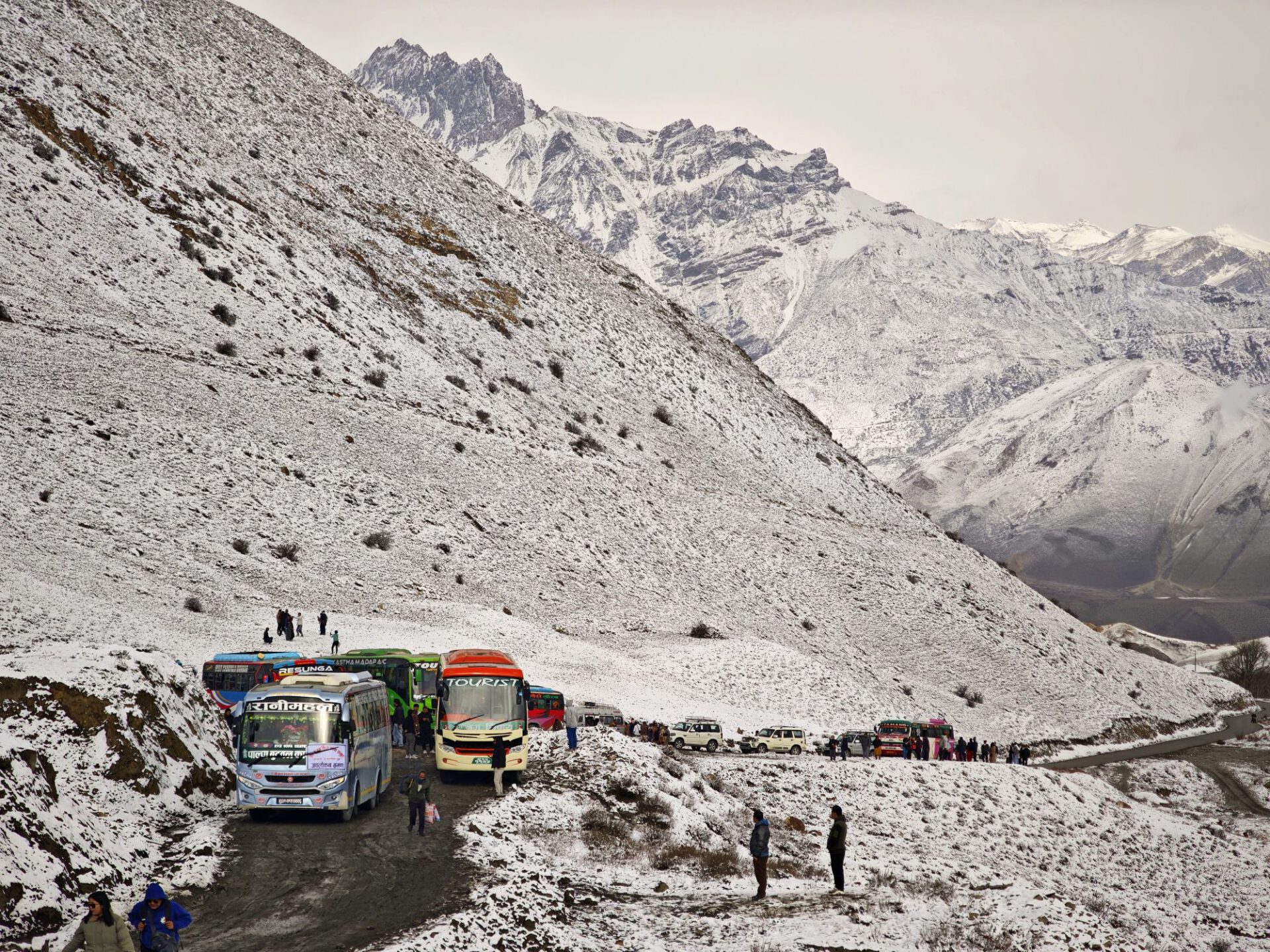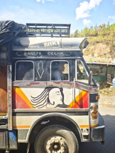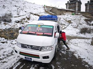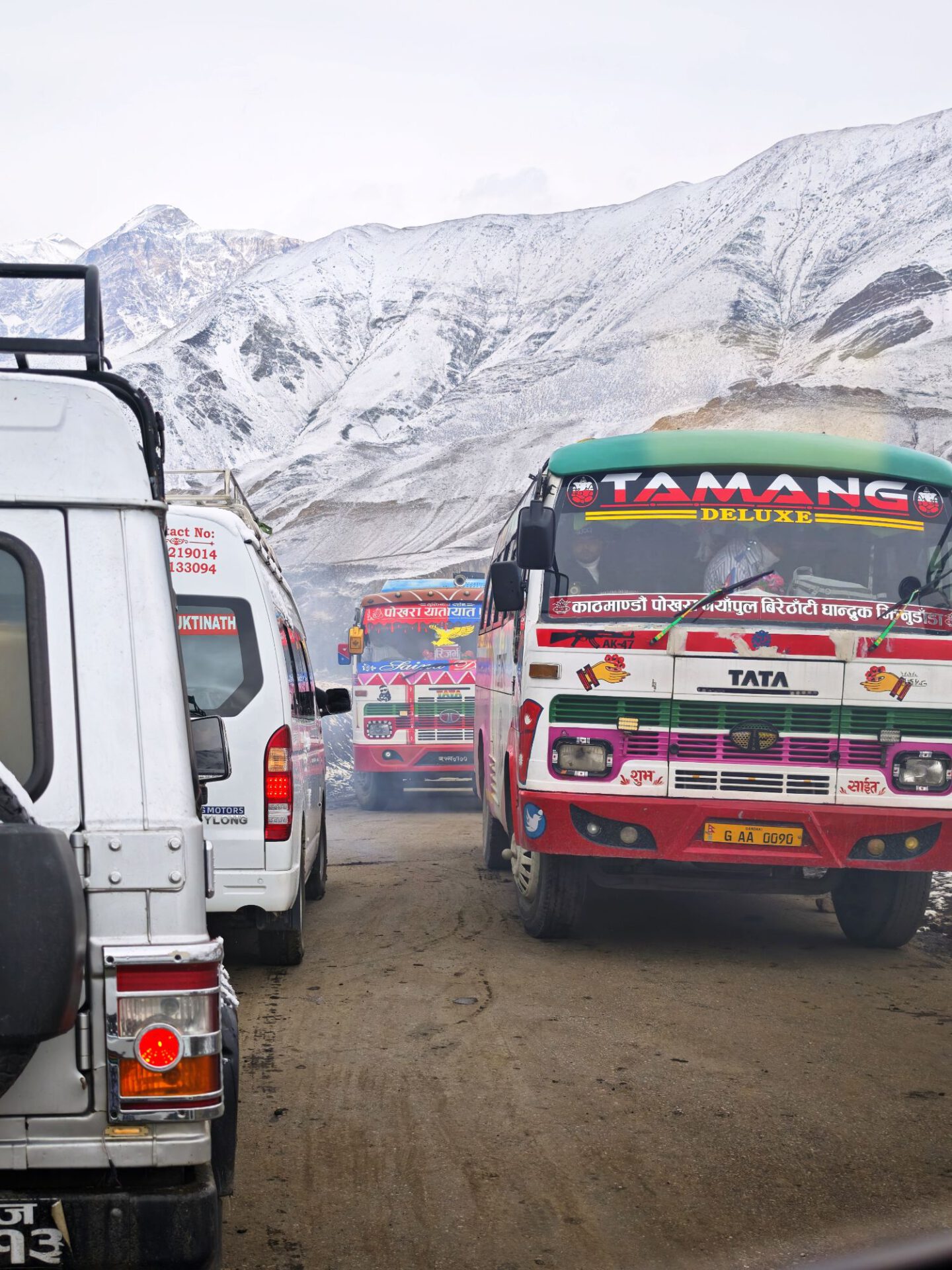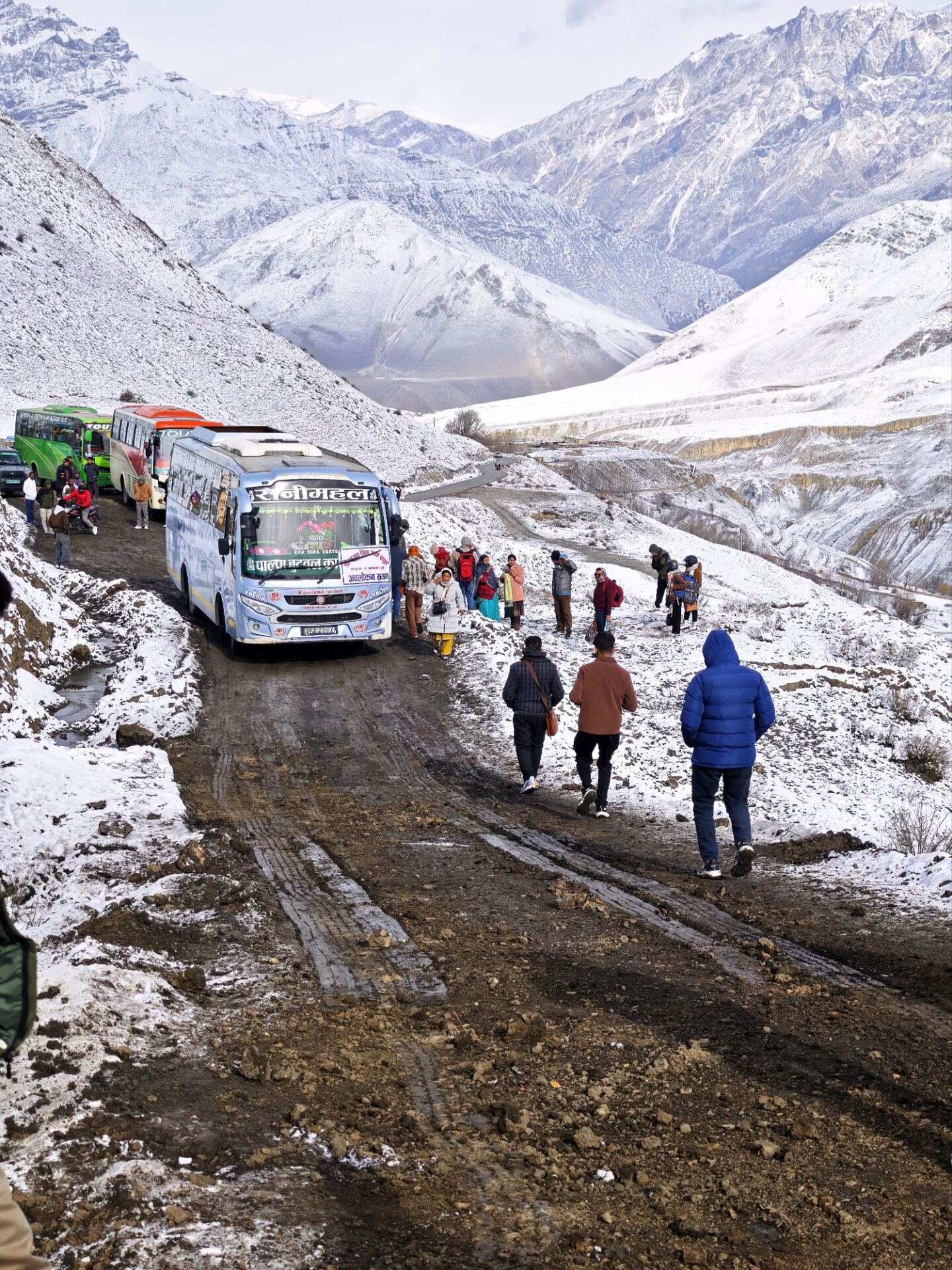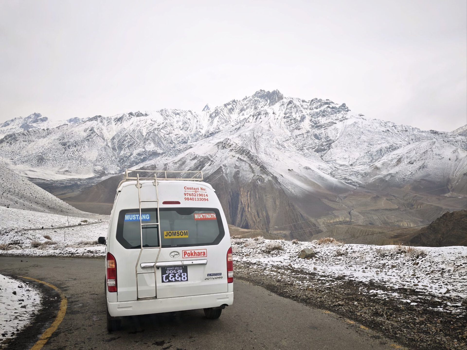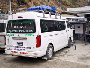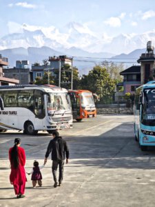 Für die Rückfahrt vom Heiligtum Muktinath nach Pokhara wähle ich einen Kleinbus. Der Rucksack kommt aufs Dach, ich bekomme den Beifahrersitz. Bereits nach einer halben Stunde geht nichts mehr: An einer steilen Engstelle kommt ein größerer Bus auf der beschneiten Lehmpiste nicht mehr weiter und blockiert die Fahrspur. Nach einer Stunde ist das Problem gelöst. An einer anderen Stelle heißt es warten bis ein Bagger einen kleinen Erdrutsch der vergangenen Nacht beiseite geräumt hat. Nach drei Stunden Fahrt gibt es eine halbe Stunde Pause an einer E-Tankstelle mit Restaurant. Der Van wird geladen. Nepal erscheint „rückständig“ aber auf Verbrenner setzt hier keiner mehr. Auf der Piste sind es 170 km und sieben Stunden. 4.470 Höhenmeter geht es (kumuliert) bergab.