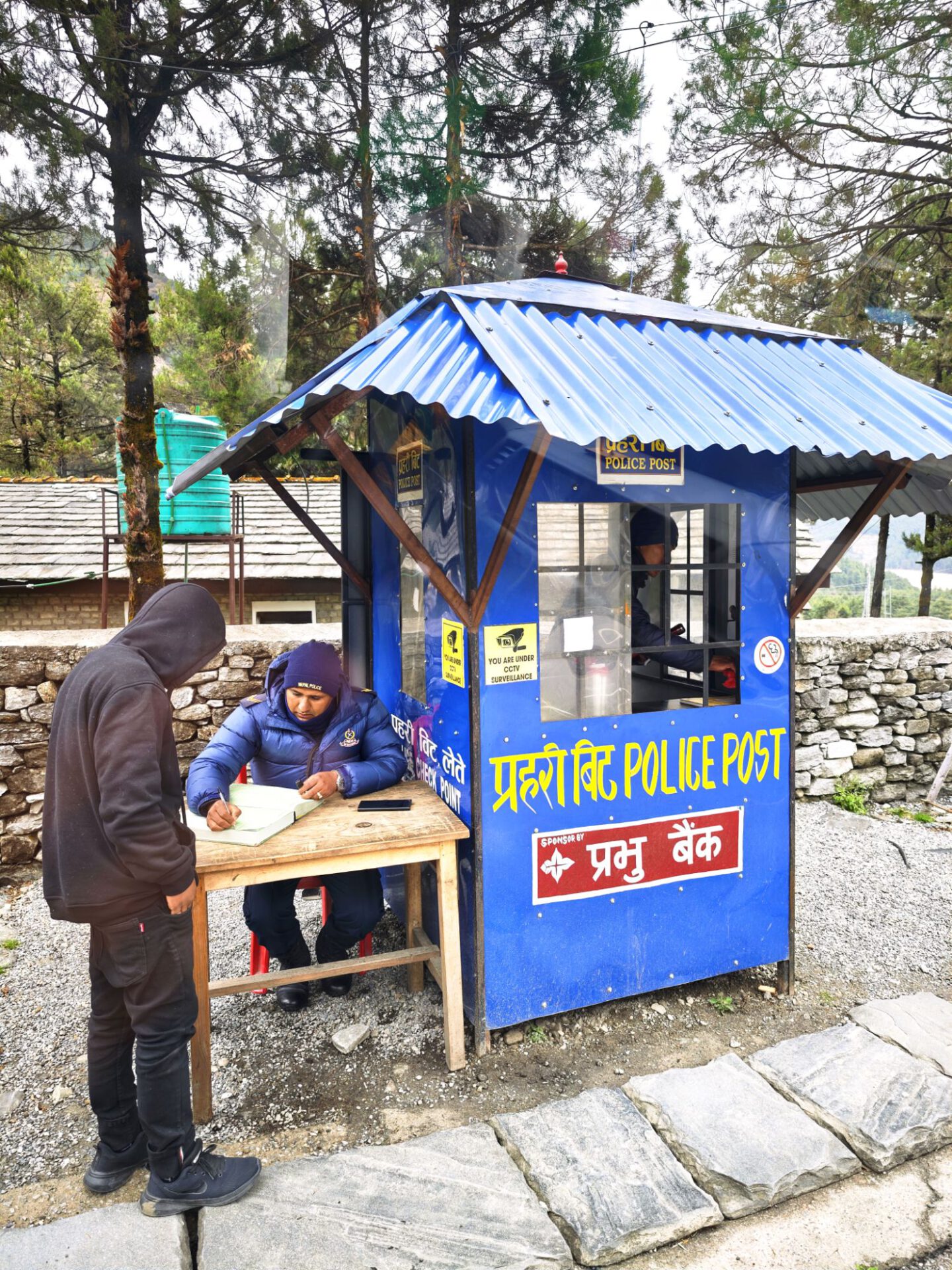 Am Haupttempel komme ich mit einem Polizist der Nepal Police ins Gespräch, der mit einem Kollegen in der Anlage für Ordnung sorgt. Zu seiner Dienststelle im Nachbardorf, sagt er lächelnd, gehören zehn Beamte. Er selbst macht jeden Tag, das ganze Jahr über, Dienst am Tempel. Und mag es. Zu seiner schicken blauen Uniform gehört eine dicke Daunenjacke. An manchen Tagen, sagt er, ist es richtig kalt. Während der Lichtzeremonie am Abend schlägt er laut und ausdauernd die große Glocke. Auch ich kann an der Zeremonie teilnehmen. Nach dem eigentlichen Arati gehört dazu drei Mal zeremoniell den Tempel zu umrunden. Barfuß auf 3.800 Meter Höhe. Es beginnt leicht zu schneien.