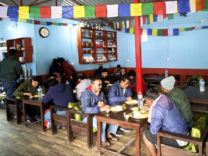 Auch beim Abendessen im kleinen Restaurant fragt mich der Wirt woher ich komme und was ich mache. Dass ich zu Fuß nach Muktinath gegangen bin gefällt ihm: Er kommt aus einem kleinen Dorf an meiner letzten Etappe. Er setzt sich zu mir, sieht sich mit mir meine Fotos vom Weg an und erzählt mir manches dazu. Er zeigt mir ein Glas mit den schwarzen Bohnen aus denen mein Dal gemacht ist. Im Dorf auf 3.500 Meter Höhe gewachsen. „Very healthy“.