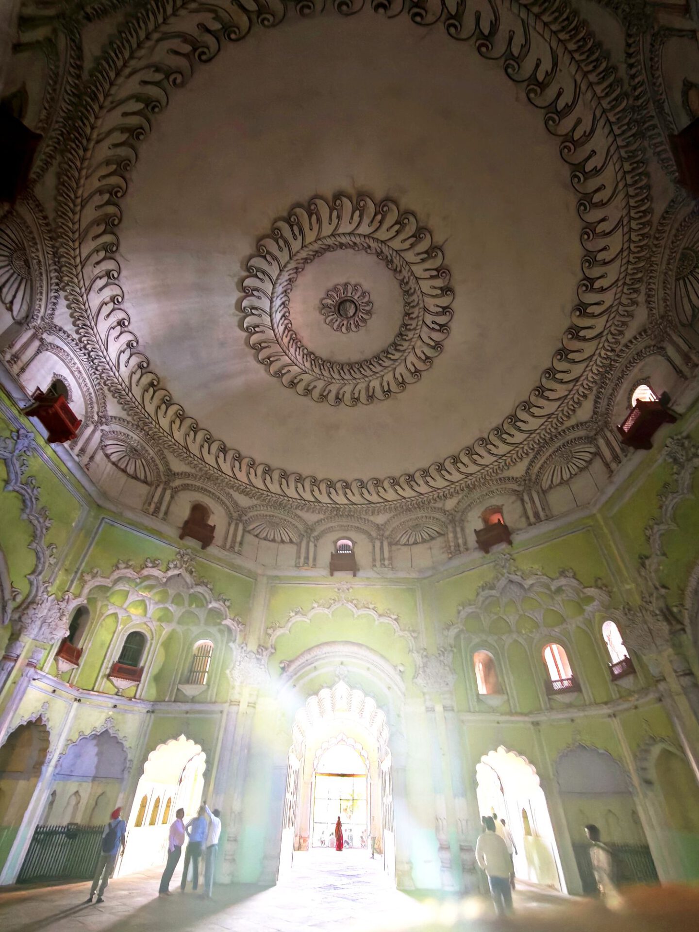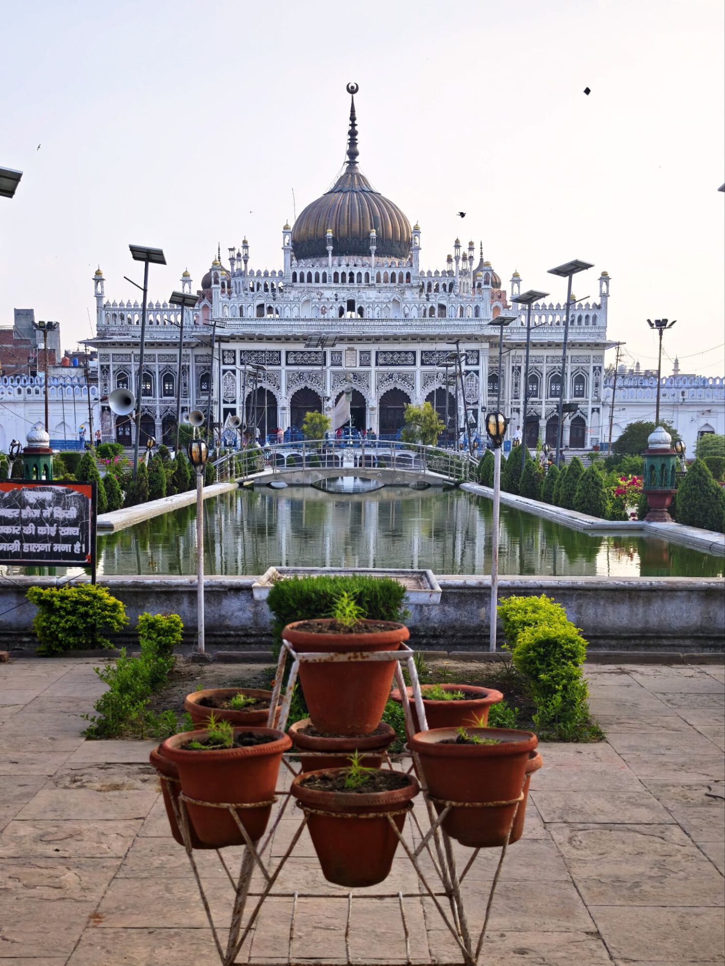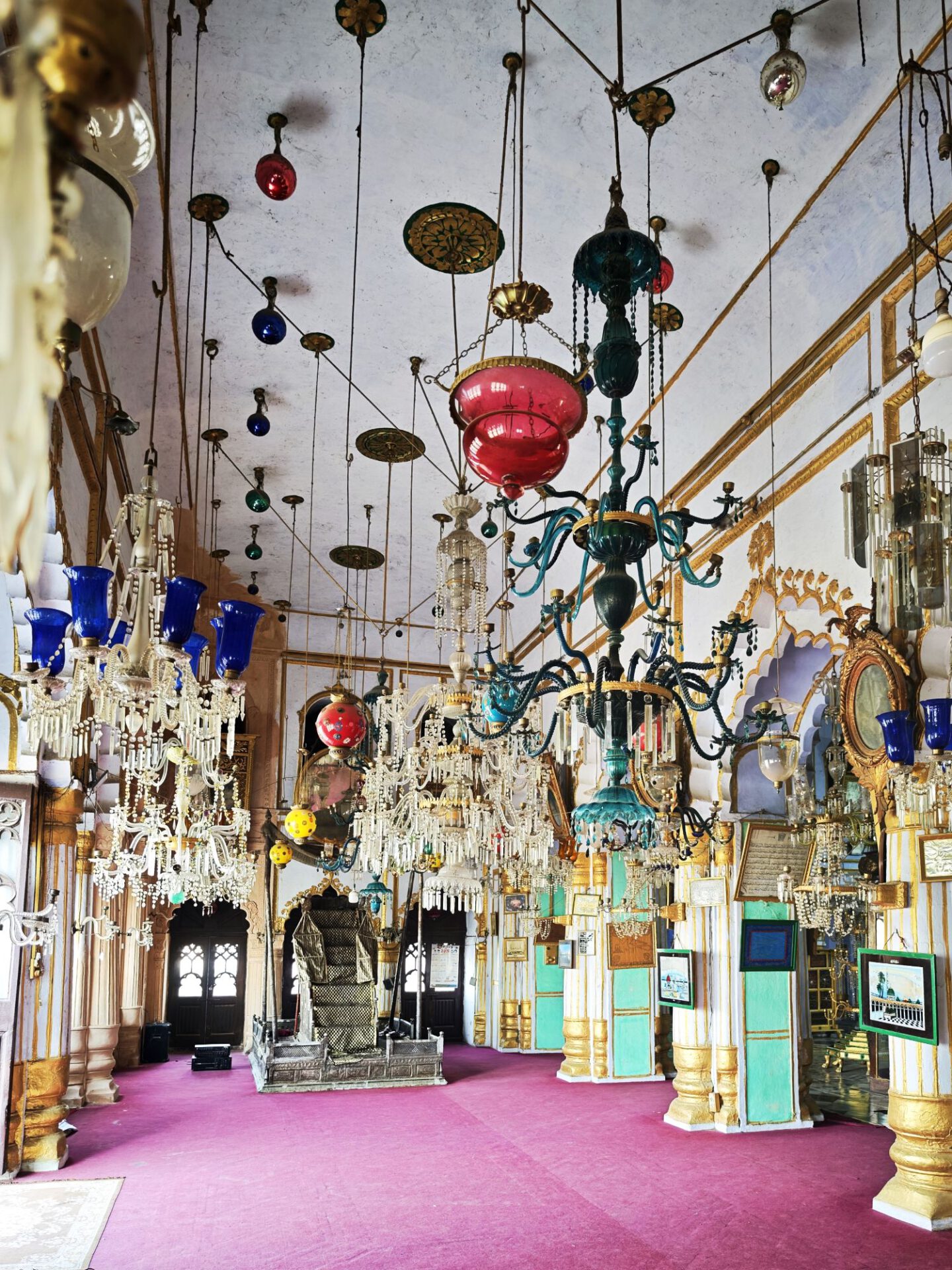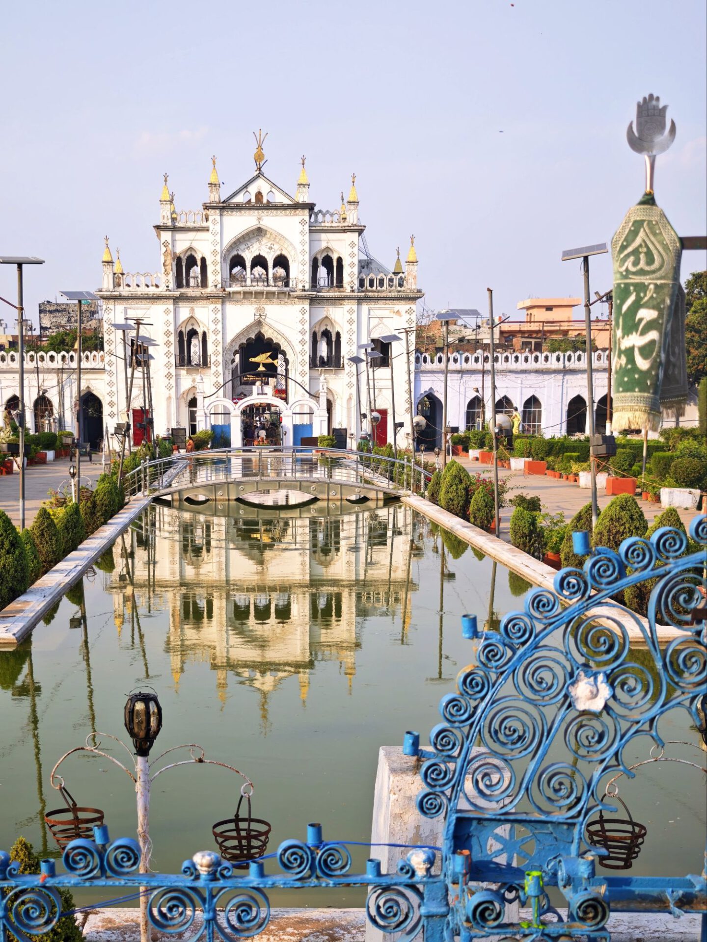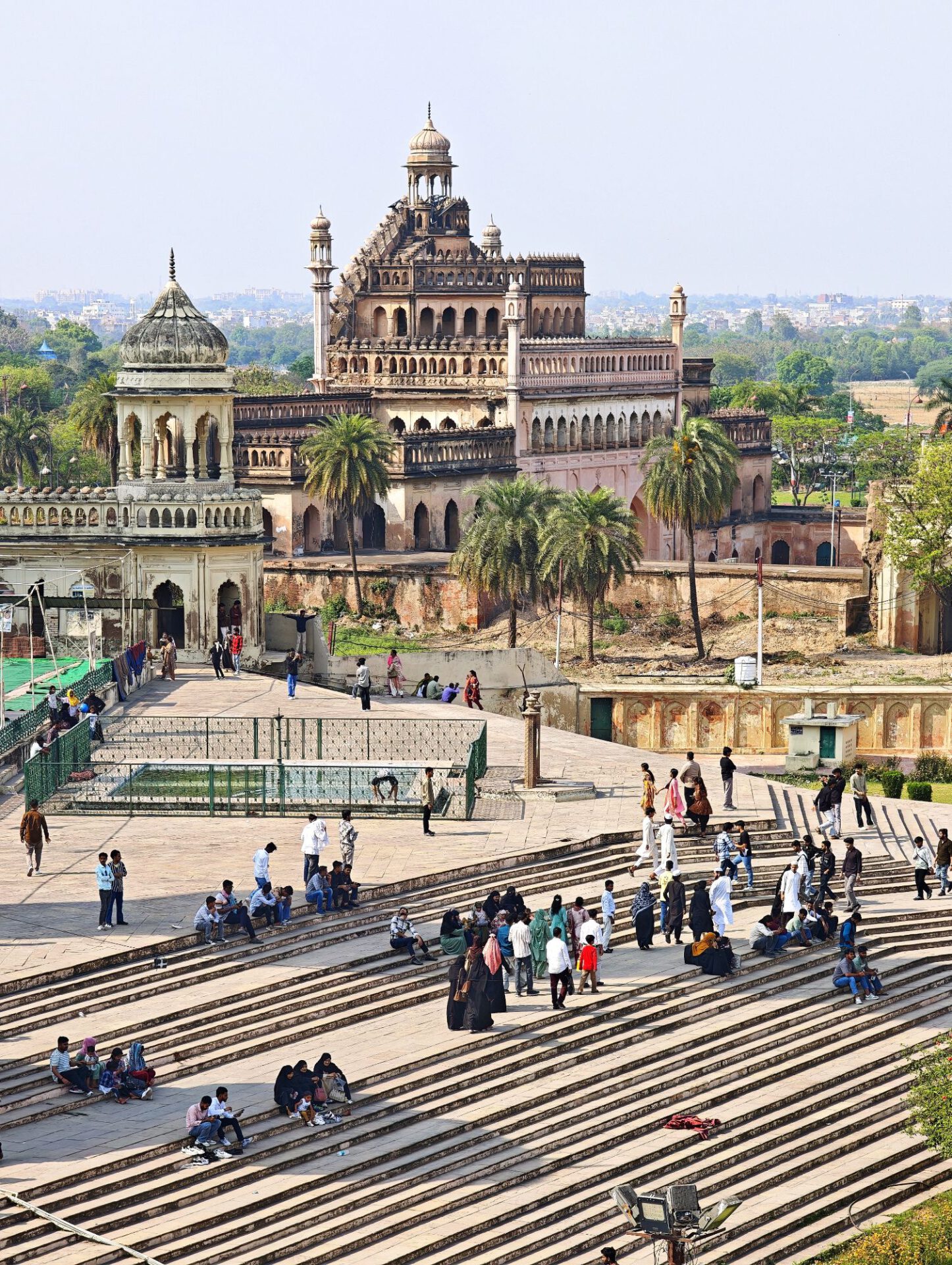 Lucknow, Hauptstadt des Bundesstaates Uttar Pradesh, rund drei Millionen Einwohner, wahrscheinlich mehr. Auf der Durchreise habe ich nur einen halben Tag dafür geplant, aber meine Tage können lang sein. Die Sehenswürdigkeiten aus der Zeit der späten Mogule, 18. bis 19. Jahrhundert, konzentrieren sich auf das Stadtzentrum. Ich konzentriere mich heute nicht auf Tempel, sondern auf zwei außergewöhnliche Imambaras, schiitisch islamische Versammlungs- und Gedenkstätten. Die Halle der Bara Imambara ist riesig, ihre Gewölbedecke gehört zu den größten stützenlosen der Welt. Darüber befindet sich, unter zwei schönen Dachterrassen, ein dreidimensionales, d.h. sich über drei Stockwerke erstreckendes Labyrinth. Aus solches nehme ich es zunächst nicht sehr ernst, beinahe kostet mich das meinen halben Tag. Die kleinere Chhota Imambara glänzt mit ihrer Innenausstattung: „Palace of Lights“. Die Lage auf unserer Welt bleibt in den islamischen Heiligtümern nicht außen vor: Schmähende israelische und amerikanische Flaggen kleben auf Mülleimern.