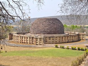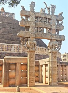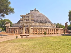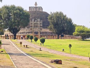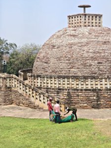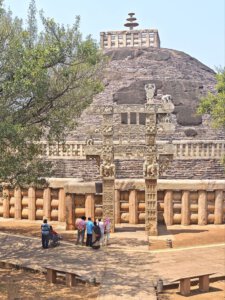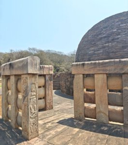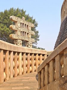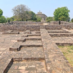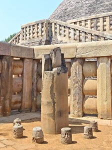Warum Kaiser Ashoka, glühender Buddha Verehrer, um das Jahr 250 vor Christus die Heiligtümer ausgerechnet hier, einem Platz der mit dem Leben des historischen Buddha nichts zu tun hat, bauen ließ ist nicht bekannt. Aber die Lage auf einem Hügel über dem weiten, flachen Land ist sehr schön. Da im Stupa No 2 Reliquien der ersten Schüler Buddhas gefunden wurden, ist davon auszugehen, dass sich in der großen Stupa No 1 Reliquien ihres Lehrers befinden. Die vier Tore zum Umgang dieses Stupa sind wunderschön gestaltet. Zwischen den drei größeren Stupas befinden sich weitere kleinere und eine Vielzahl Ruinen und Grundmauern von Tempeln und Klöstern aus den ersten Jahrhunderten vor und nach Christi Geburt. Nach dem Niedergang des Buddhismus in Indien im 12. Jahrhundert gerieten die Anlage, das Dorf und die Gegend in Vergessenheit. Und blieb so weitere fast tausend Jahre erstaunlich gut erhalten. Wieder ist die Ruhe und Gelassenheit der buddhistischen Heiligtümer zu spüren, eine andere Energie als in den mythisch aufgeladenen hinduistischen Tempeln.