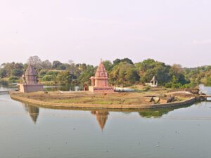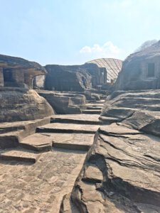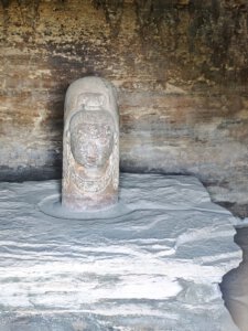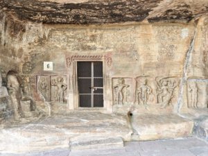 Der Wirt im Restaurant/Imbiss gibt mir den Tipp, dass ich nicht nur Sanchi, sondern auch die nahen Udayagiri Caves besuchen sollte. Und behält Recht damit. Die etwa 20 kleinen Höhlen und Nischen wurden in der Zeit vom frühen 3. bis 5. Jahrhundert n. Chr. in den Fels eines Hügels geschlagen. Sie enthalten einige der ältesten erhaltenen hinduistischen Tempel und Bildwerke Indiens. Höhle No 5 ist berühmt für das monumentale Varaha-Relief: Vishnu erscheint in seiner Gestalt als Eber-Avatar Varaha, der die Erdgöttin aus der kosmischen Flut rettet. Der Tempel wurde im Jahr 401 geweiht. Der sitzende Ganesha vor Höhle No 6 gehört zu den frühesten bekannten Ganesha-Darstellungen überhaupt.