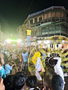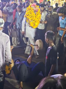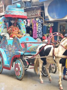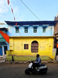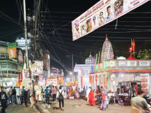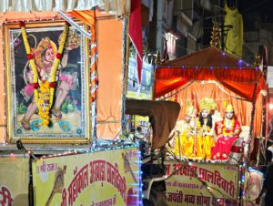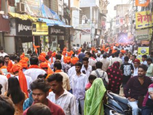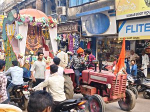 Zurück nach Vidisha gehe ich zu Fuß. Erst zwischen Getreidefeldern und dann durch die Straßen der Stadt. Viele Gottheiten, viele Göttergeburtstage: Auch das Gedränge vor dem Tempel am Vormittag wird erklärlich: Es ist der Vollmondtag des Hindumonats Chaitra. Hanuman Jayanti: Der „Affengott“ Hanuman wird gefeiert. Er steht für Loyalität, Entschlossenheit und Stärke. Stärke wird auch beim Umzug demonstriert. Und Lautstärke.