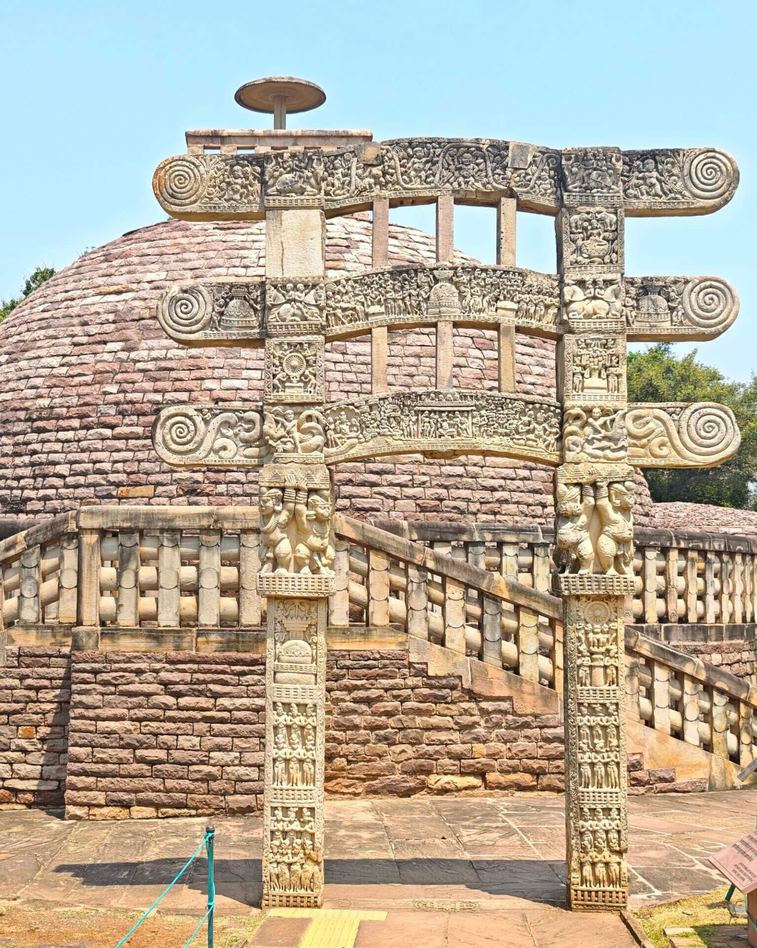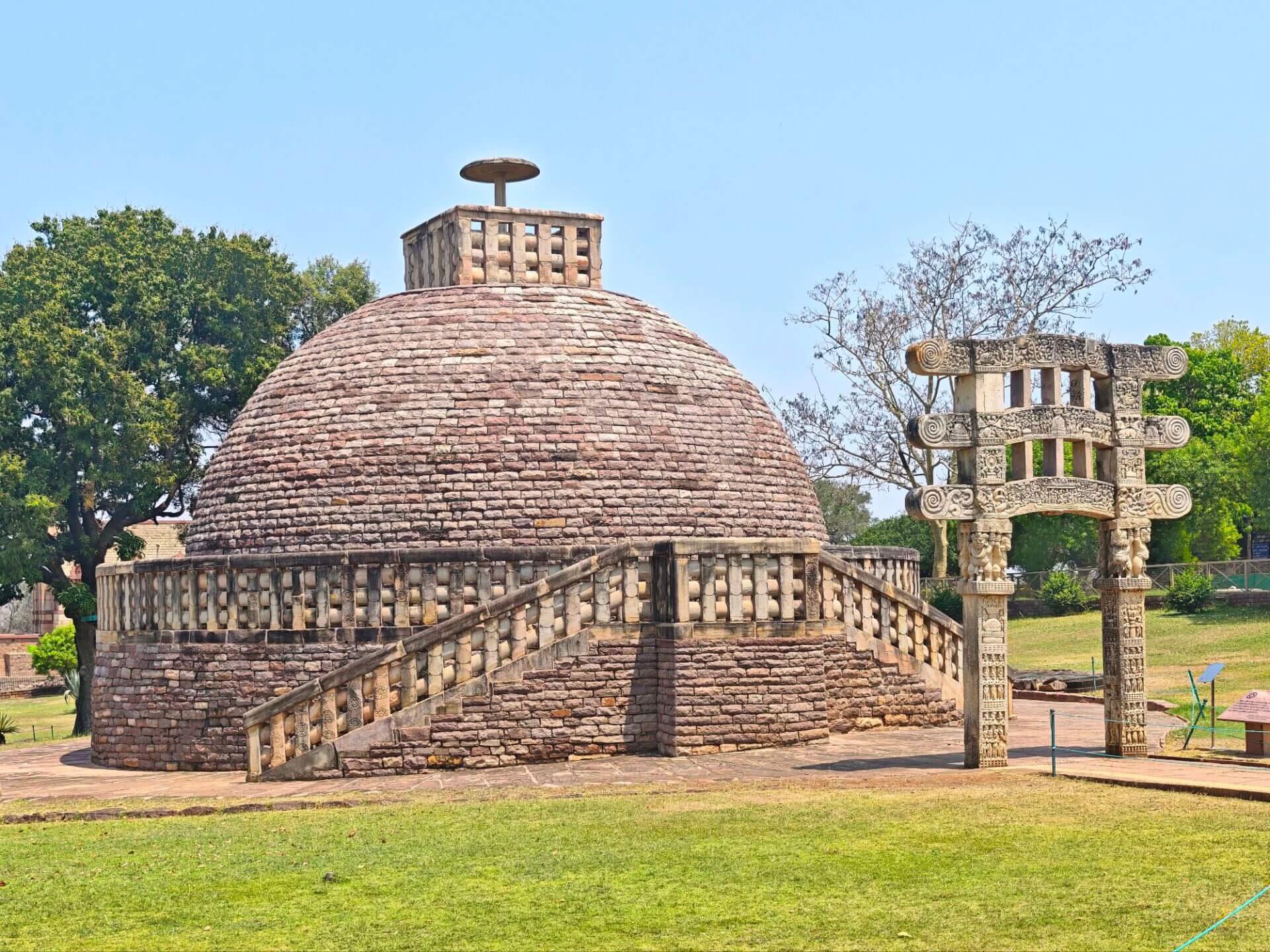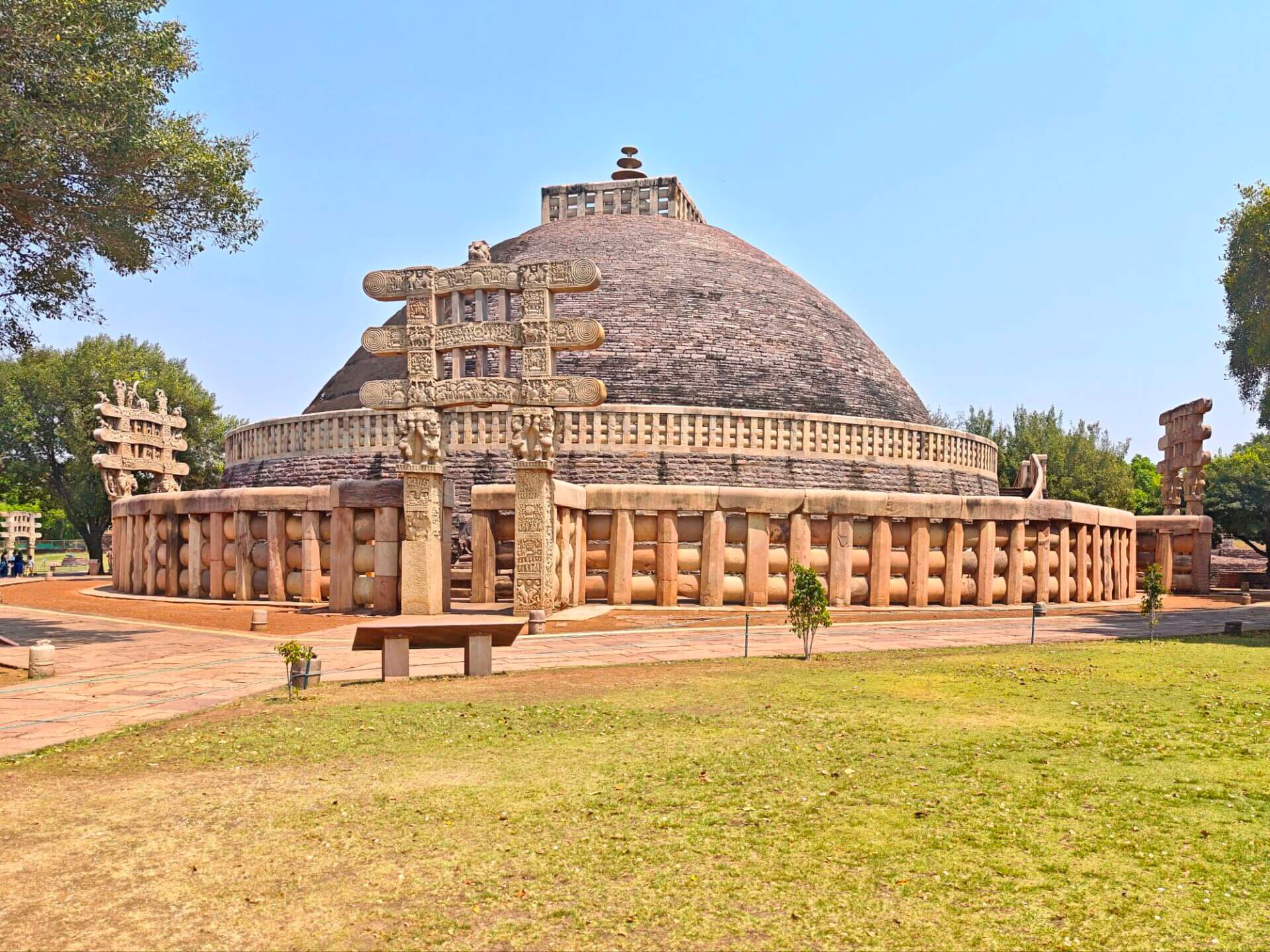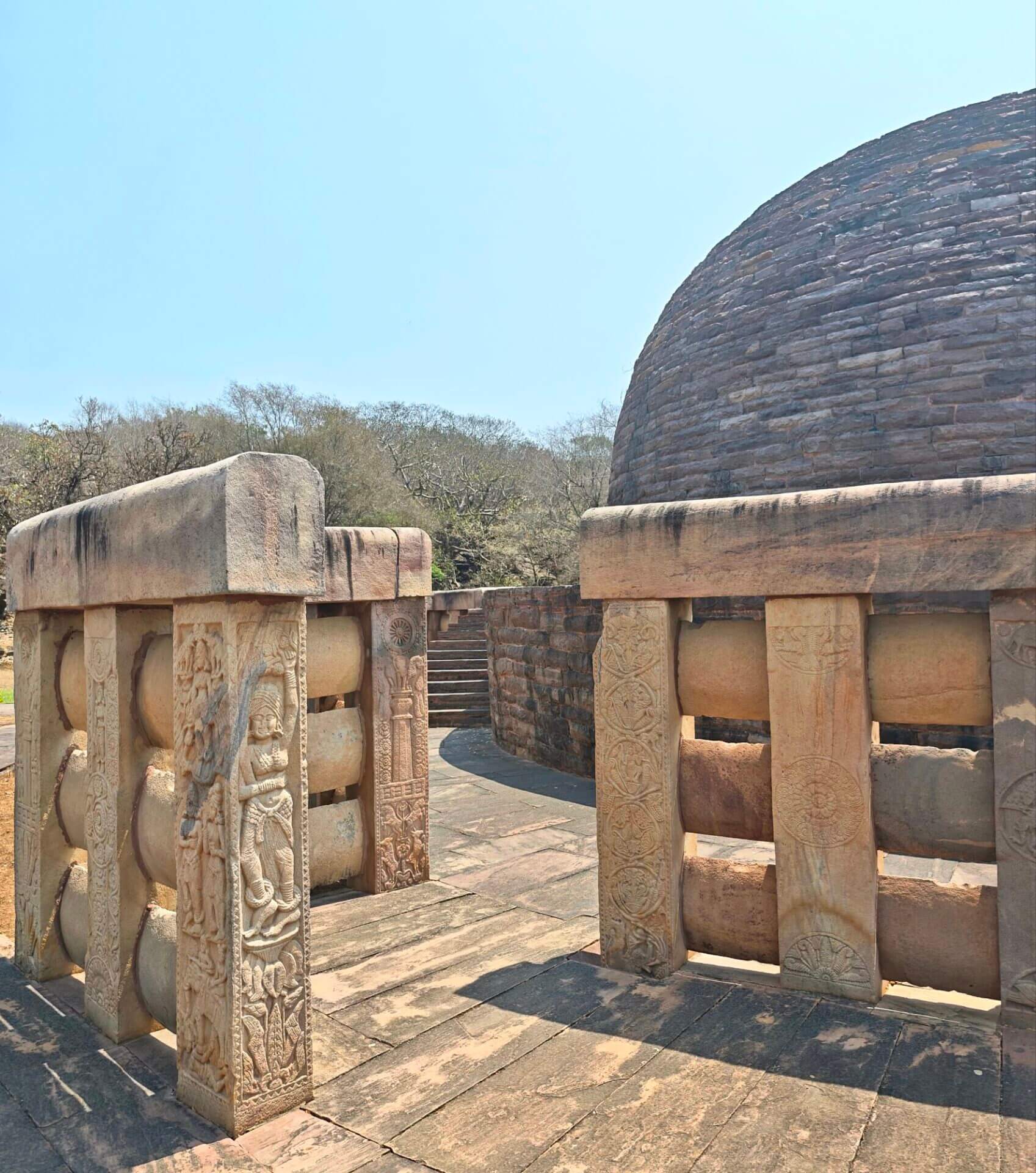 Warum Kaiser Ashoka, glühender Buddha Verehrer, um das Jahr 250 vor Christus die Heiligtümer ausgerechnet hier, einem Platz der mit dem Leben des historischen Buddha nichts zu tun hat, bauen ließ ist nicht bekannt. Aber die Lage auf einem Hügel über dem weiten, flachen Land ist sehr schön. Da im Stupa No 2 Reliquien der ersten Schüler Buddhas gefunden wurden, ist davon auszugehen, dass sich in der großen Stupa No 1 Reliquien ihres Lehrers befinden. Die vier Tore zum Umgang dieses Stupa sind wunderschön gestaltet. Zwischen den drei größeren Stupas befinden sich weitere kleinere und eine Vielzahl Ruinen und Grundmauern von Tempeln und Klöstern aus den ersten Jahrhunderten vor und nach Christi Geburt. Nach dem Niedergang des Buddhismus in Indien im 12. Jahrhundert gerieten die Anlage, das Dorf und die Gegend in Vergessenheit. Und blieb so weitere fast tausend Jahre erstaunlich gut erhalten. Wieder ist die Ruhe und Gelassenheit der buddhistischen Heiligtümer zu spüren, eine andere Energie als in den mythisch aufgeladenen hinduistischen Tempeln.