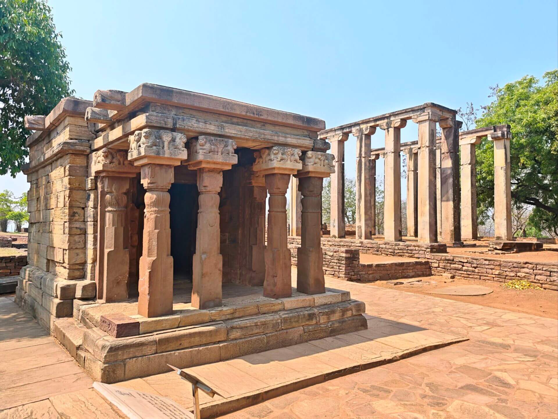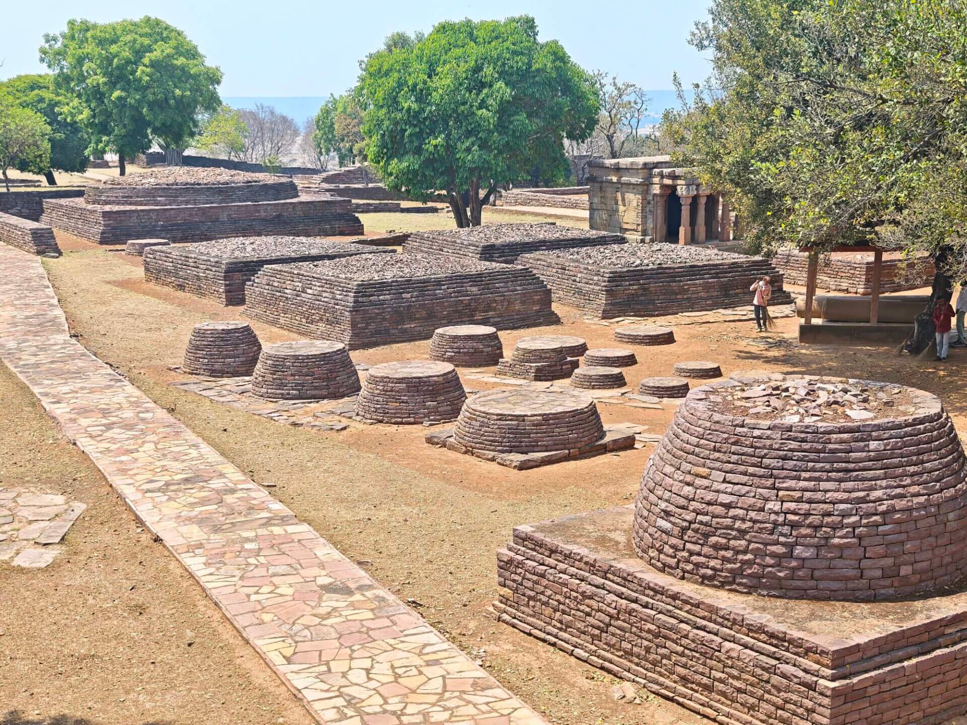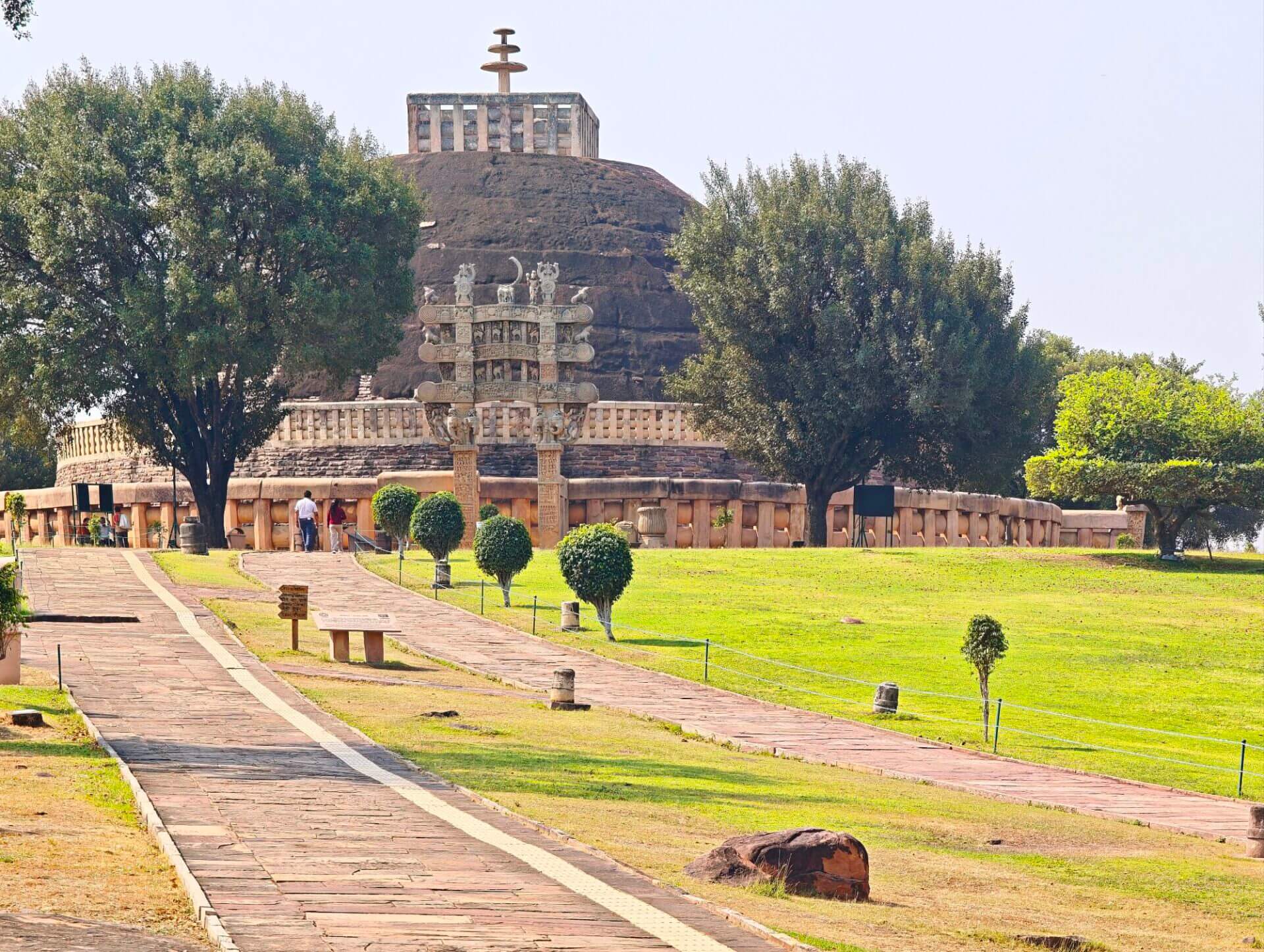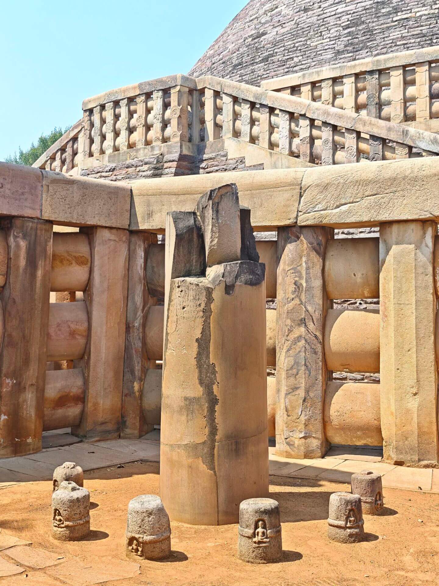 Warum Kaiser Ashoka, glühender Buddha Verehrer, um das Jahr 250 vor Christus die Heiligtümer ausgerechnet hier, einem Platz der mit dem Leben des historischen Buddha nichts zu tun hat, bauen ließ ist nicht bekannt. Aber die Lage auf einem Hügel über dem weiten, flachen Land ist sehr schön. Da im Stupa No 2 Reliquien der ersten Schüler Buddhas gefunden wurden, ist davon auszugehen, dass sich in der großen Stupa No 1 Reliquien ihres Lehrers befinden. Die vier Tore zum Umgang dieses Stupa sind wunderschön gestaltet. Zwischen den drei größeren Stupas befinden sich weitere kleinere und eine Vielzahl Ruinen und Grundmauern von Tempeln und Klöstern aus den ersten Jahrhunderten vor und nach Christi Geburt. Nach dem Niedergang des Buddhismus in Indien im 12. Jahrhundert gerieten die Anlage, das Dorf und die Gegend in Vergessenheit. Und blieb so weitere fast tausend Jahre erstaunlich gut erhalten. Wieder ist die Ruhe und Gelassenheit der buddhistischen Heiligtümer zu spüren, eine andere Energie als in den mythisch aufgeladenen hinduistischen Tempeln.