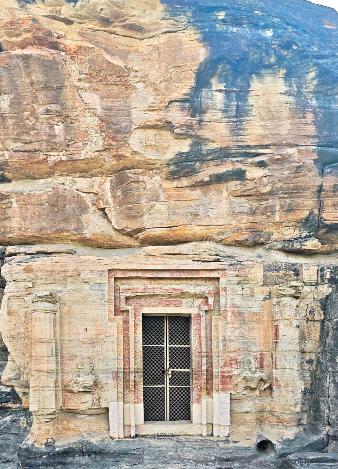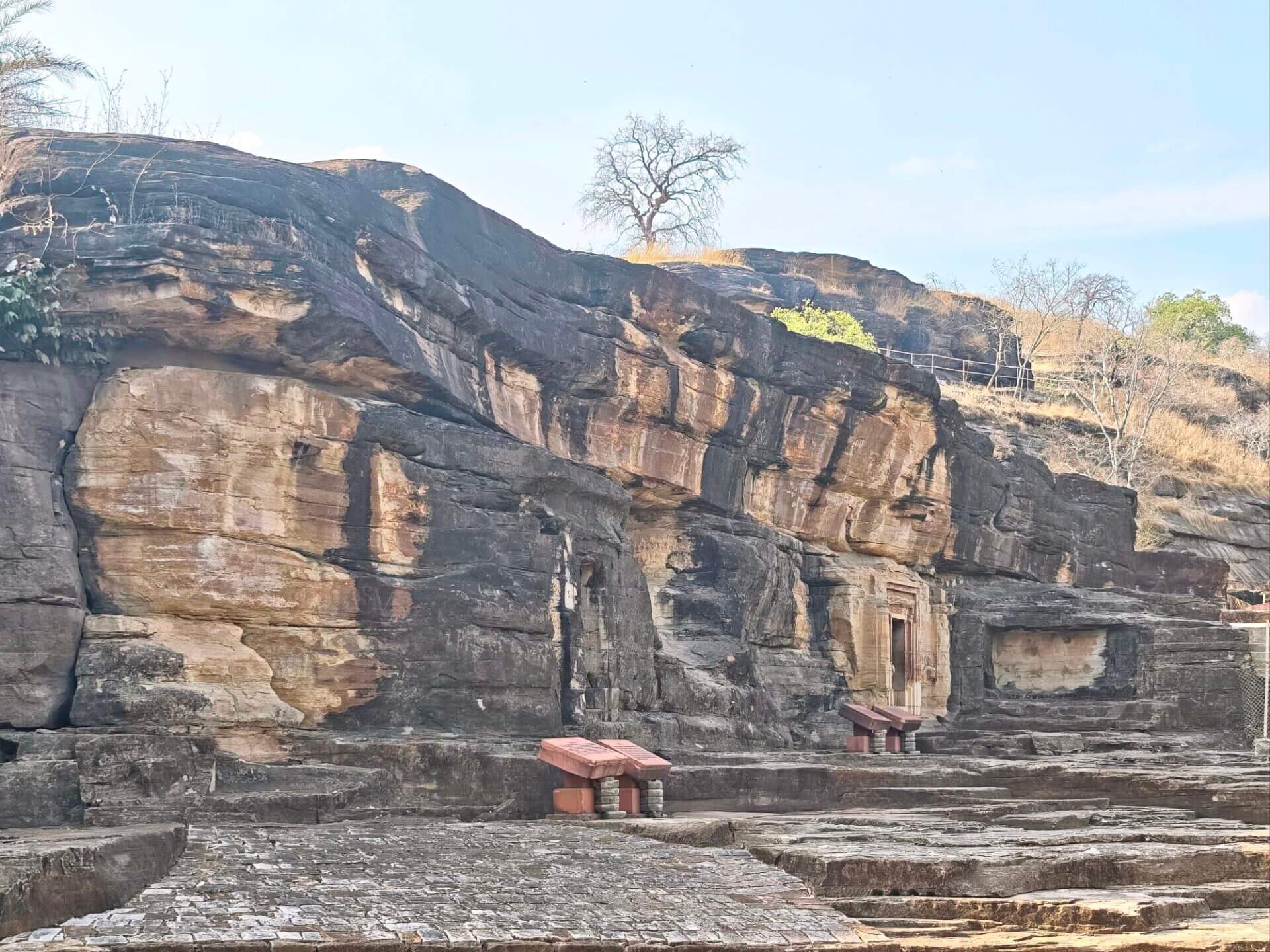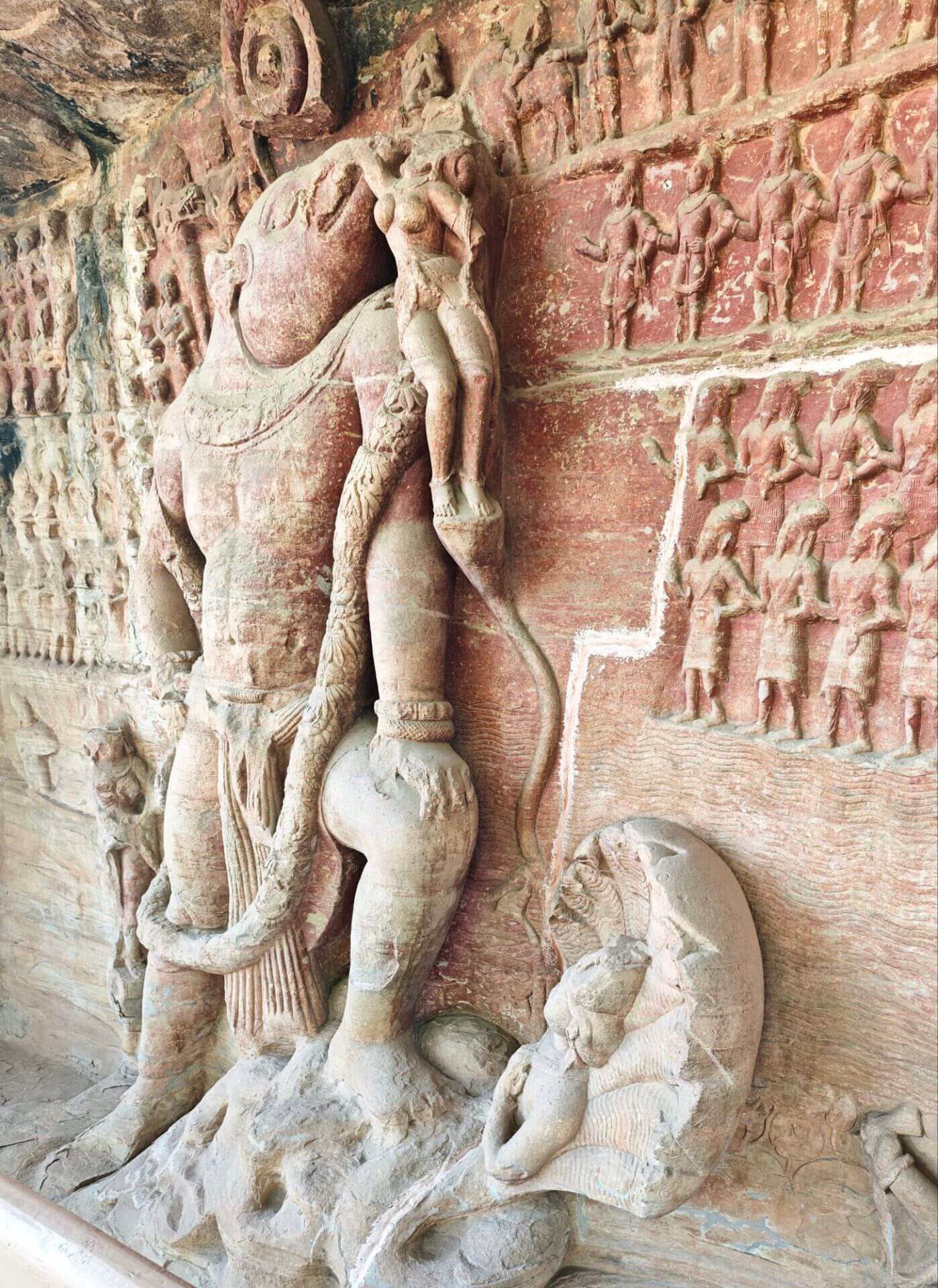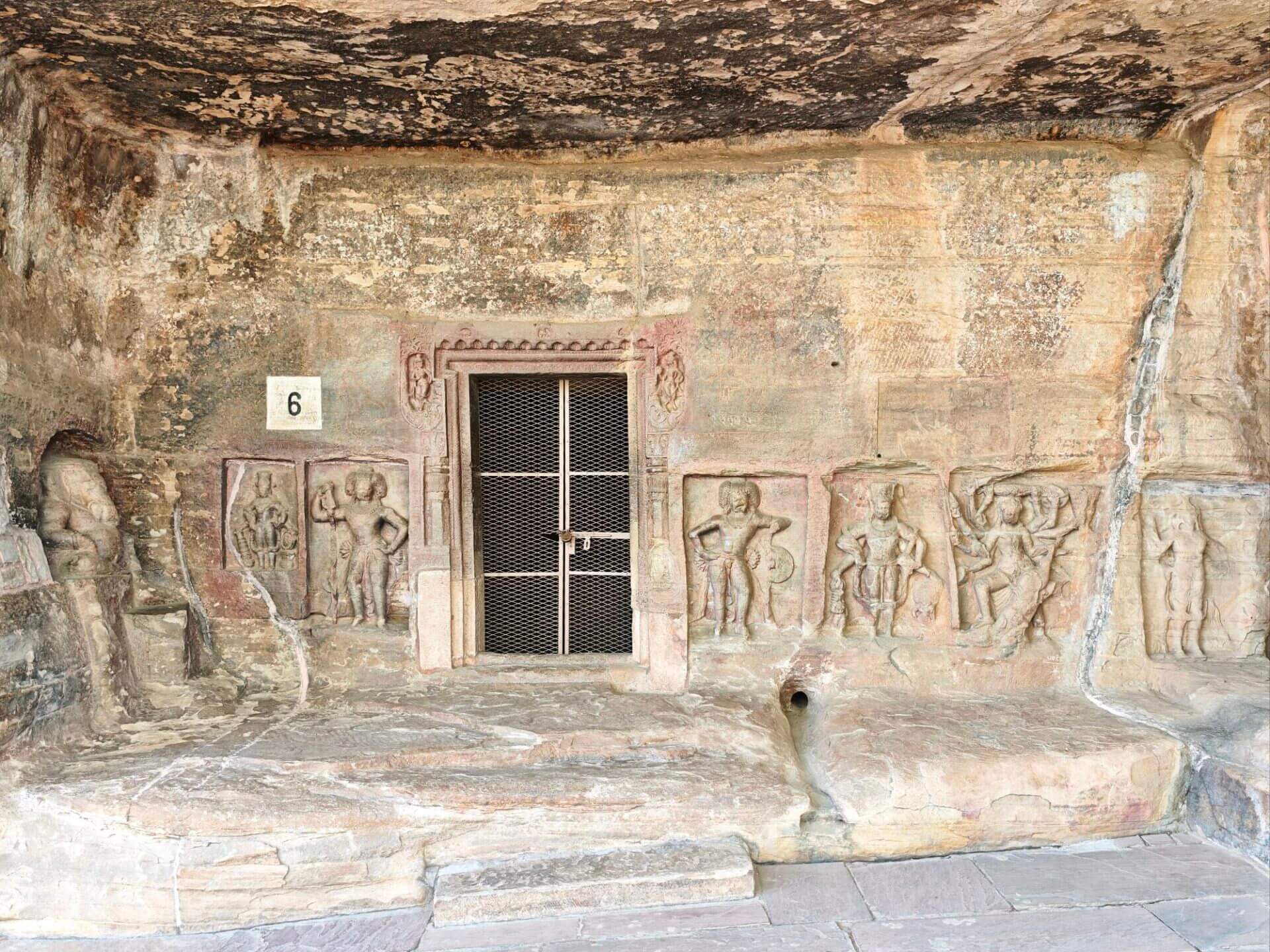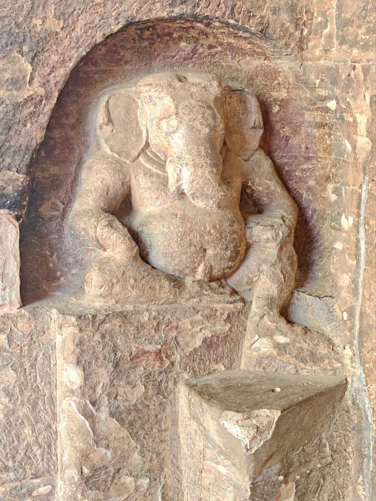 Der Wirt im Restaurant/Imbiss gibt mir den Tipp, dass ich nicht nur Sanchi, sondern auch die nahen Udayagiri Caves besuchen sollte. Und behält Recht damit. Die etwa 20 kleinen Höhlen und Nischen wurden in der Zeit vom frühen 3. bis 5. Jahrhundert n. Chr. in den Fels eines Hügels geschlagen. Sie enthalten einige der ältesten erhaltenen hinduistischen Tempel und Bildwerke Indiens. Höhle No 5 ist berühmt für das monumentale Varaha-Relief: Vishnu erscheint in seiner Gestalt als Eber-Avatar Varaha, der die Erdgöttin aus der kosmischen Flut rettet. Der Tempel wurde im Jahr 401 geweiht. Der sitzende Ganesha vor Höhle No 6 gehört zu den frühesten bekannten Ganesha-Darstellungen überhaupt.