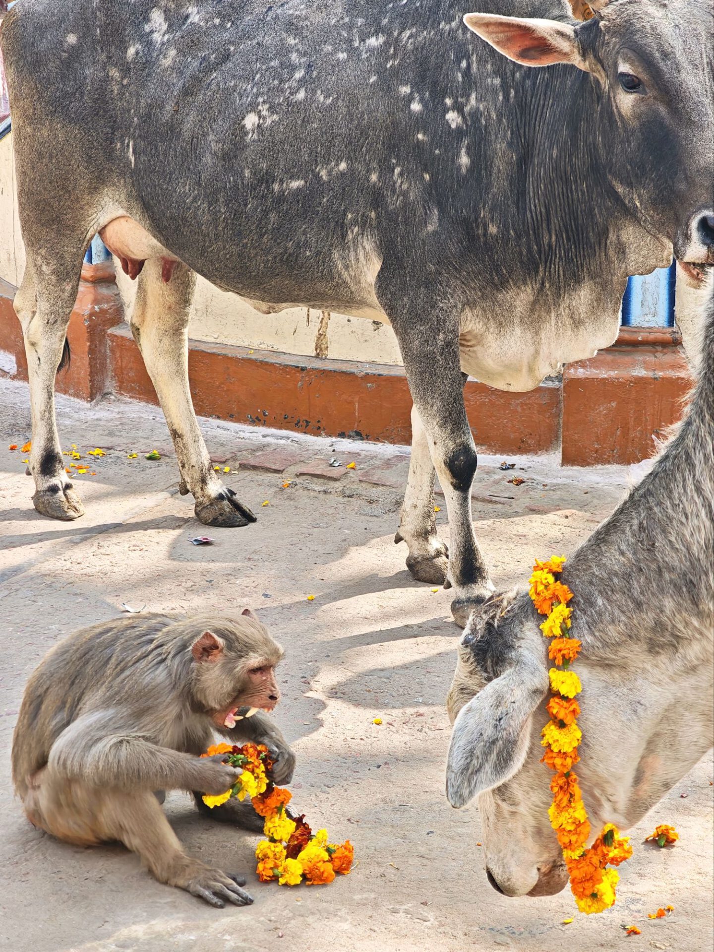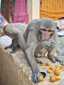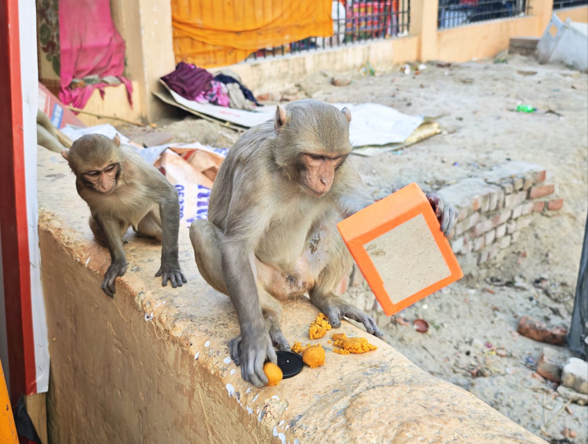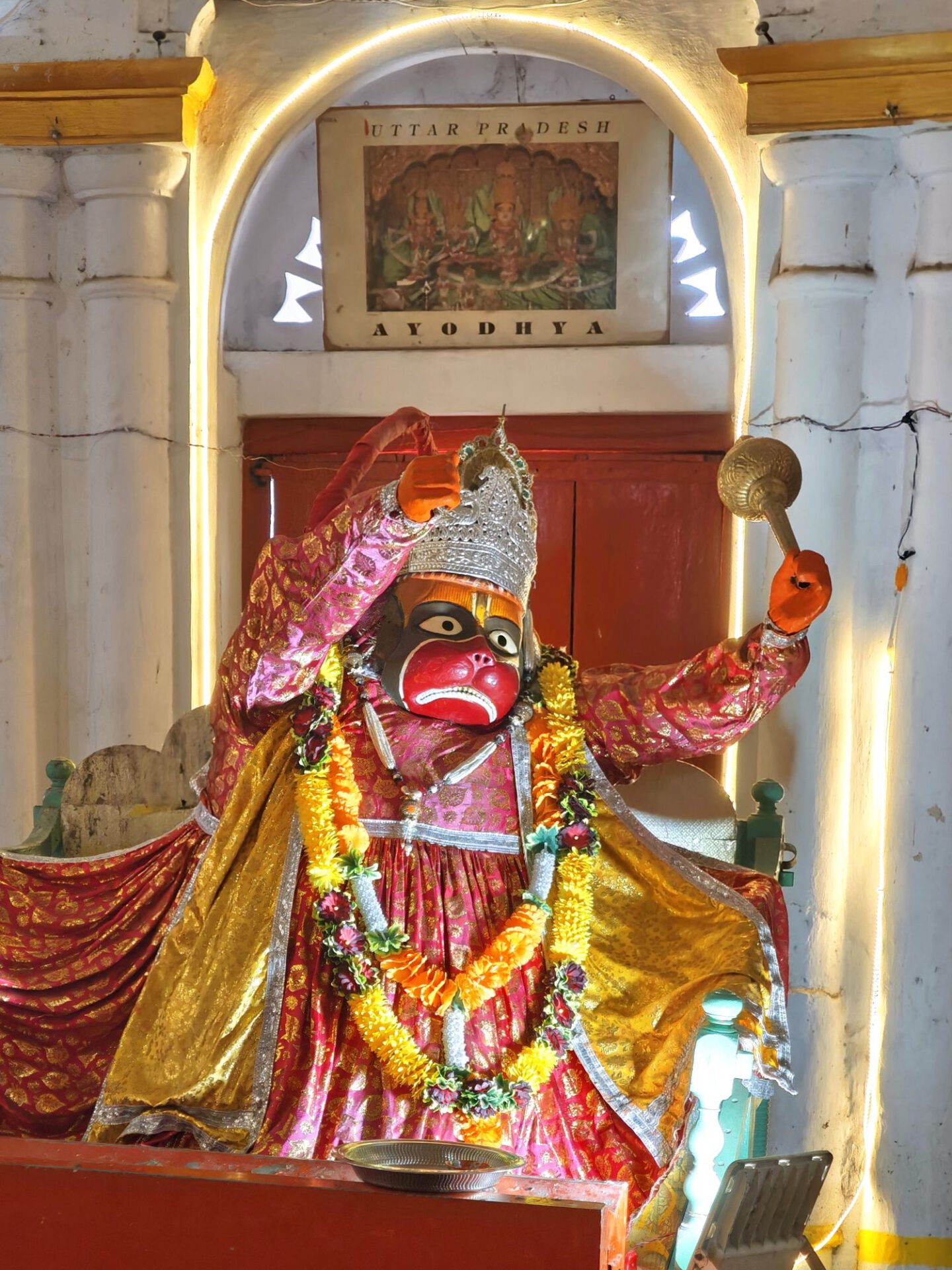 Ayodhya gehört wie Varanasi zu den Sapta Puri, den sieben heiligen Orten des Hinduismus: Wichtiges Pilgerziel und verehrt als Geburtsort von Lord Rama, dem siebten Avatar von Gott Vishnu. Zentral sind zum einen auch hier die Ghats, diesmal am Fluss Ghagara, der in Tibet entspringt, durch Nepal fließt und nach über 1000 Kilometern in den Ganges münden wird. Neben Rama wird hier besonders sein treuester Diener, Affengott Hanuman, verehrt. Der Affe am Bahnsteig in Gorakhpur war nur eine Vorhut: Hier in Ayodhya sind sie plötzlich überall. Dass mir einer, als ich beim Fotografieren kurz nicht darauf achte, blitzschnell die halb volle Schachtel Ladoo wegnimmt (und gleich gezielt aufreißt): Geschenkt, ich hätte damit rechnen müssen. Aber den dabei steckenden Objektivdeckel hole ich trotz seiner gefletschten Zähne zurück, da kenne ich keinen Spaß.