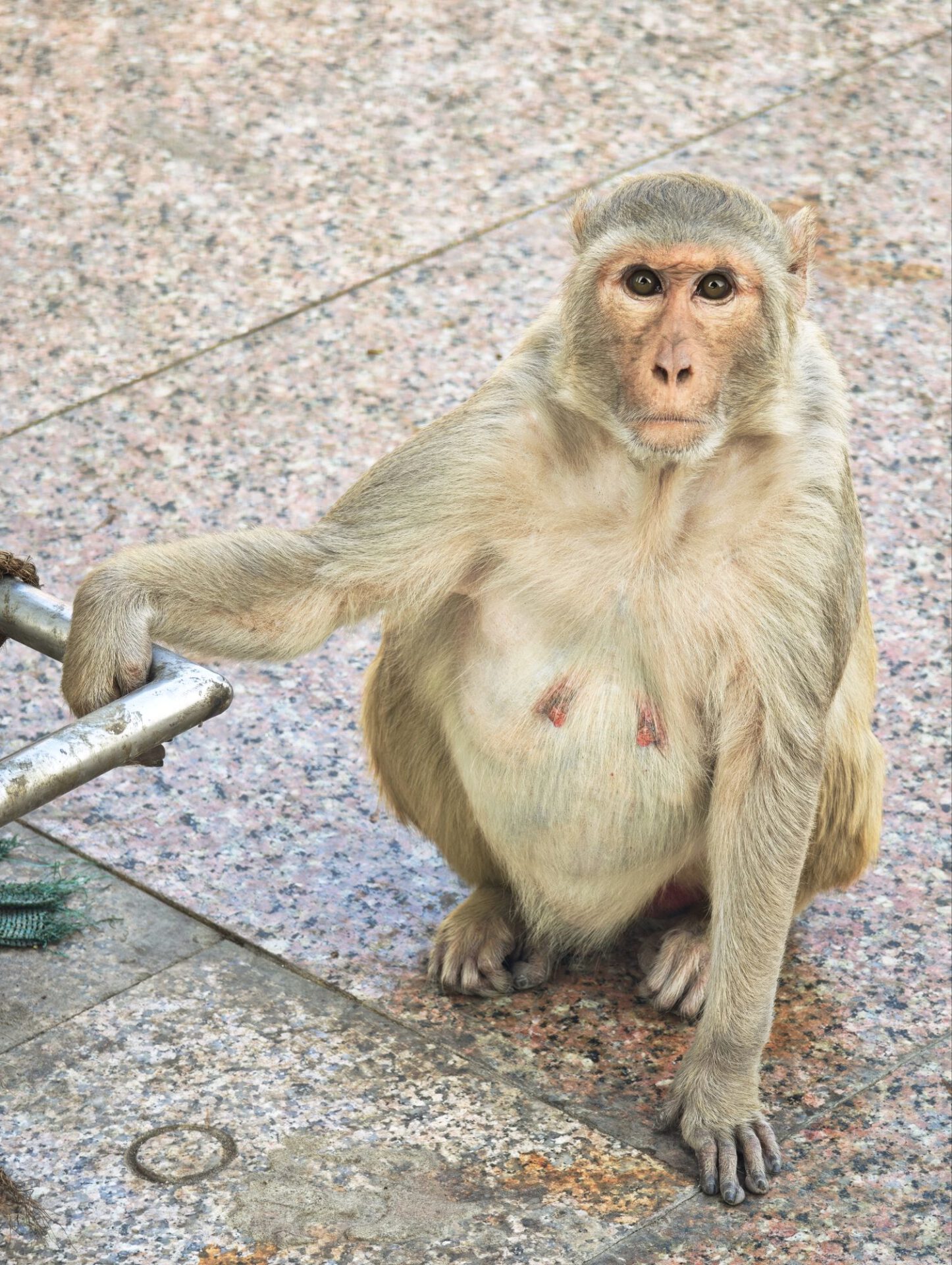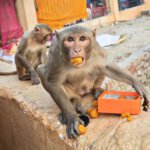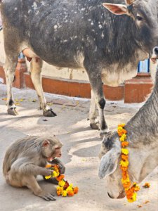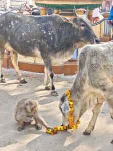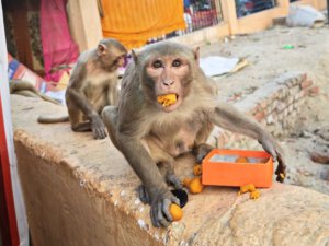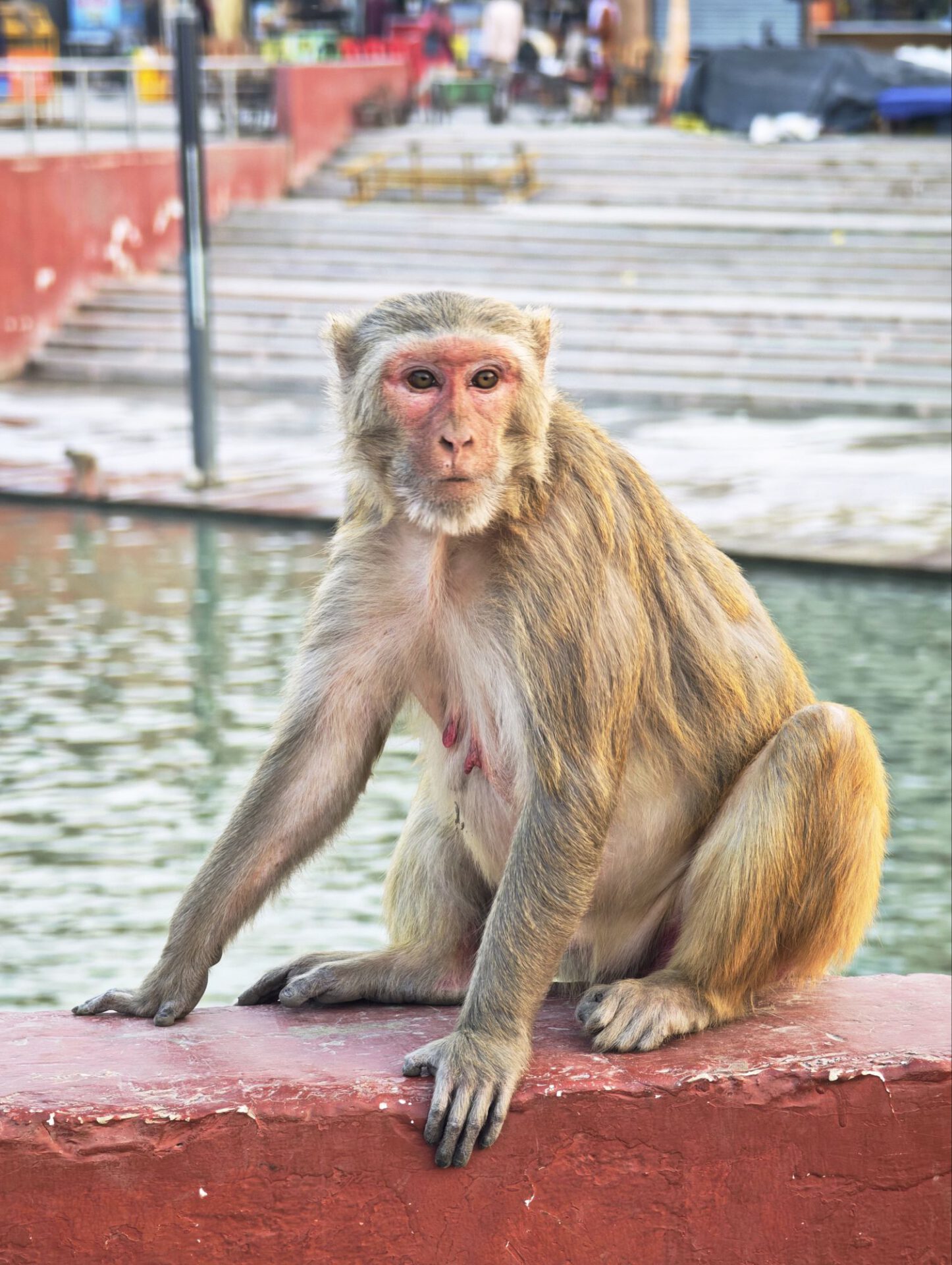 Ayodhya gehört wie Varanasi zu den Sapta Puri, den sieben heiligen Orten des Hinduismus: Wichtiges Pilgerziel und verehrt als Geburtsort von Lord Rama, dem siebten Avatar von Gott Vishnu. Zentral sind zum einen auch hier die Ghats, diesmal am Fluss Ghagara, der in Tibet entspringt, durch Nepal fließt und nach über 1000 Kilometern in den Ganges münden wird. Neben Rama wird hier besonders sein treuester Diener, Affengott Hanuman, verehrt. Der Affe am Bahnsteig in Gorakhpur war nur eine Vorhut: Hier in Ayodhya sind sie plötzlich überall. Dass mir einer, als ich beim Fotografieren kurz nicht darauf achte, blitzschnell die halb volle Schachtel Ladoo wegnimmt (und gleich gezielt aufreißt): Geschenkt, ich hätte damit rechnen müssen. Aber den dabei steckenden Objektivdeckel hole ich trotz seiner gefletschten Zähne zurück, da kenne ich keinen Spaß.