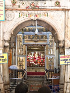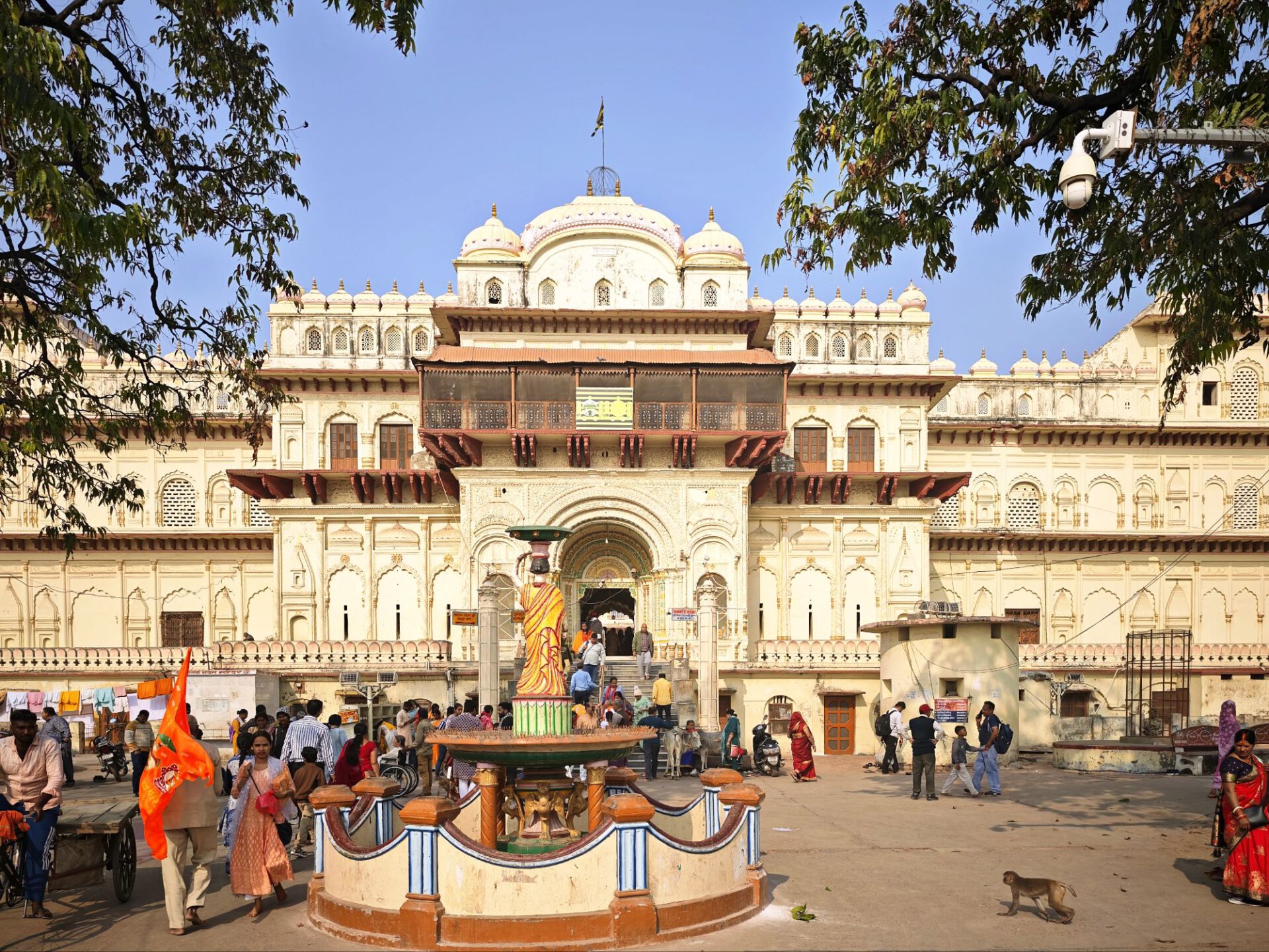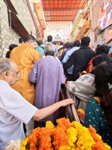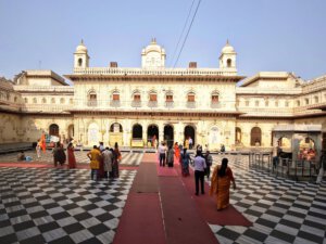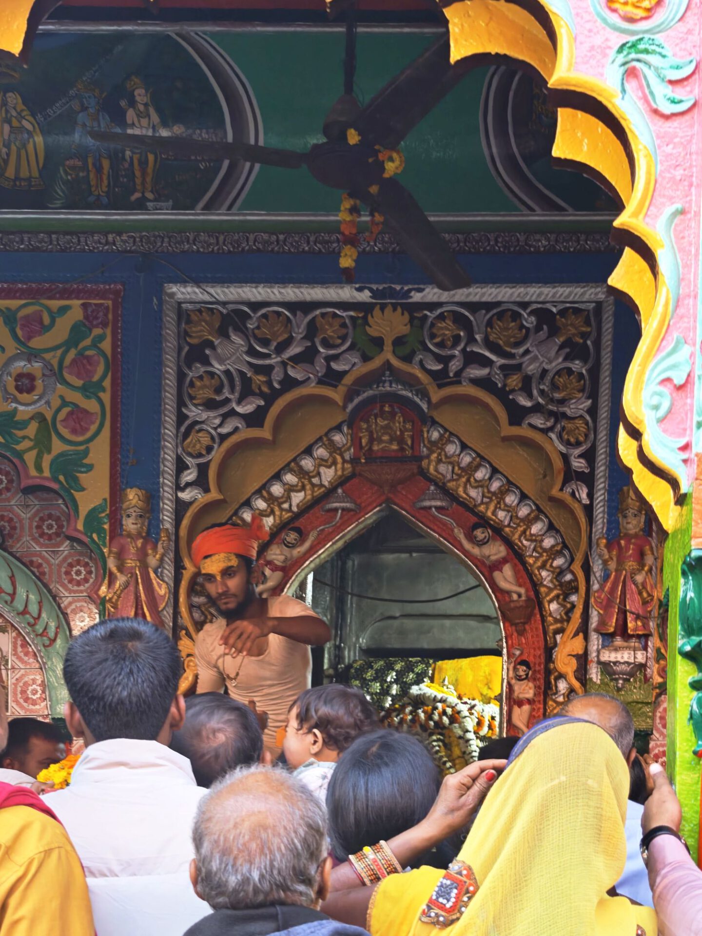 Gleich danach im Stellenwert der Pilger kommt der Hanuman Tempel aus dem 18. Jahrhundert. Kontrollen und Schleusung gibt es hier nicht, das Gedränge ist wieder brutal. Von der alten Hanuman -Skulptur bekomme ich lediglich einen Berg Blüten zu sehen. Einen schönen ruhigen Besuch habe ich hingegen am nächsten Morgen im Tempel Kanak Bhawan (Goldener Palast), einem palastartigen Bau aus dem 19. Jahrhundert, der der Legende nach auf den Palast von Lord Hanuman und Sita zurückgehen soll. Den Zugang zum traditionellen Shri Rajdwar Mandir, ebenfalls Rama geweiht, entdecke ich eher zufällig und bin dort fast allein.