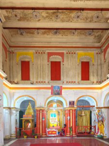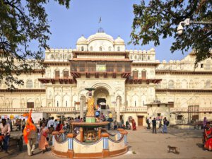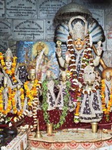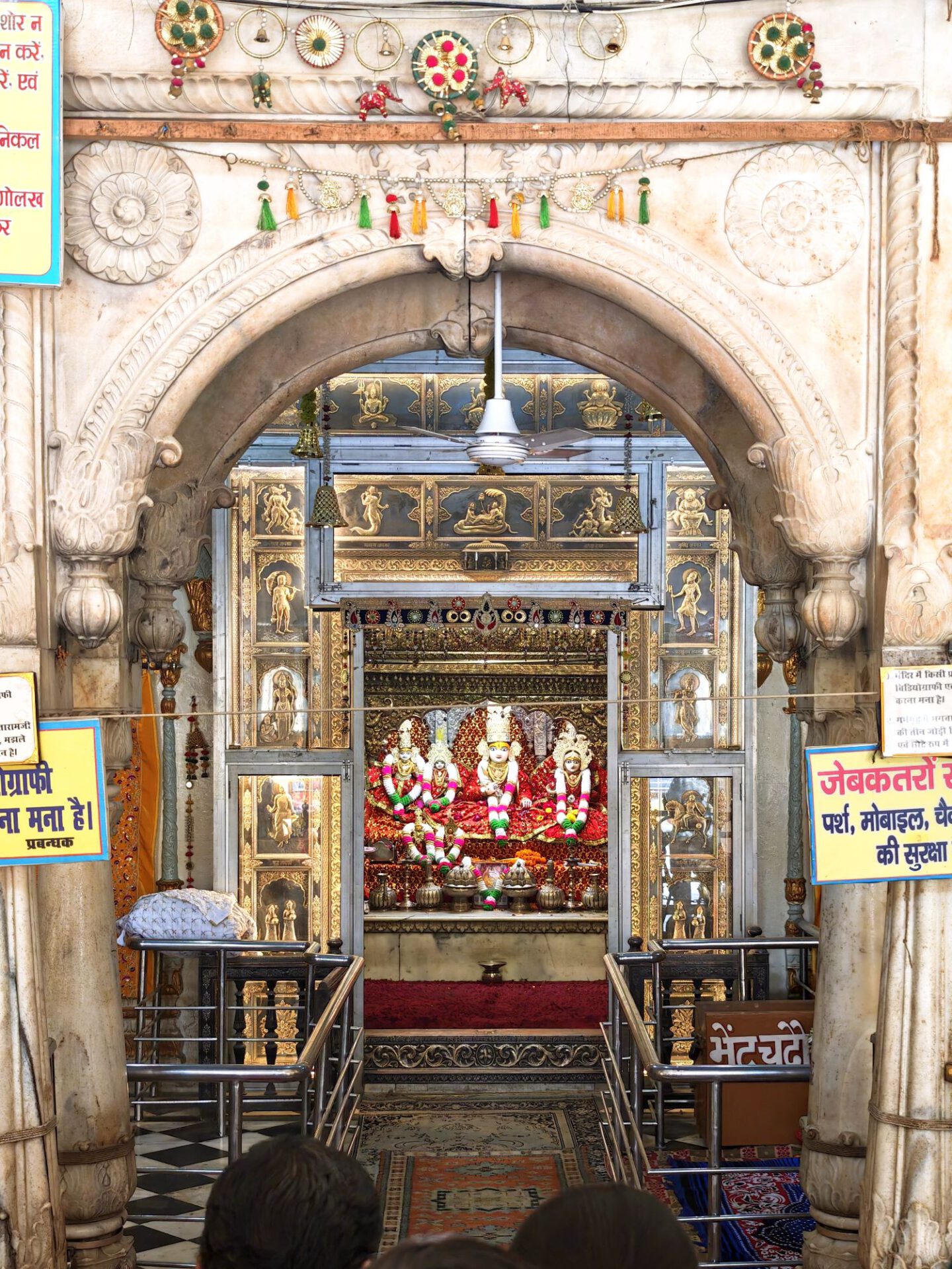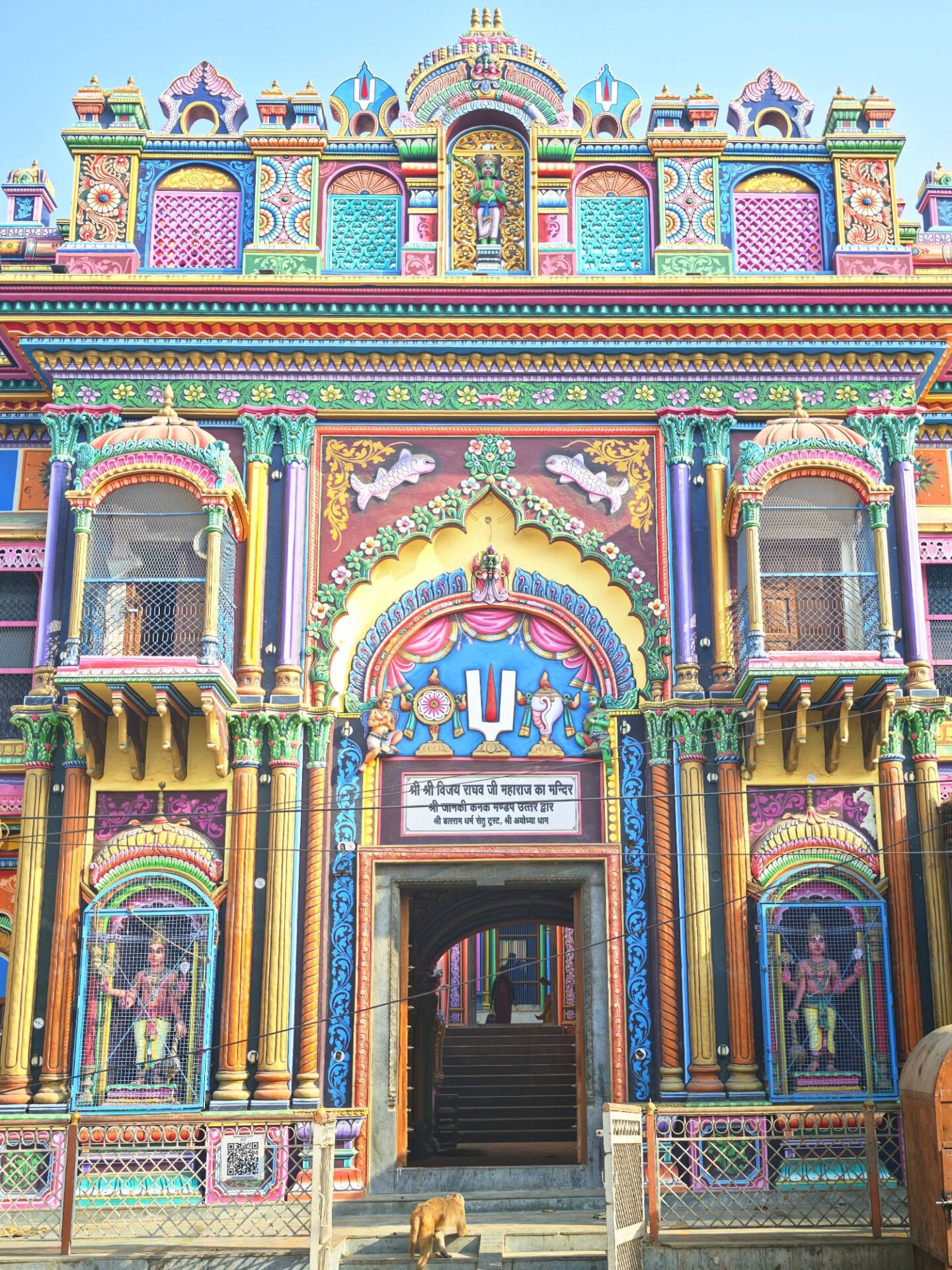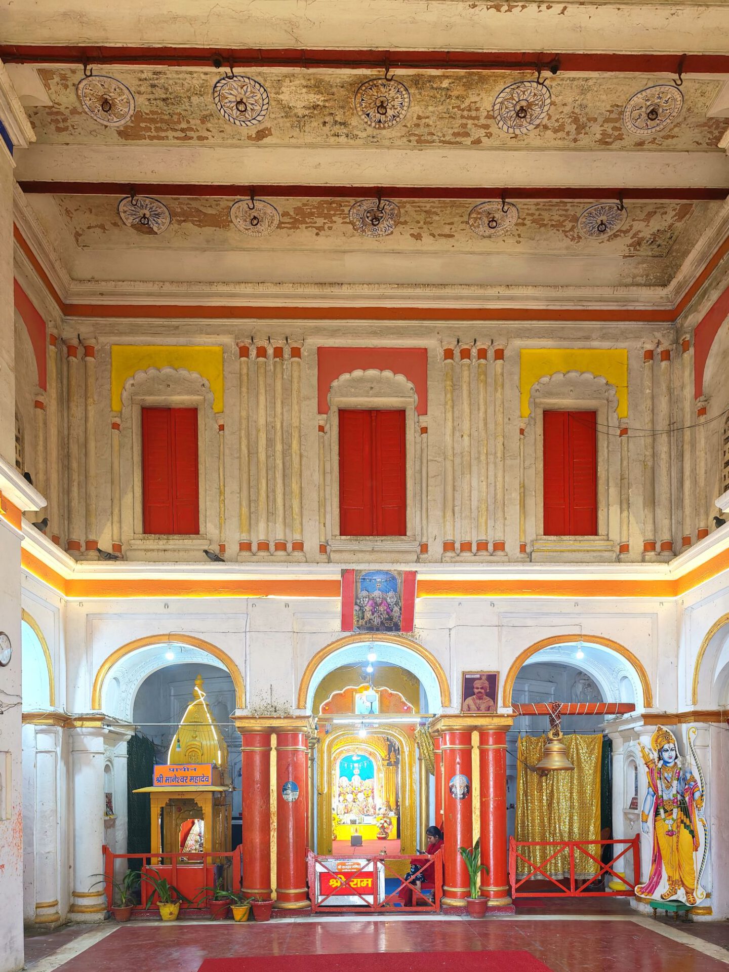 Gleich danach im Stellenwert der Pilger kommt der Hanuman Tempel aus dem 18. Jahrhundert. Kontrollen und Schleusung gibt es hier nicht, das Gedränge ist wieder brutal. Von der alten Hanuman -Skulptur bekomme ich lediglich einen Berg Blüten zu sehen. Einen schönen ruhigen Besuch habe ich hingegen am nächsten Morgen im Tempel Kanak Bhawan (Goldener Palast), einem palastartigen Bau aus dem 19. Jahrhundert, der der Legende nach auf den Palast von Lord Hanuman und Sita zurückgehen soll. Den Zugang zum traditionellen Shri Rajdwar Mandir, ebenfalls Rama geweiht, entdecke ich eher zufällig und bin dort fast allein.