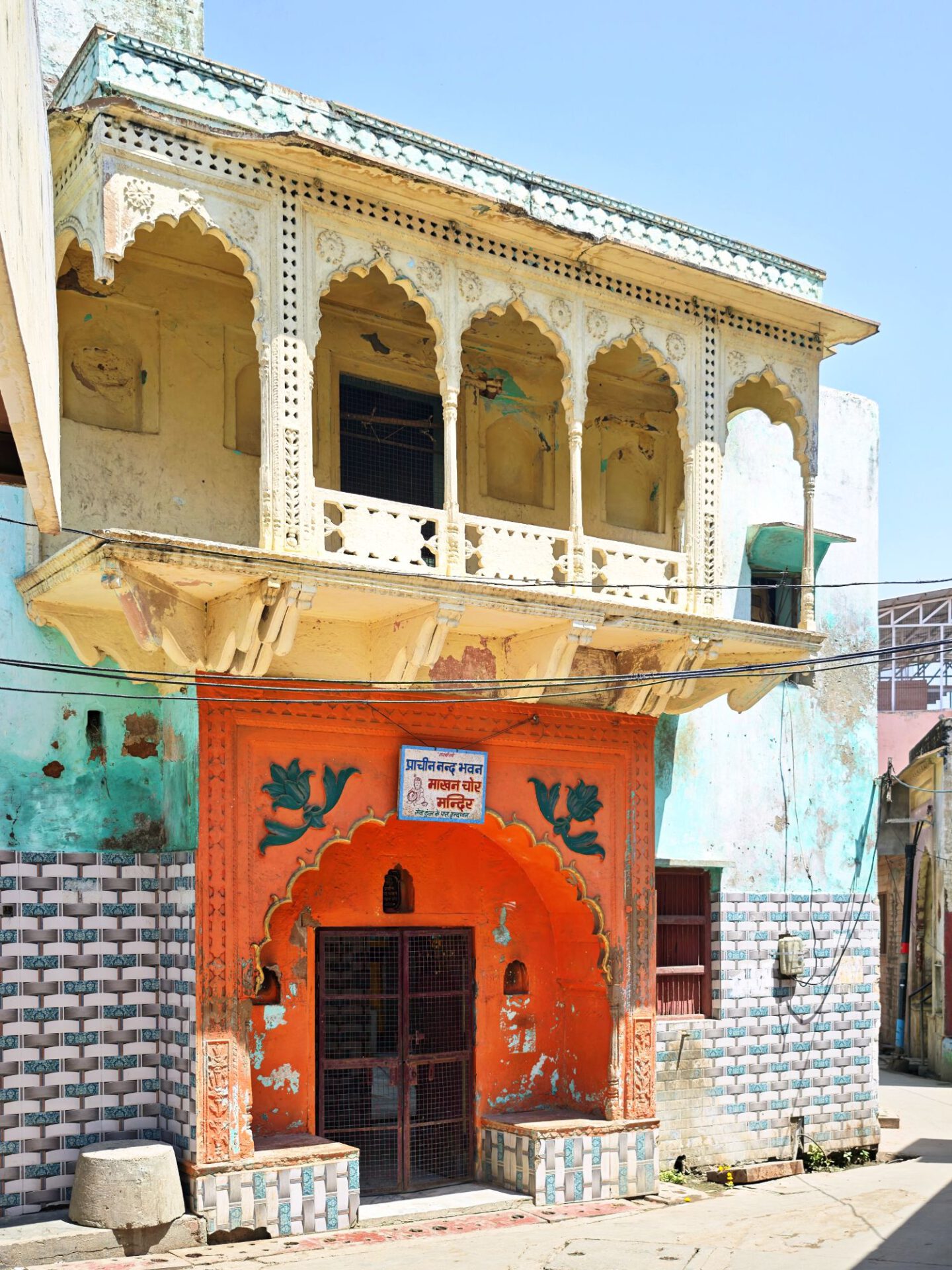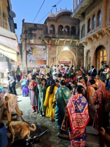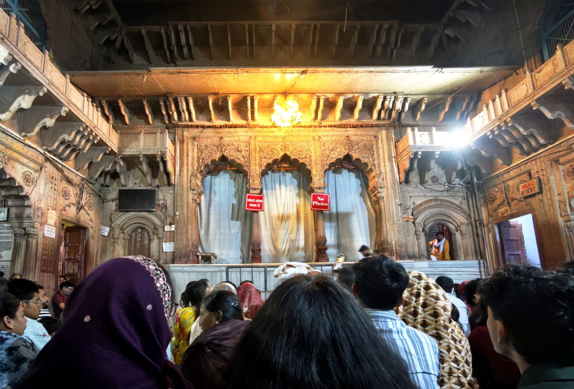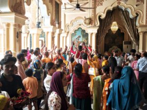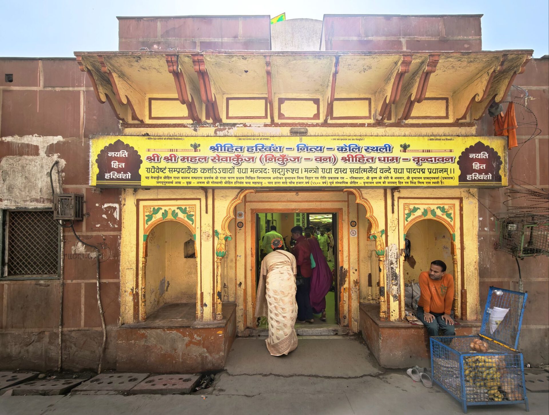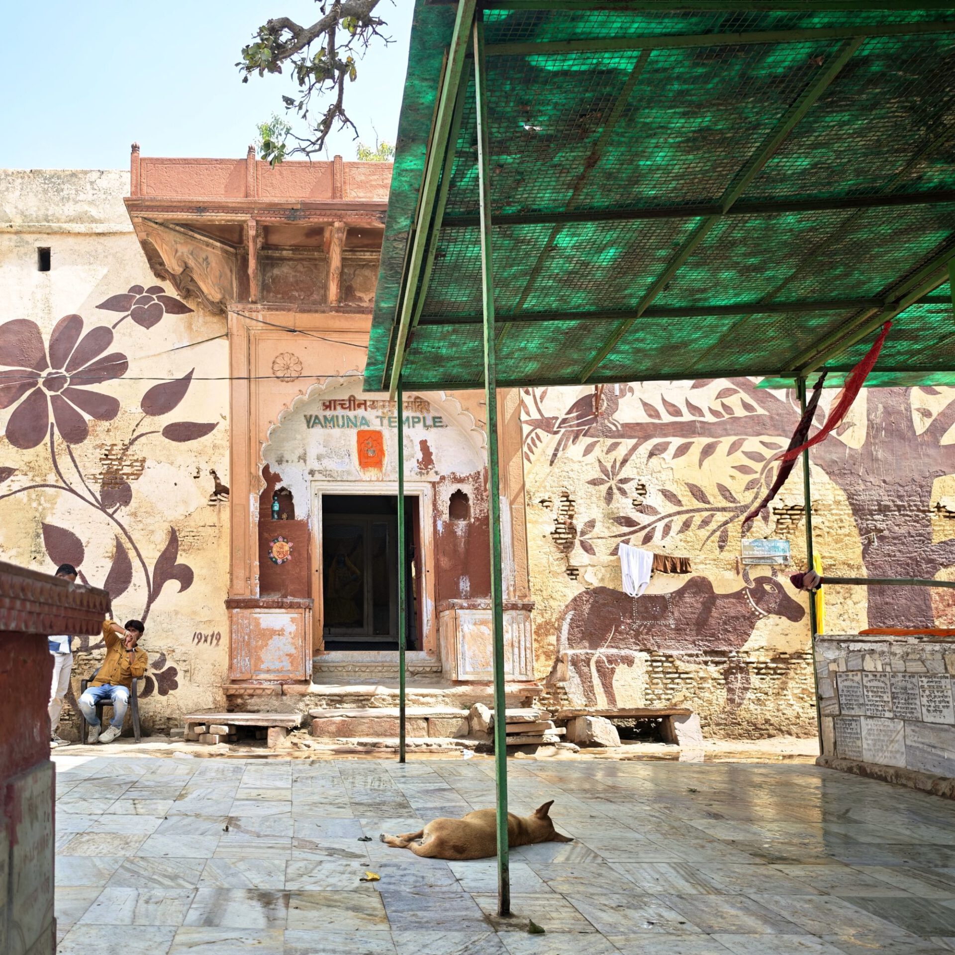 Als ich am Abend den historischen Radha Raman Tempel erreiche, wird das Haupttor gerade geschlossen. Die Menschen davor murren. Ich folge einer Gruppe die hingegen singend um das Gebäude herum geht und kann mit ihnen durch einen Nebeneingang in den Tempelinnenhof schlüpfen. Wie alle, sitze ich mit Mantras wartend auf dem Boden, weiß aber nicht worauf ich warte. Darshan: Die Skulptur der Gottheiten, Rada und Krishna, werden lebend gedacht. Sie sind (wie jetzt) hinter Vorhängen verborgen um ihre Privatsphäre zu haben oder versorgt zu werden. Nur zu bestimmten Zeiten werden die Vorhänge geöffnet. Dann entsteht Darshan, ein kurzer intensiver Moment mit Blickkontakt und Nähe. Als es soweit ist, springen die Menschen begeistert auf und drängen nach vorne. Und werden dann von den Nachströmenden zu den Seitentüren wieder hinausgedrückt. Dieser Rhythmus begegnet mir in weiteren Tempeln in Vrindavan und Mathura.