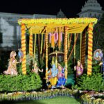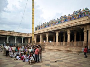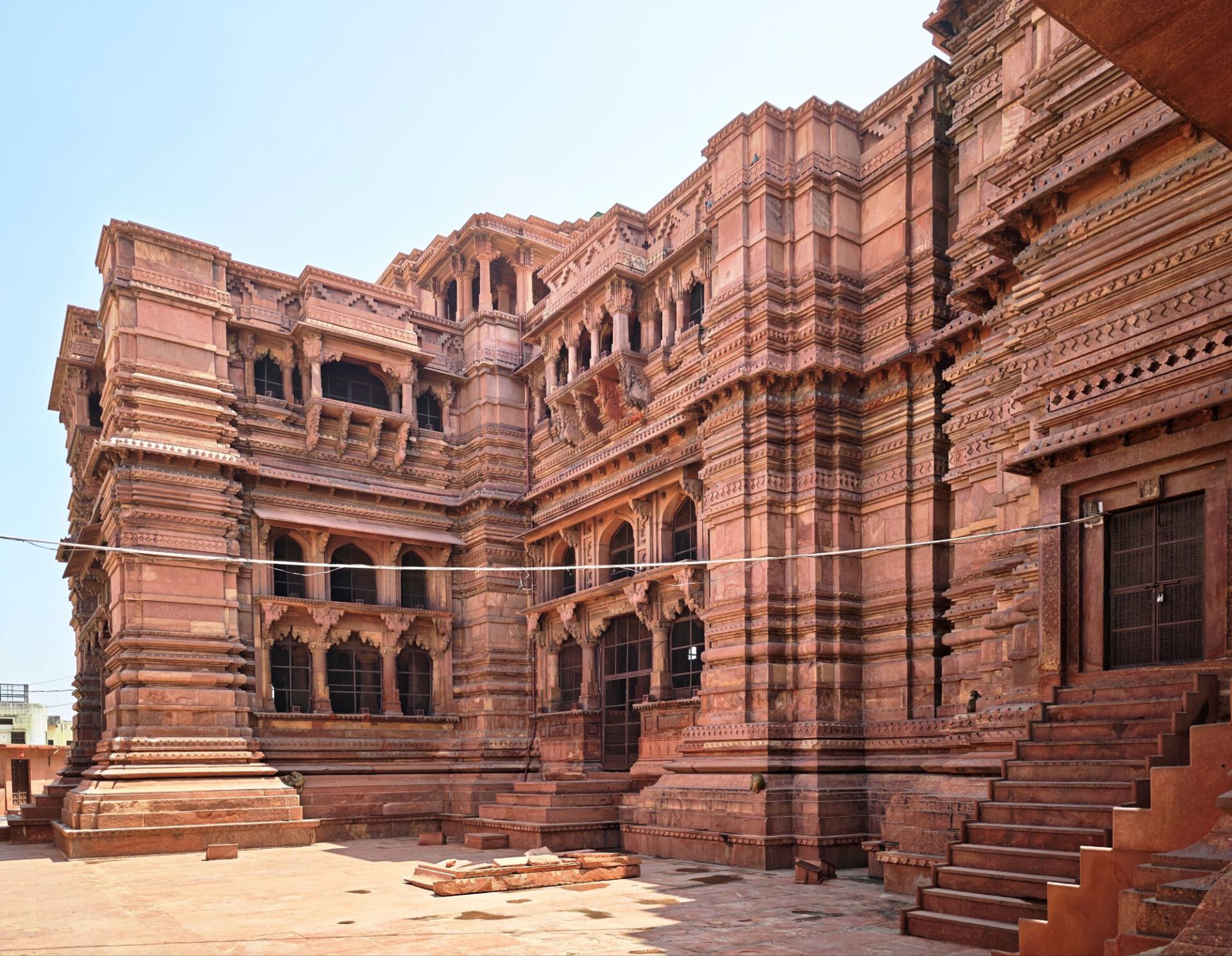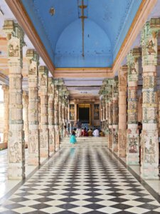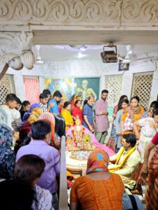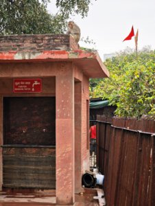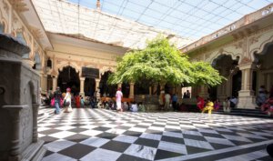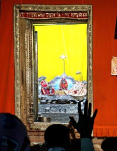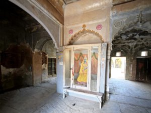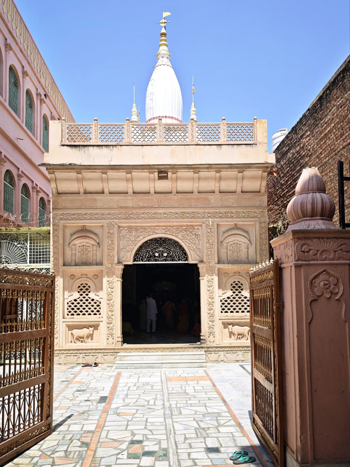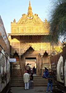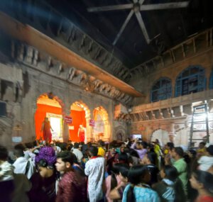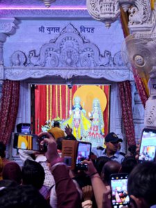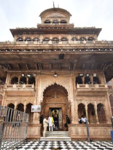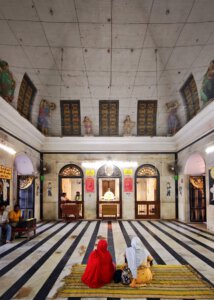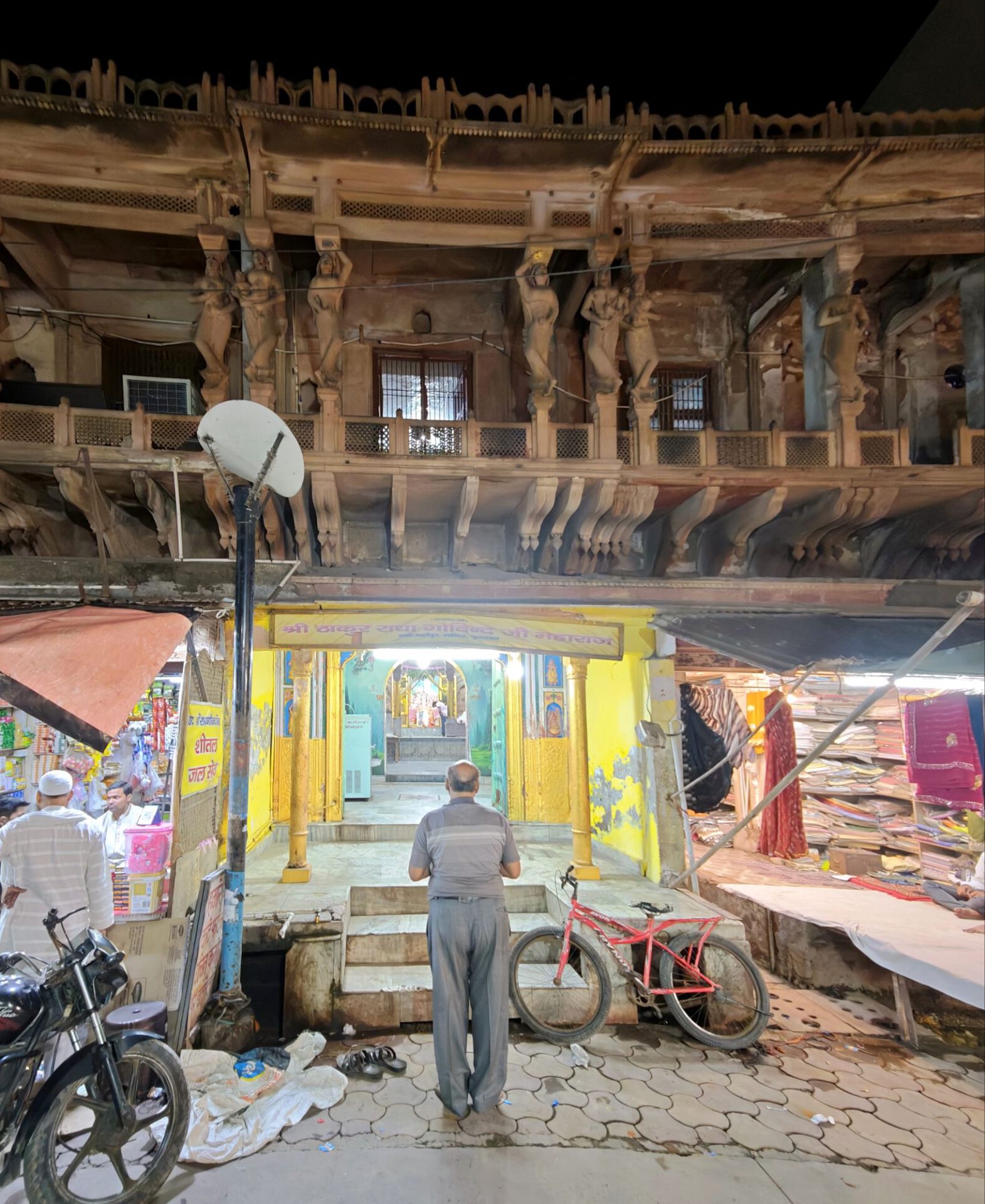 Als ich am Abend den historischen Radha Raman Tempel erreiche, wird das Haupttor gerade geschlossen. Die Menschen davor murren. Ich folge einer Gruppe die hingegen singend um das Gebäude herum geht und kann mit ihnen durch einen Nebeneingang in den Tempelinnenhof schlüpfen. Wie alle, sitze ich mit Mantras wartend auf dem Boden, weiß aber nicht worauf ich warte. Darshan: Die Skulptur der Gottheiten, Rada und Krishna, werden lebend gedacht. Sie sind (wie jetzt) hinter Vorhängen verborgen um ihre Privatsphäre zu haben oder versorgt zu werden. Nur zu bestimmten Zeiten werden die Vorhänge geöffnet. Dann entsteht Darshan, ein kurzer intensiver Moment mit Blickkontakt und Nähe. Als es soweit ist, springen die Menschen begeistert auf und drängen nach vorne. Und werden dann von den Nachströmenden zu den Seitentüren wieder hinausgedrückt. Dieser Rhythmus begegnet mir in weiteren Tempeln in Vrindavan und Mathura.