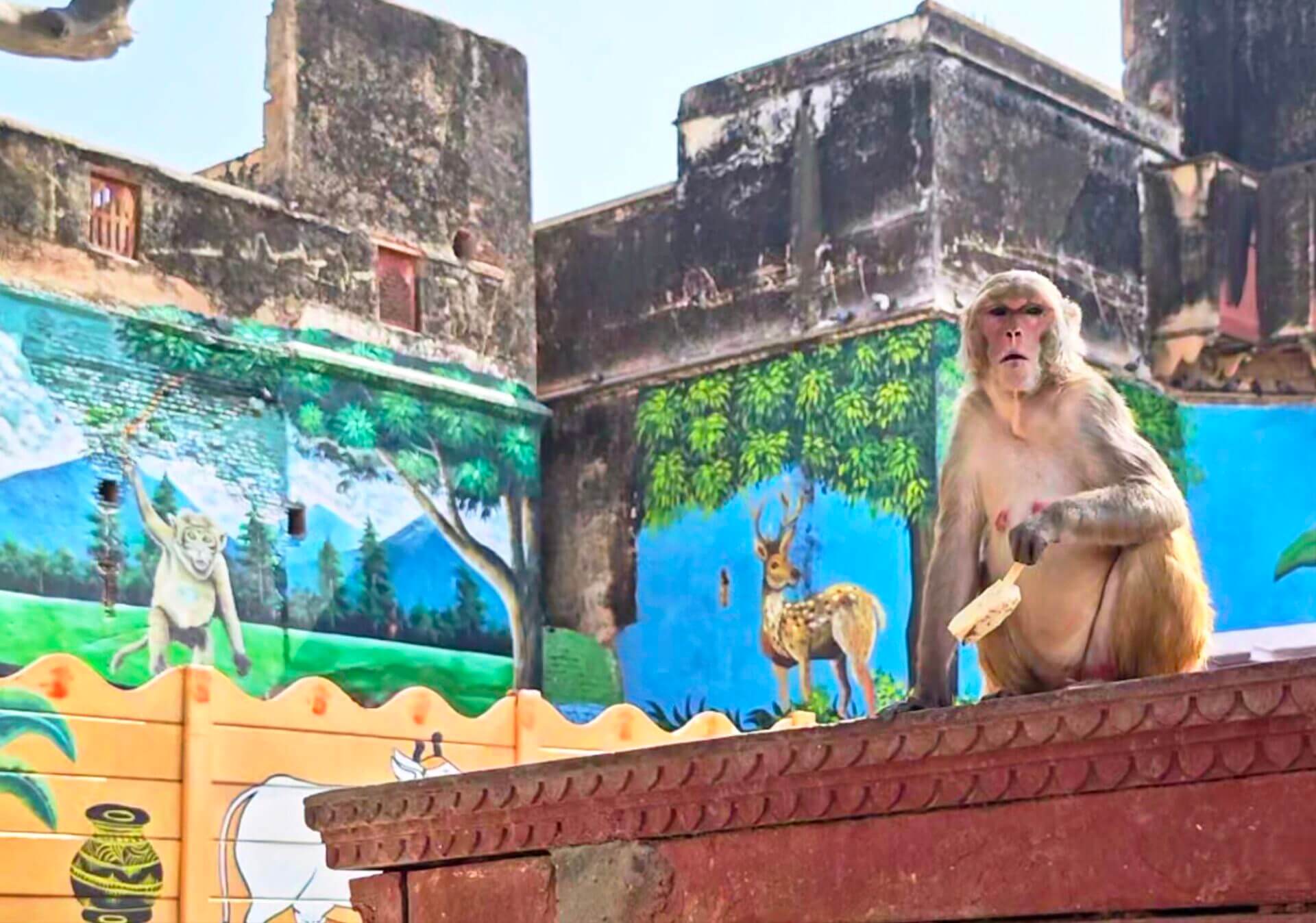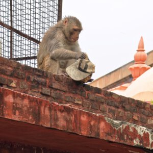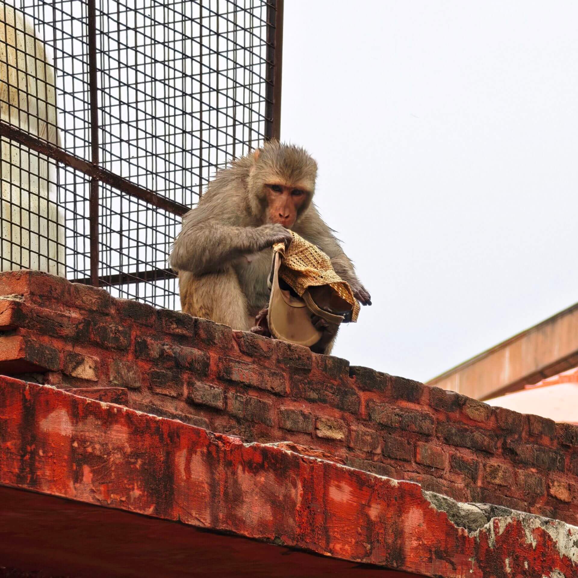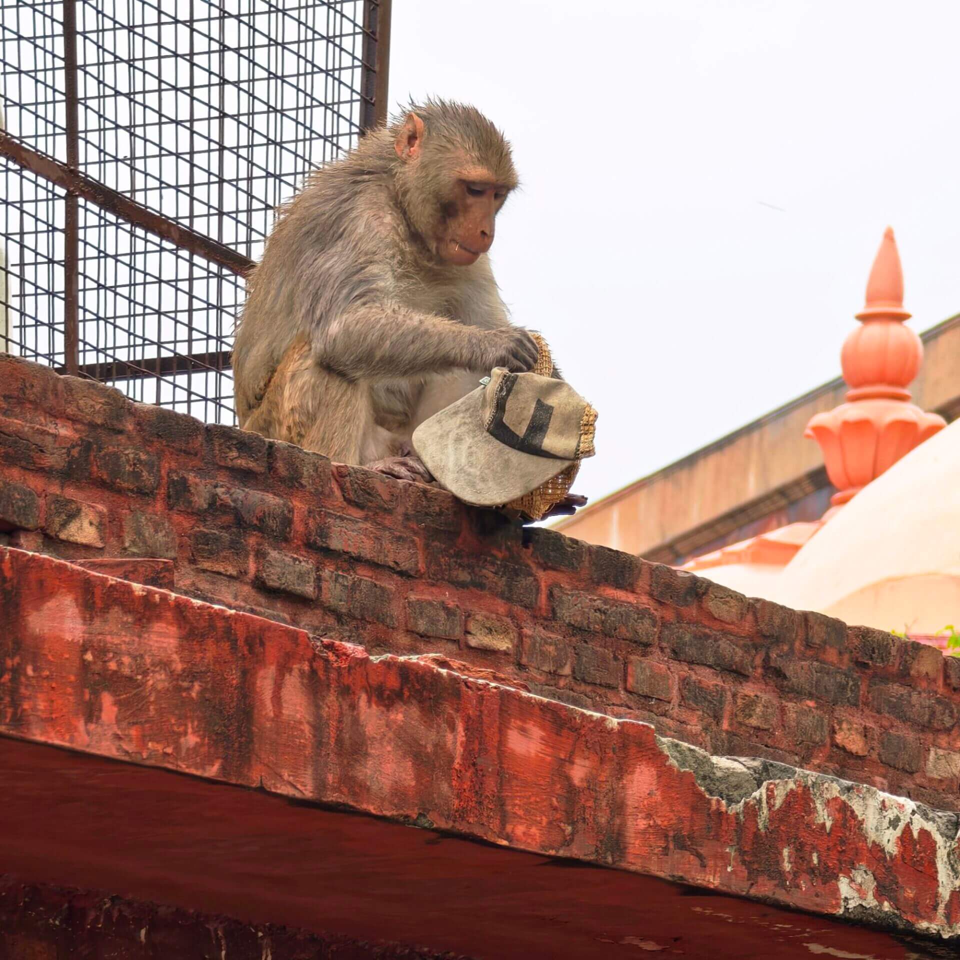 Wenn Dir ein Affe im Sprung von hinten Deine coole Reise-Basecap vom Kopf reißt hast Du keine Chance. Nach und nach erkenne ich die Gesetze von Vrindavan: Benutze keine Handtasche oder Tüte, ein Affe würde sie Dir definitiv mit Gewalt rauben. Trage keine Basecap, ein Affe würde sie Dir vom Kopf reißen. Tage keine (Sonnen-) Brille, ein Affe würde sie Dir vom Gesicht ziehen. Wenn Du Dein Handy in die Hand nimmst, sei konzentriert und halte es verdeckt mit zwei Händen, ein Affe… Und der Gruß lautet nicht Namasde sondern Hare Krishna!