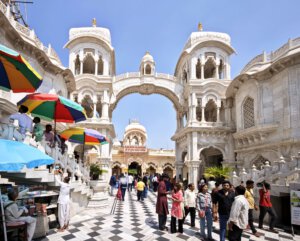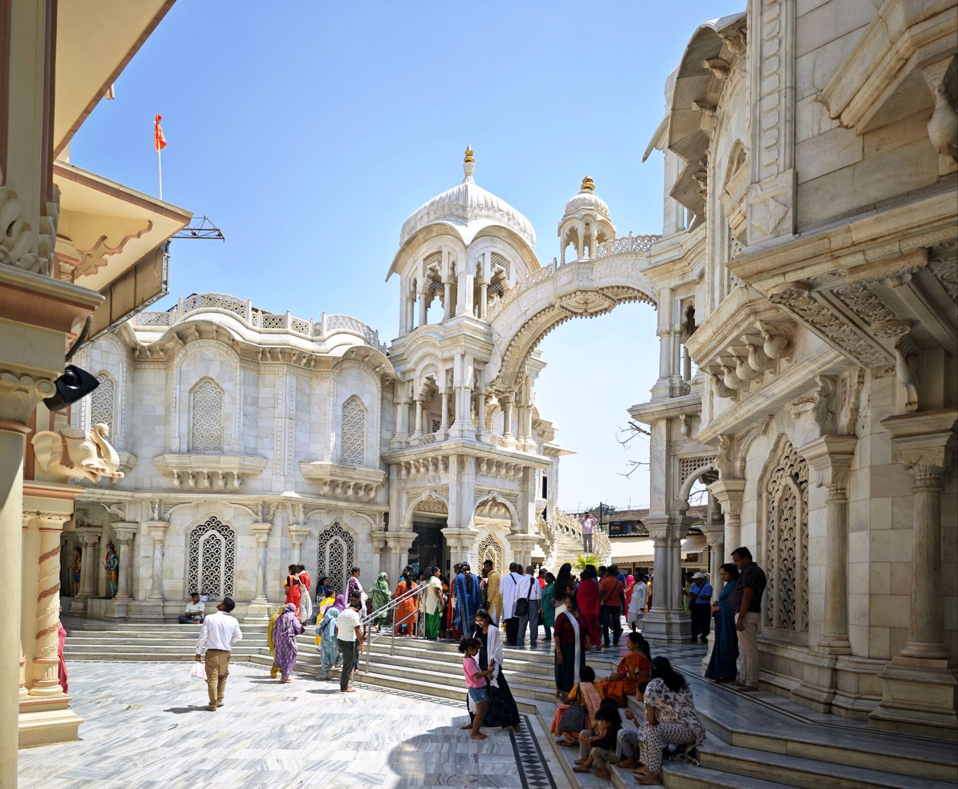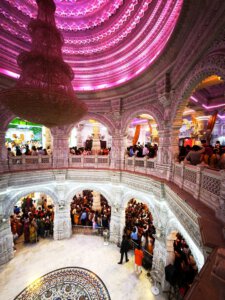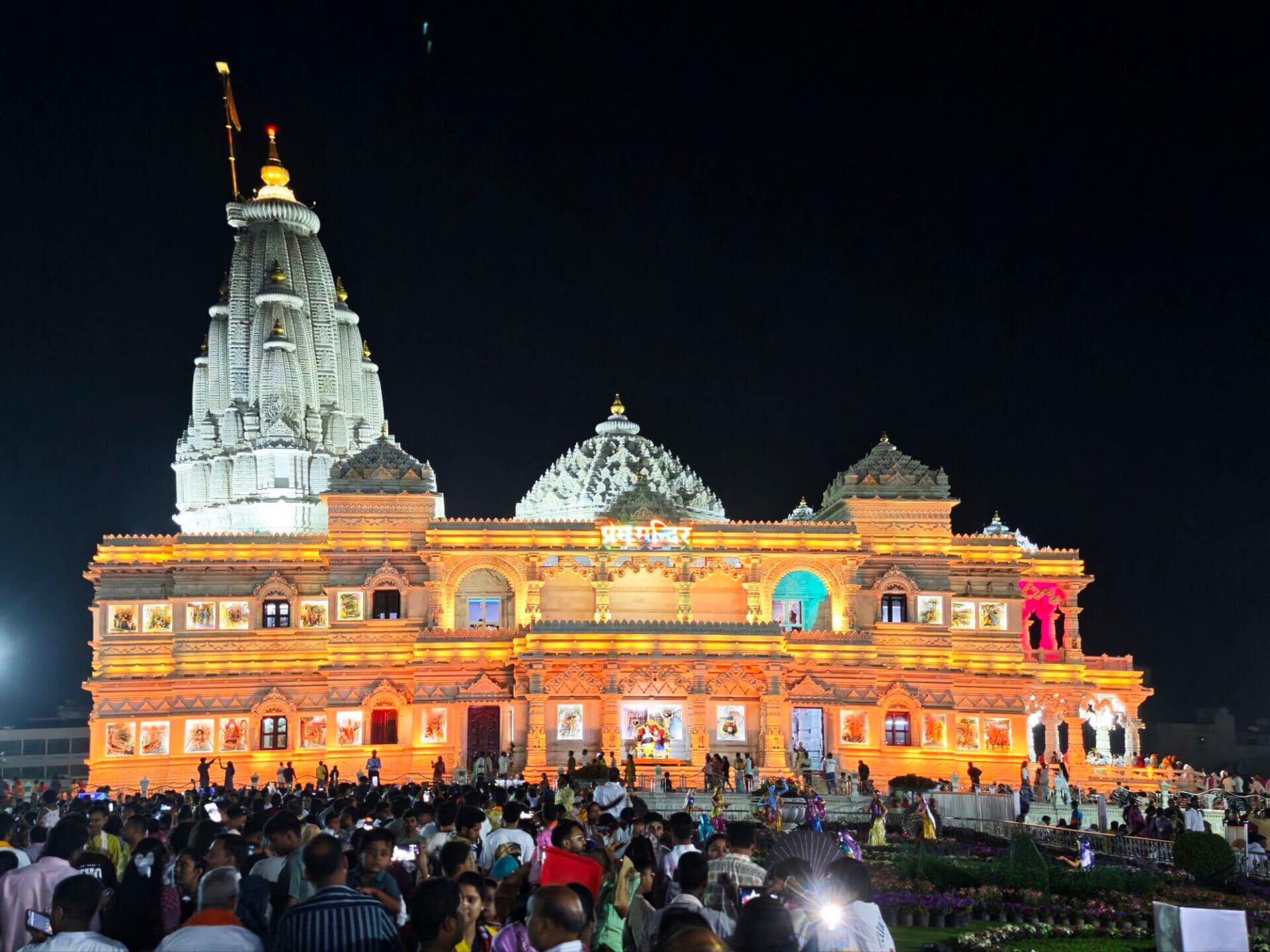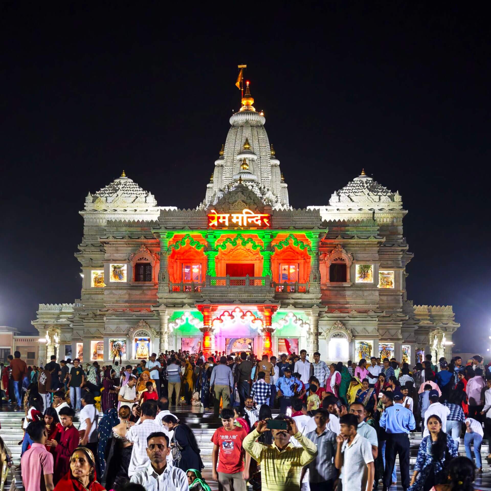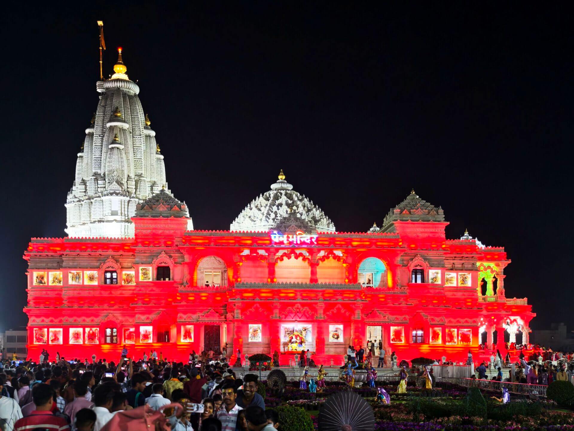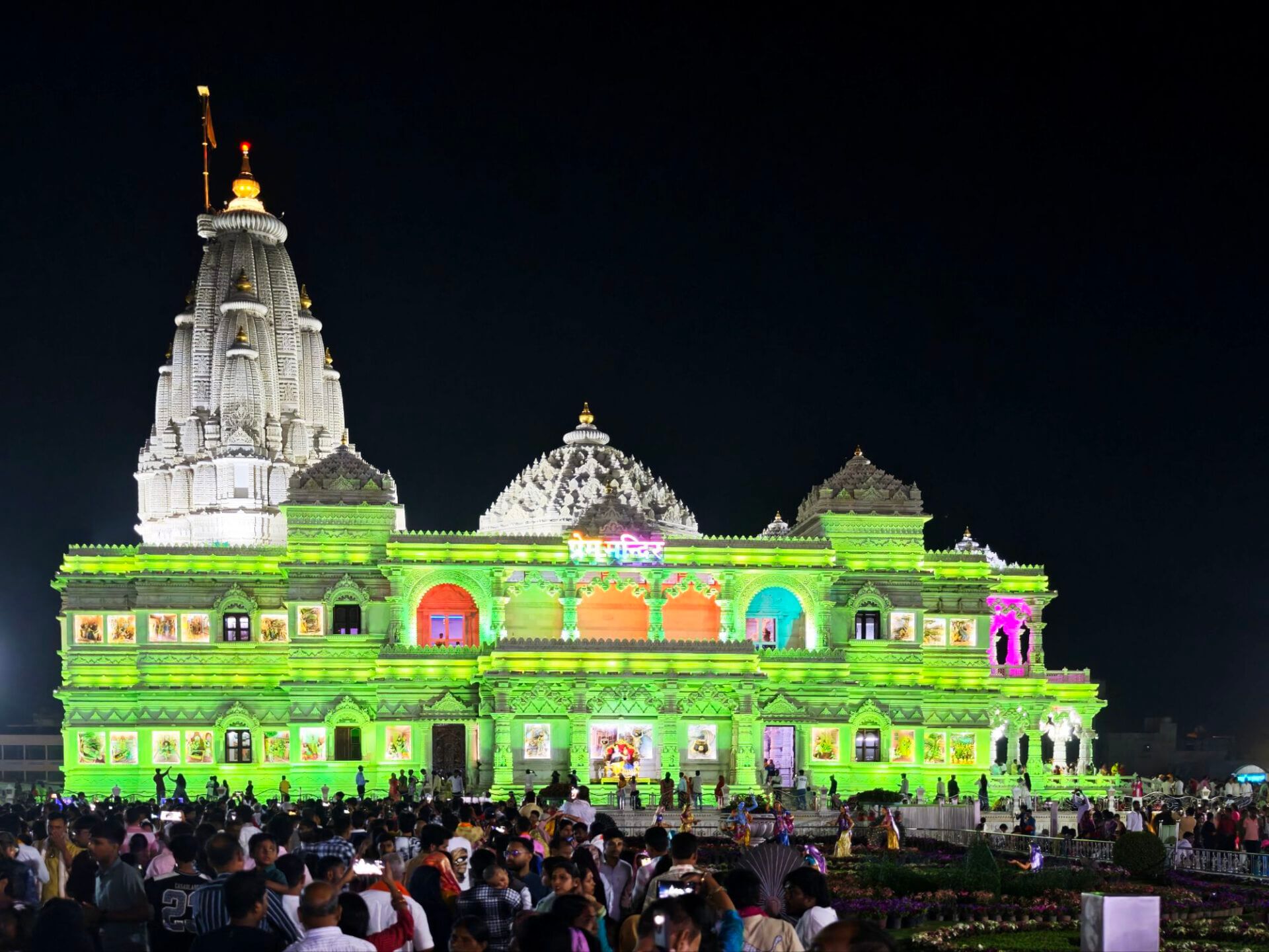 Der gigantische weiße (bzw. knallig farbenfroh beleuchtete) Prem Mandir wurde von 2001 bis 2012 als „Tempel der göttlichen Liebe“ von einer Organisation (JKP) gebaut, die sich sozial karitativ engagiert und insbesondere das Bhakti-Bewußtsein fördern will. Am Abend strömen die Massen zu den Licht- und Wasserspielen und den Darstellungen der Gottheiten auf zwei Ebenen im Tempel. Die Vorhänge mögen geöffnet werden!