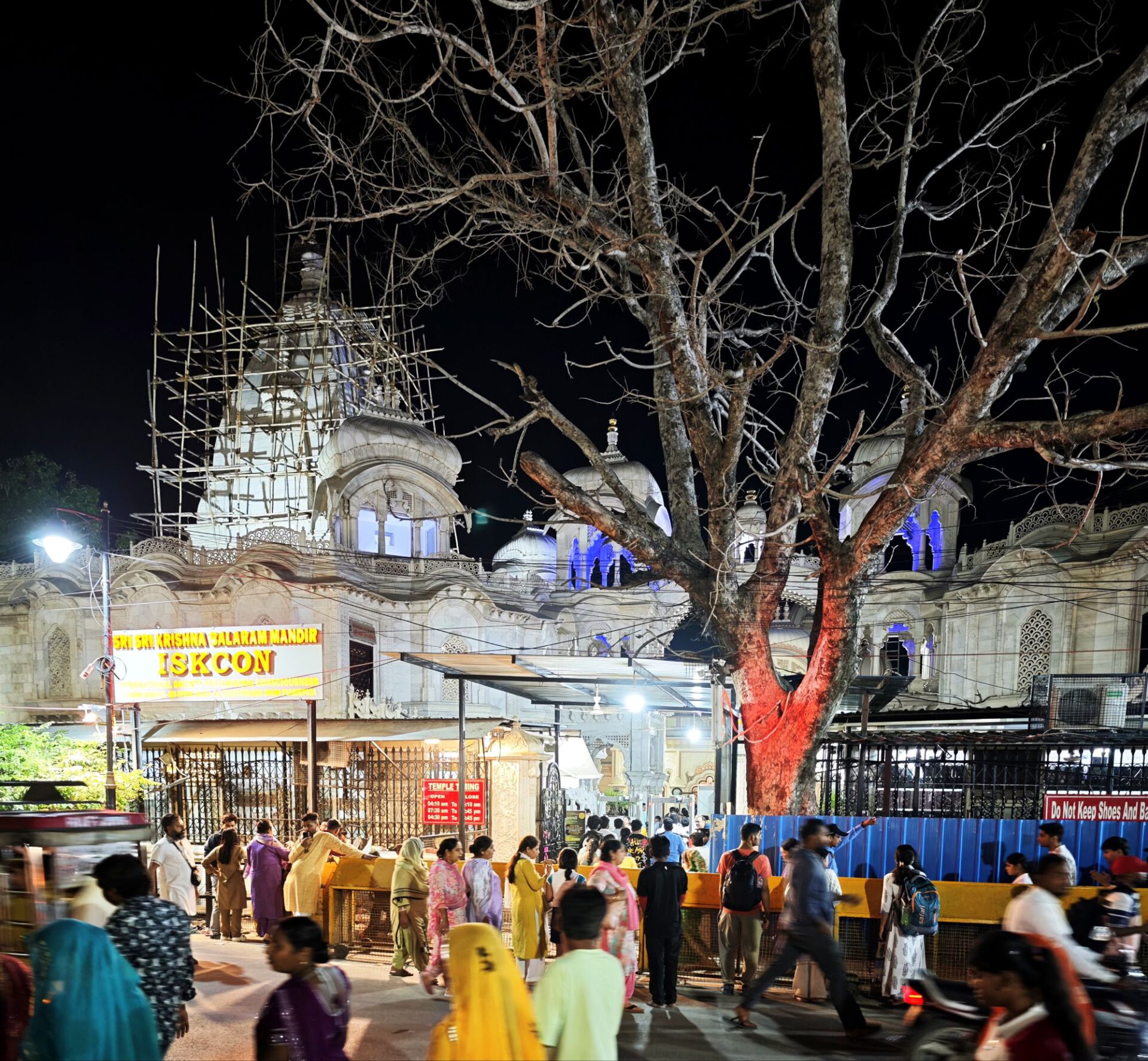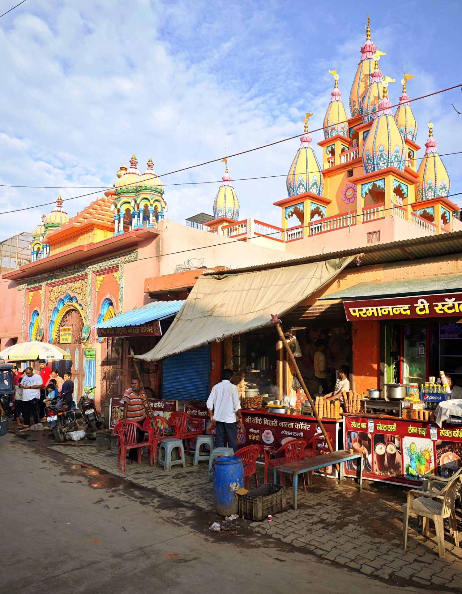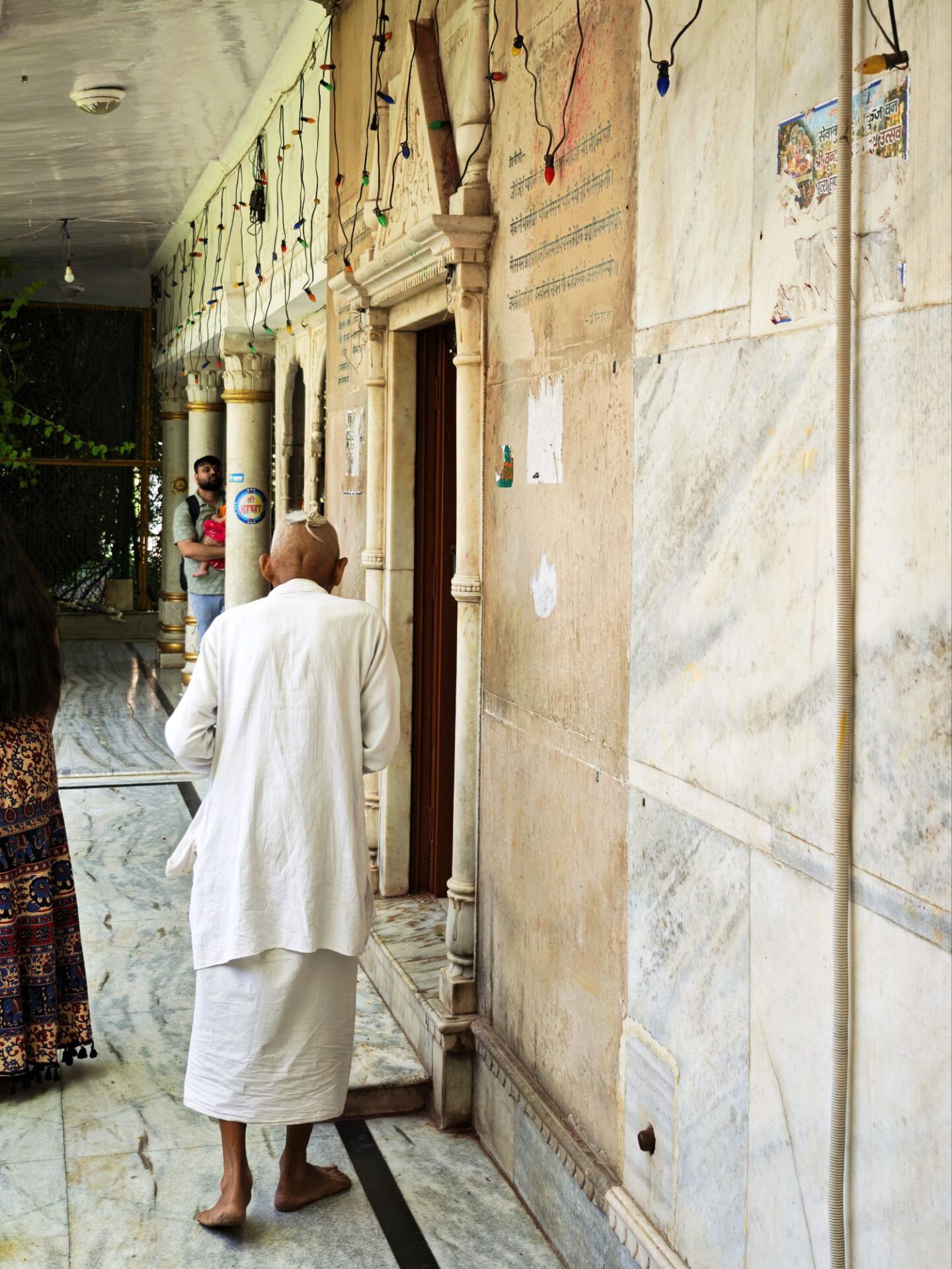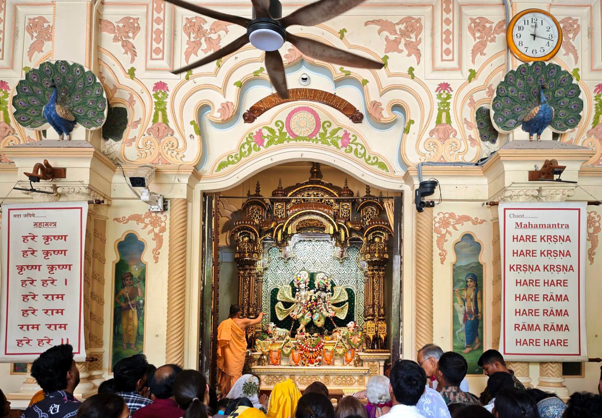 Ich habe ein schönes Zimmer im Sri Krishna Bhakti Ashram. WiFi-Passwort: harekrishna. Beim Empfang wird mir ungefragt eine Liste mit den wichtigsten Krishna-Tempeln ausgehändigt. Zwei Tage ziehe ich durch die Gassen der Innenstadt. Ich suche die Tempel die für mich spannend sind. In andere lasse ich mich einfach spontan durch das Chanten der Mantras, Arati oder die Stille hineinziehen. Vor manchen Tempeln warten so viele Menschen, dass der Rückstau mehrere Gassen blockiert. Eine ganze Stadt im Taumel der Krishna-Verehrung. Bzw. Bhakti: Der liebenden Hingabe an die Gottheit.