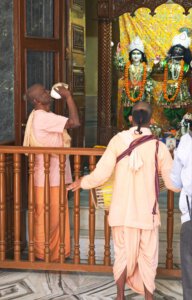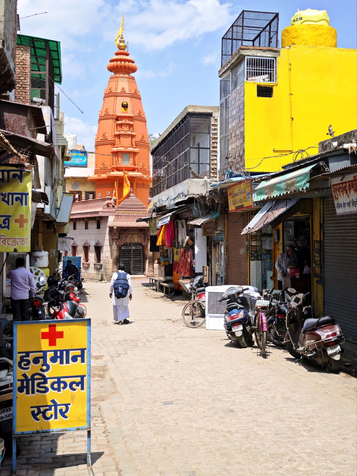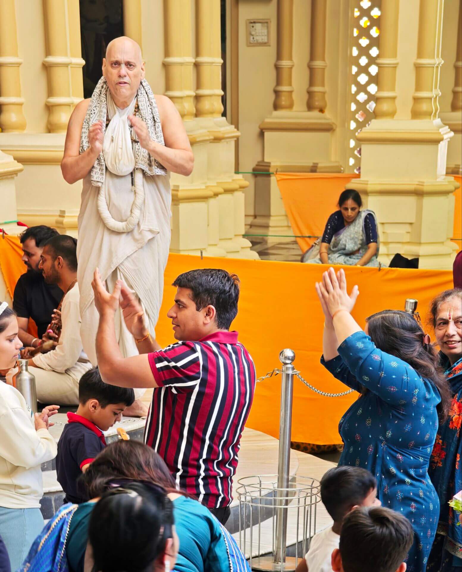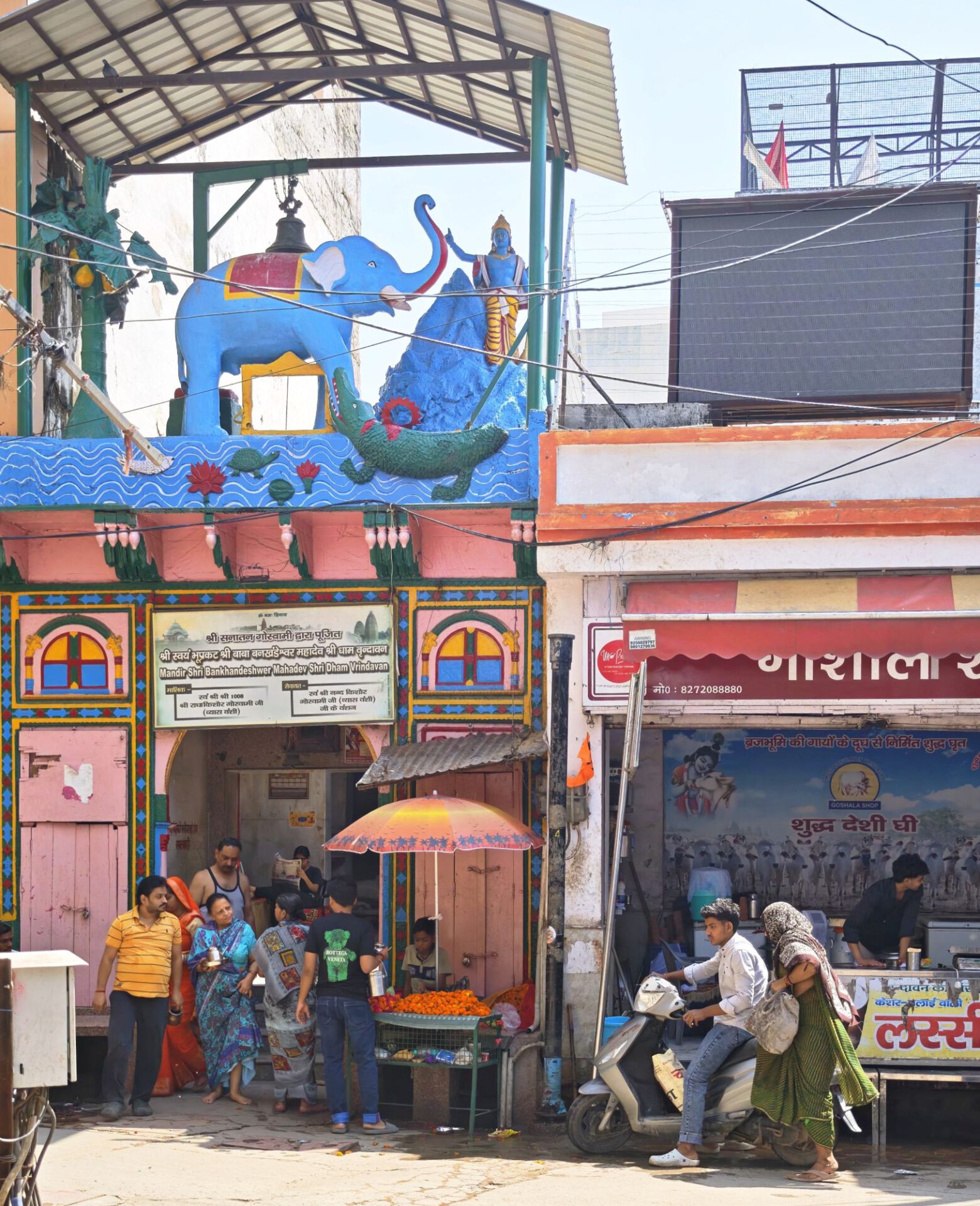Ich habe ein schönes Zimmer im Sri Krishna Bhakti Ashram. WiFi-Passwort: harekrishna. Beim Empfang wird mir ungefragt eine Liste mit den wichtigsten Krishna-Tempeln ausgehändigt. Zwei Tage ziehe ich durch die Gassen der Innenstadt. Ich suche die Tempel die für mich spannend sind. In andere lasse ich mich einfach spontan durch das Chanten der Mantras, Arati oder die Stille hineinziehen. Vor manchen Tempeln warten so viele Menschen, dass der Rückstau mehrere Gassen blockiert. Eine ganze Stadt im Taumel der Krishna-Verehrung. Bzw. Bhakti: Der liebenden Hingabe an die Gottheit.