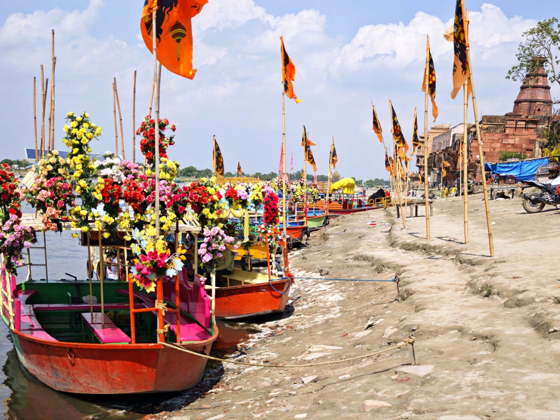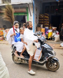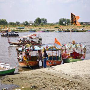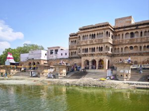 Wie Mathura und Agra, liegt Vrindavan am heiligen Fluß Yamuna, zu deren exakter Mündung in den Ganges ich vor sieben Wochen in Prayagraj mit dem Boot gebracht wurde (ohne das Boot dort verlassen zu haben). Die Ghats liegen in der prallen Sonne aber Bootsfahrten sind auch hier beliebt. Und natürlich ein Untertauchen im heiligen Fluß, hier wo auch Rada und Krishna gebadet haben.